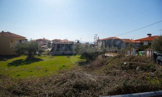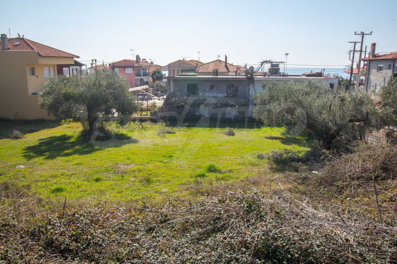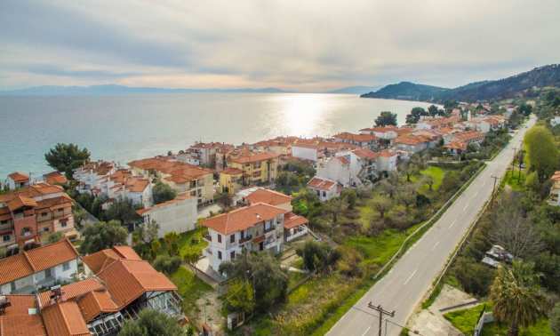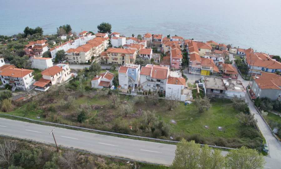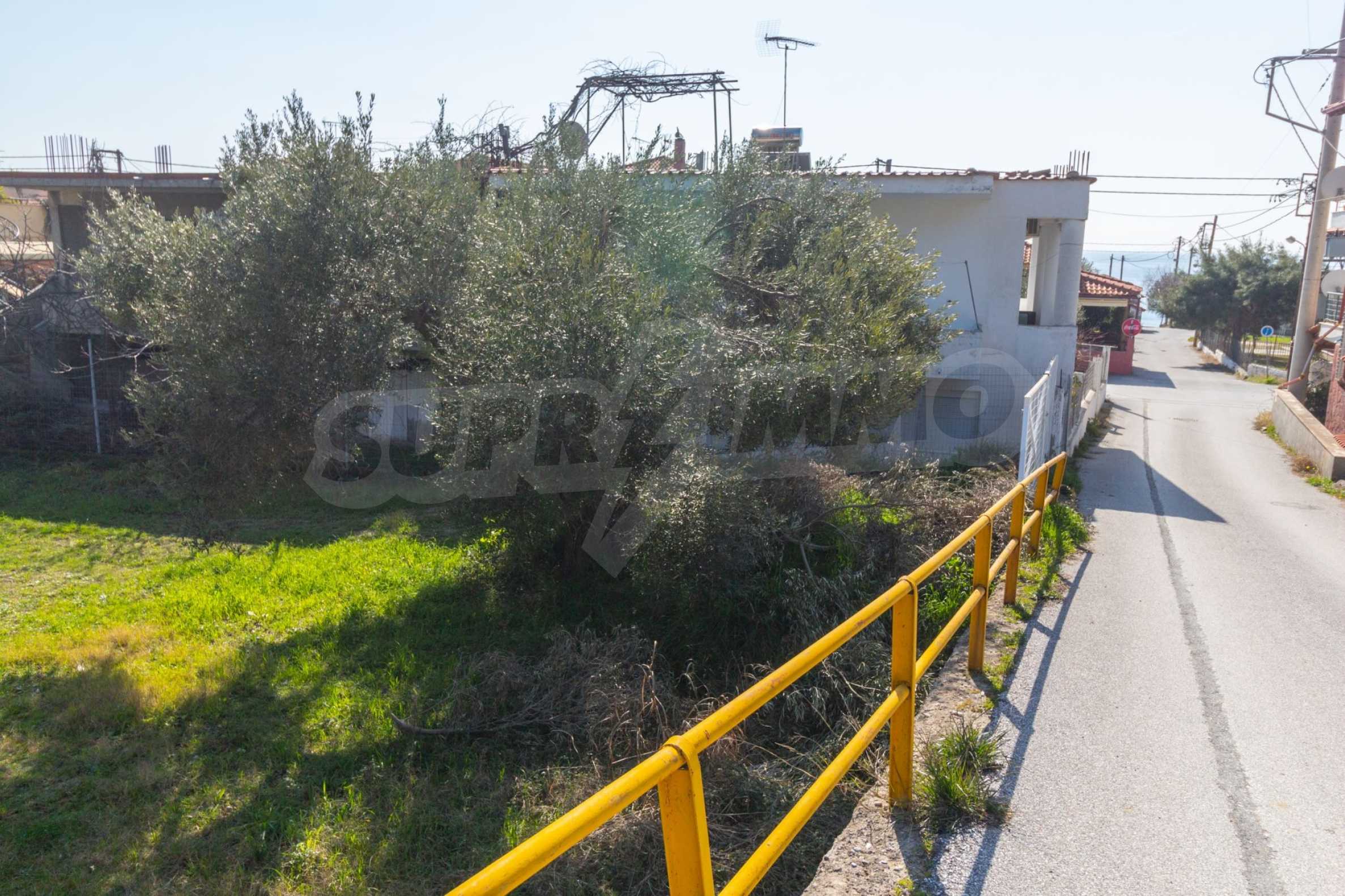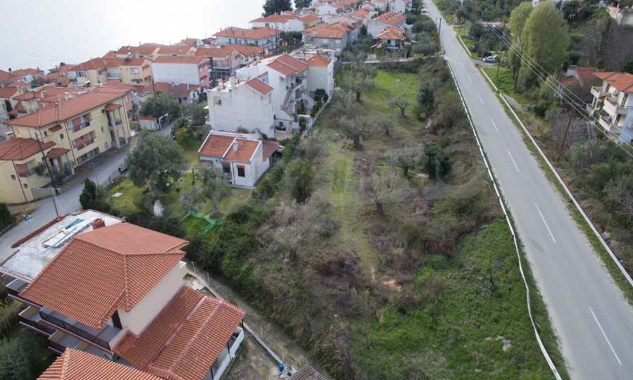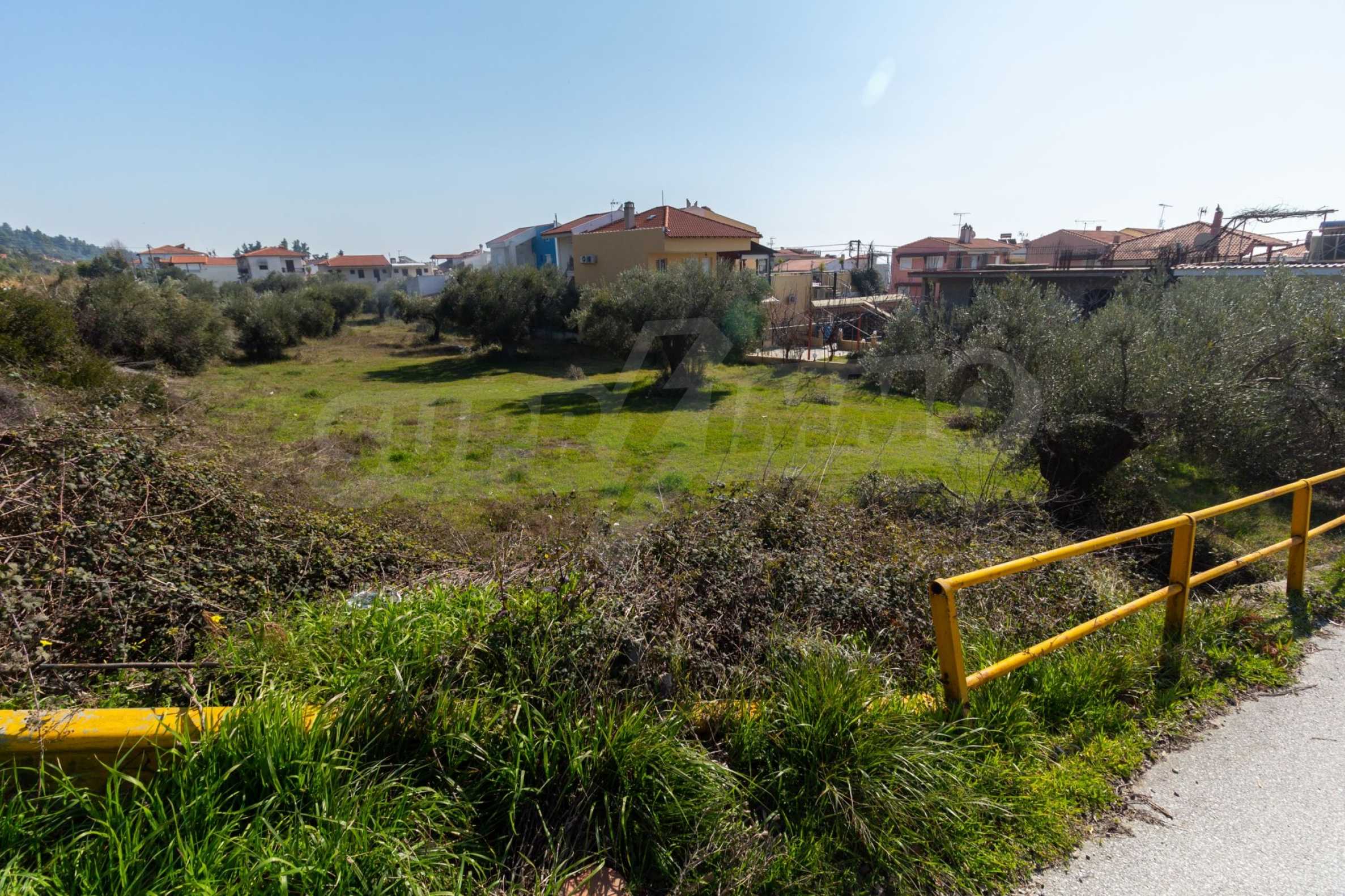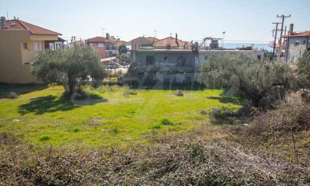 Ъглов парцел, 880 кв.м, в Касандра, Халкидики с безпрепятствен постоянен изглед и с източна ориентация. Ограденият имот е само на 130 м. от плажа и с лице към главния път. Парцелът, който има маслинови дървета, е завършен и застроим (може да се построи 400 кв.м).