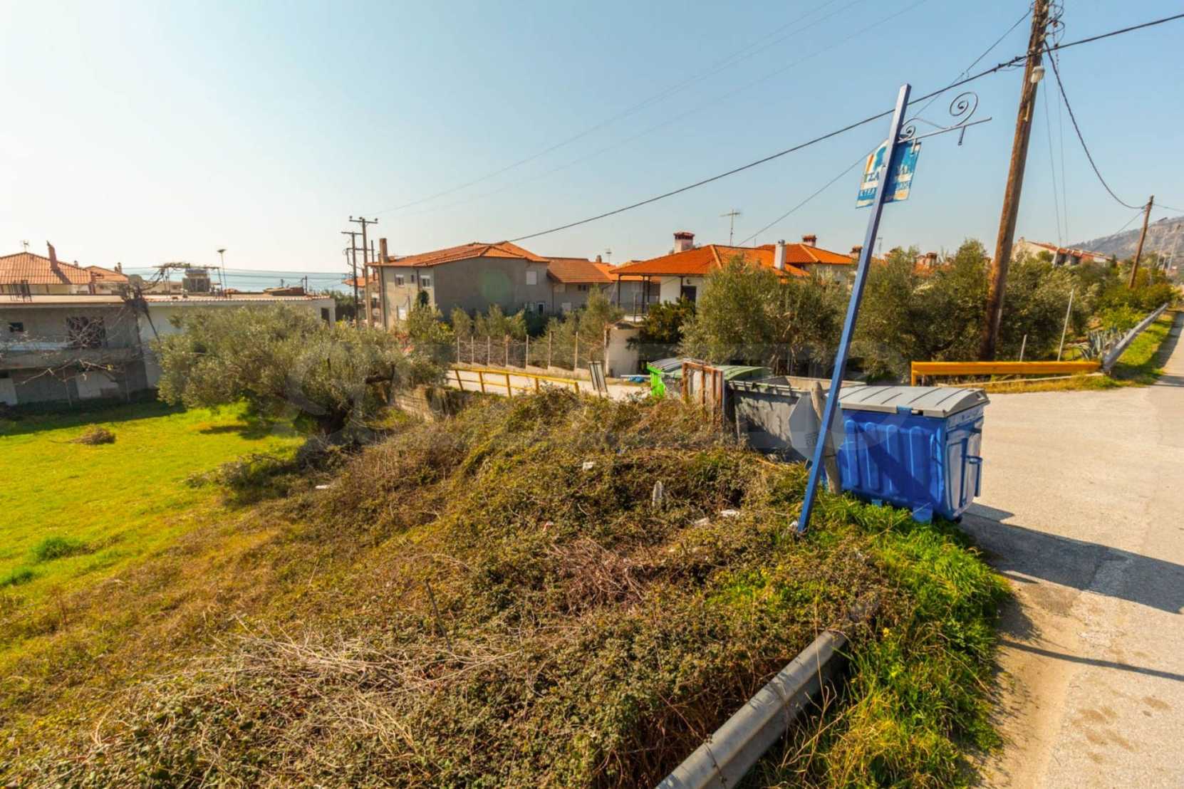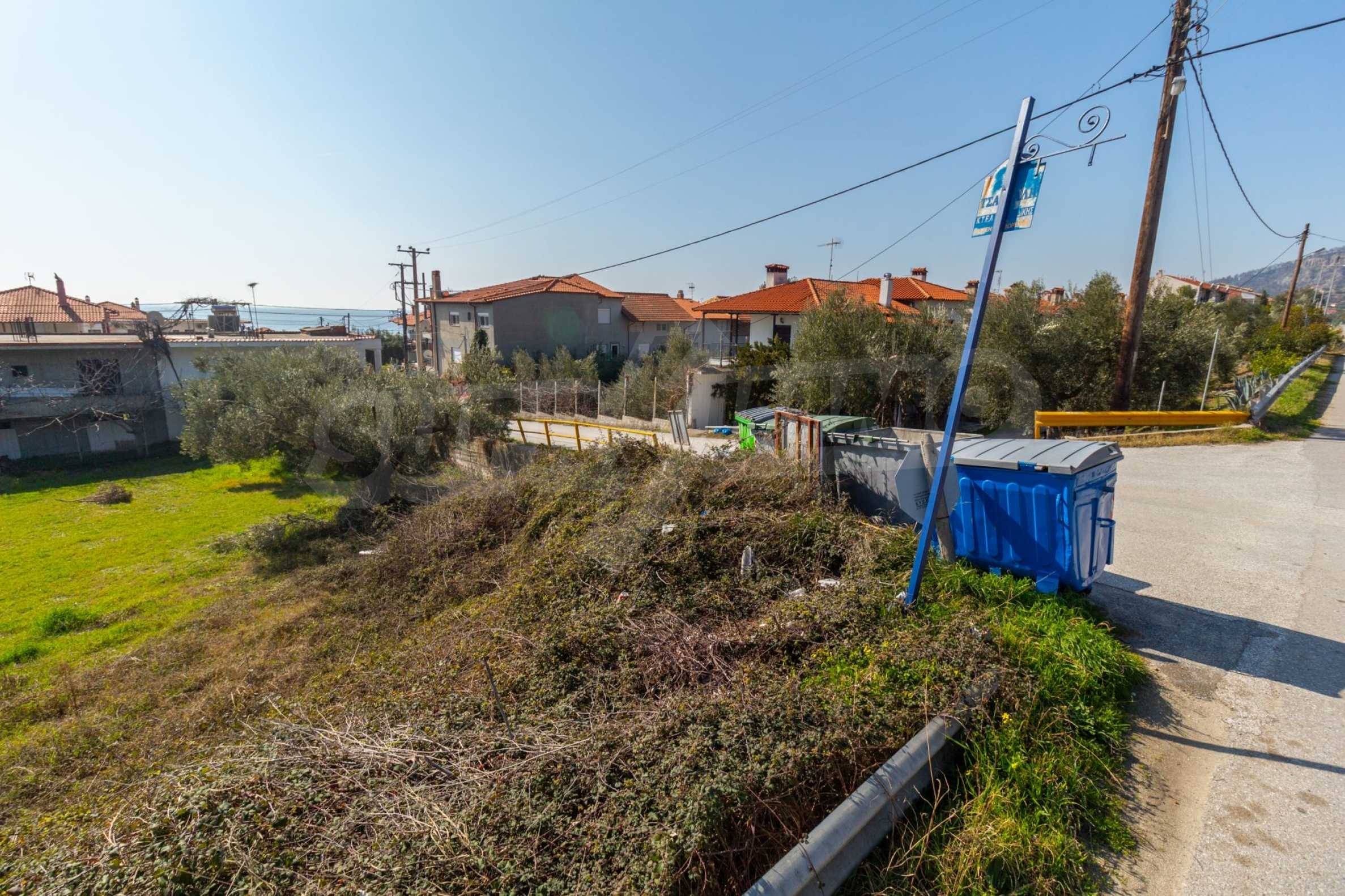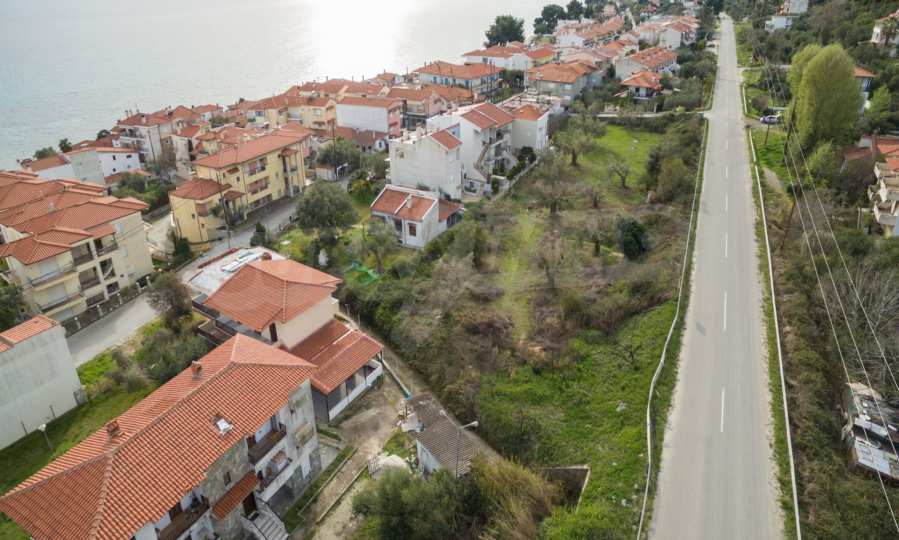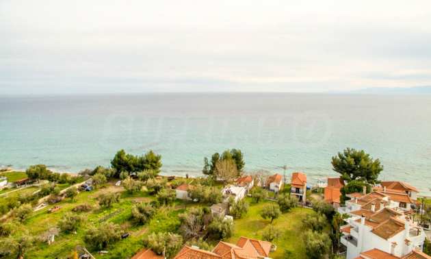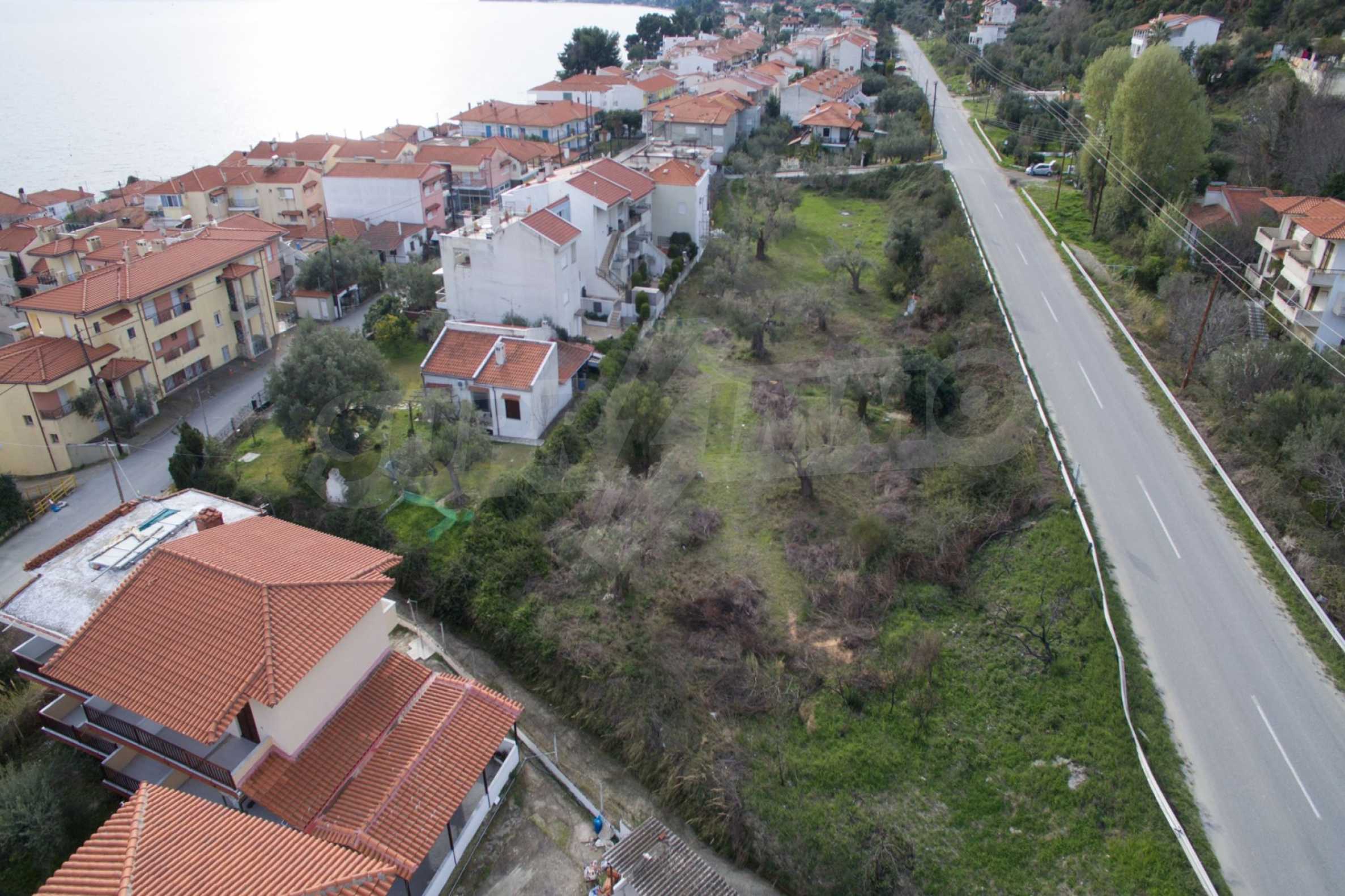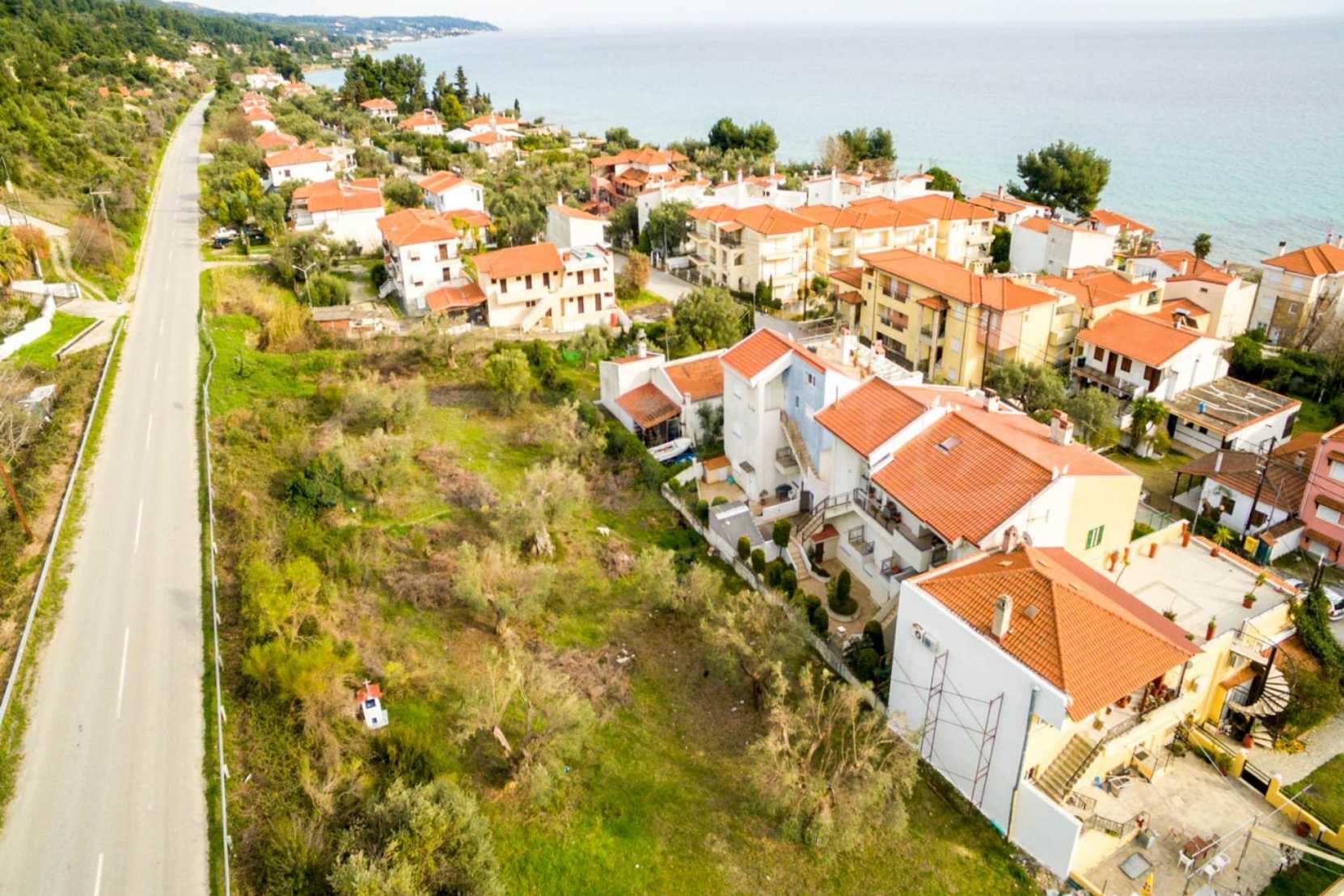 Ъглов парцел, 880 кв.м, в Касандра, Халкидики с безпрепятствен постоянен изглед и с източна ориентация. Ограденият имот е само на 130 м. от плажа и с лице към главния път. Парцелът, който има маслинови дървета, е завършен и застроим (може да се построи 400 кв.м).