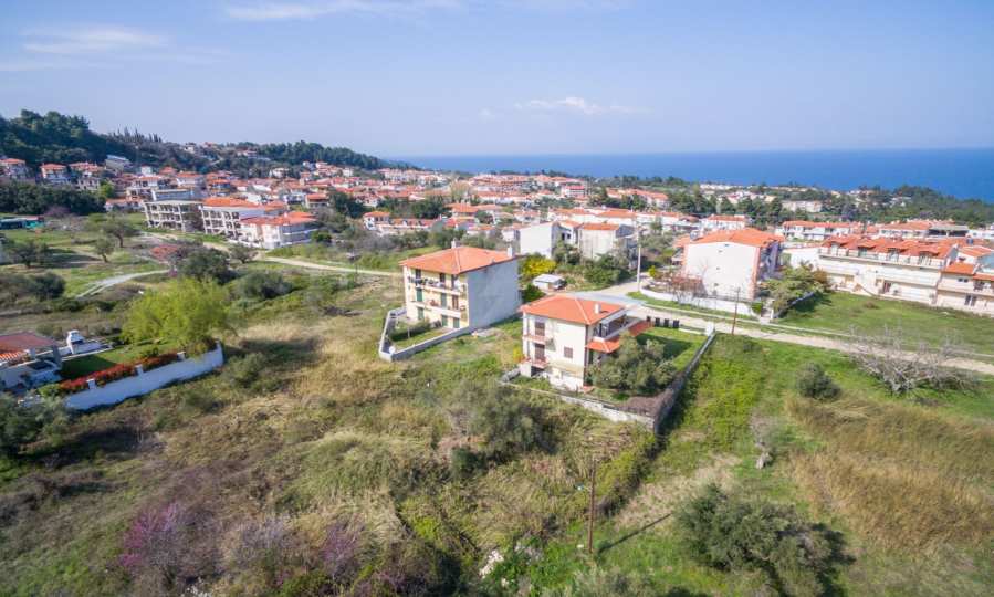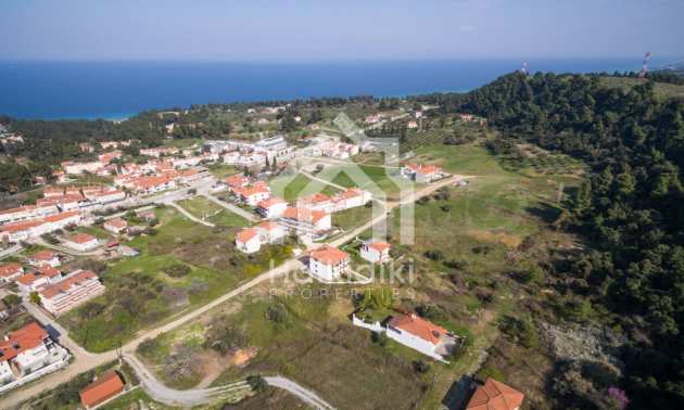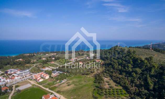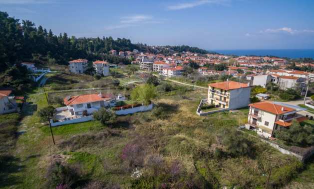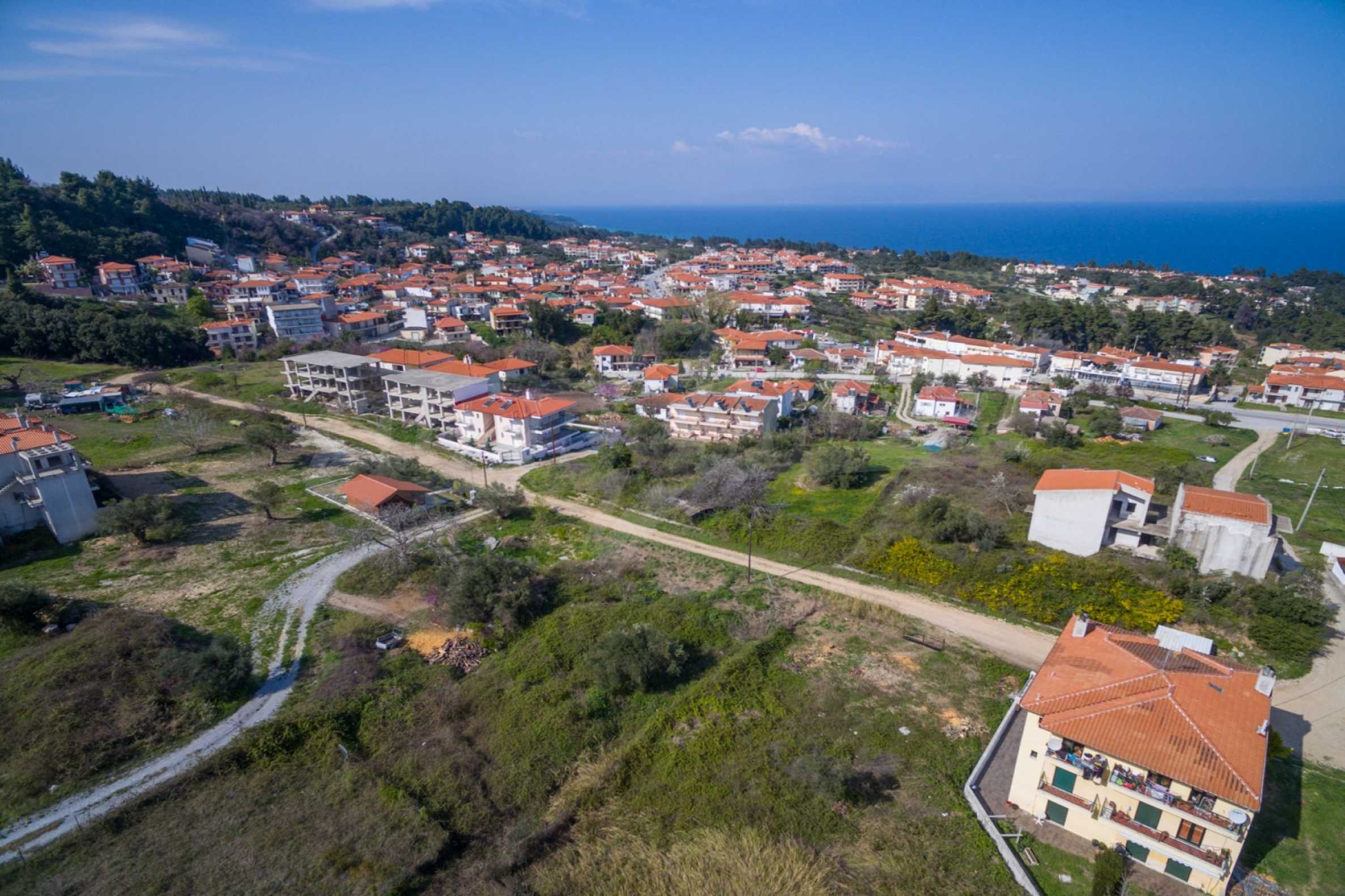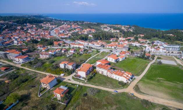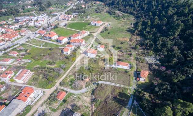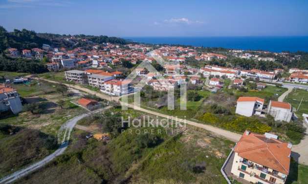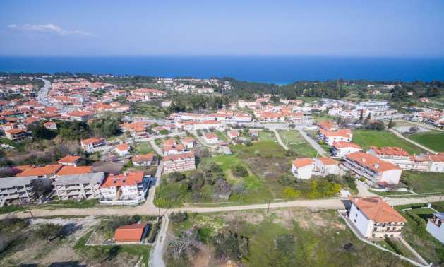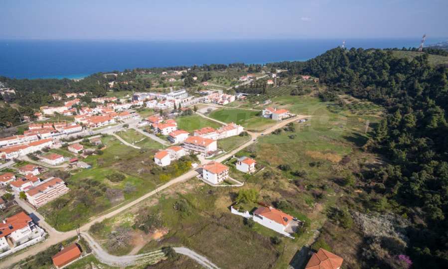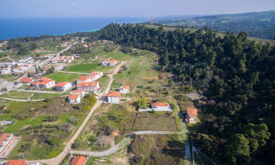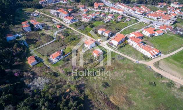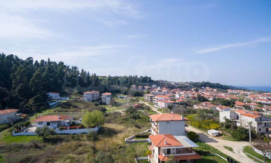 Наклонен парцел, 354 кв.м, в Касандра, Халкидики с безпрепятствен постоянен изглед и с източна ориентация. Имотът е на 600 м. от центъра на селото. Ограденият парцел е завършен, застроим и коефициентът му на застрояване е 0,6 (може да се построи 212 кв.м).