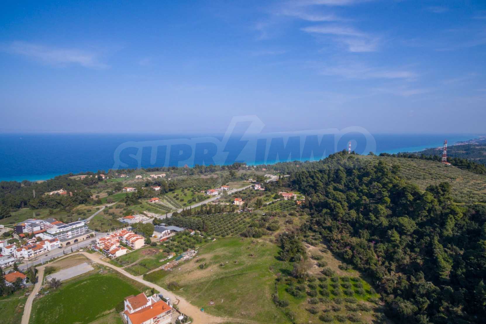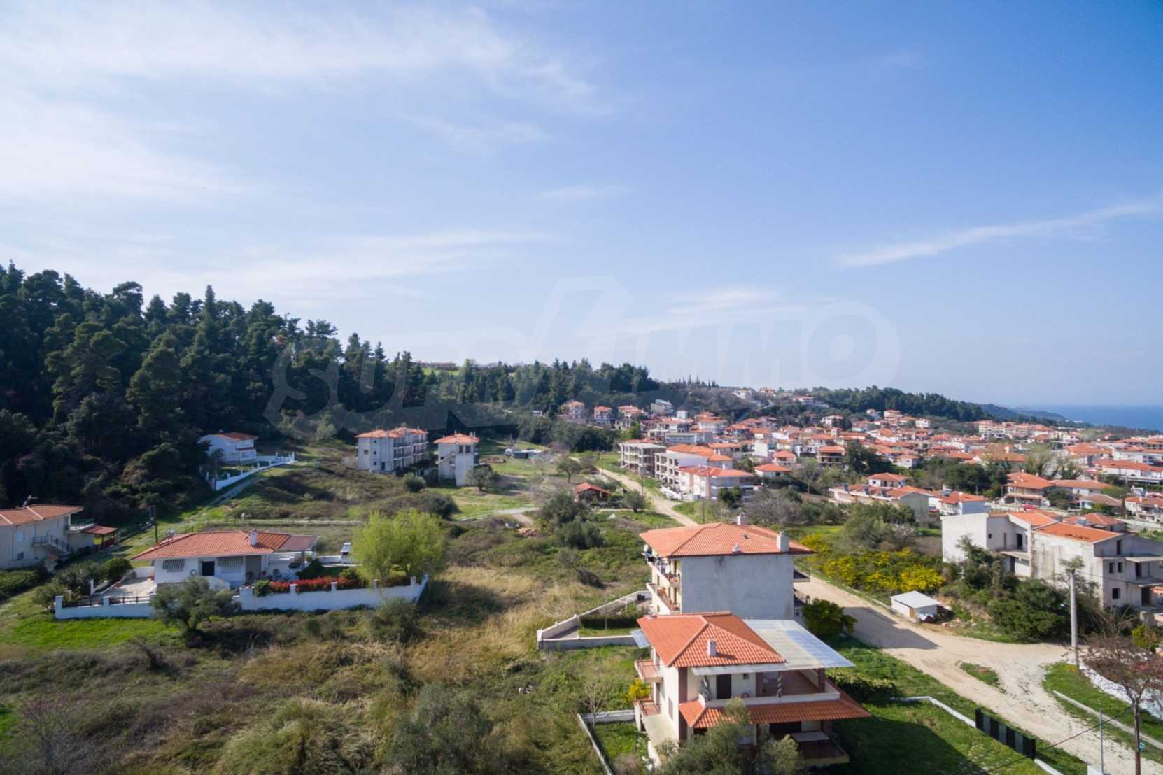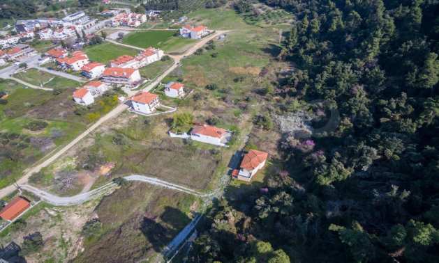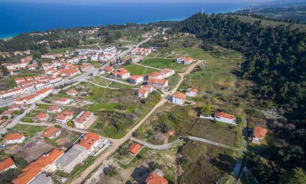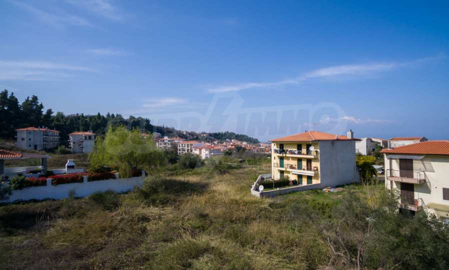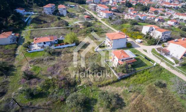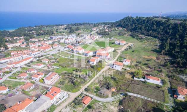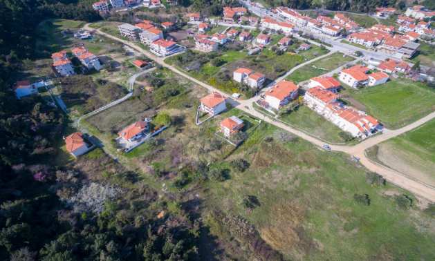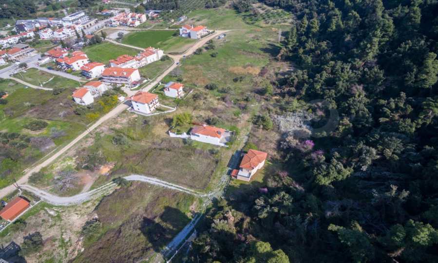 Наклонен парцел, 354 кв.м, в Касандра, Халкидики с безпрепятствен постоянен изглед и с източна ориентация. Имотът е на 600 м. от центъра на селото. Ограденият парцел е завършен, застроим и коефициентът му на застрояване е 0,6 (може да се построи 212 кв.м).