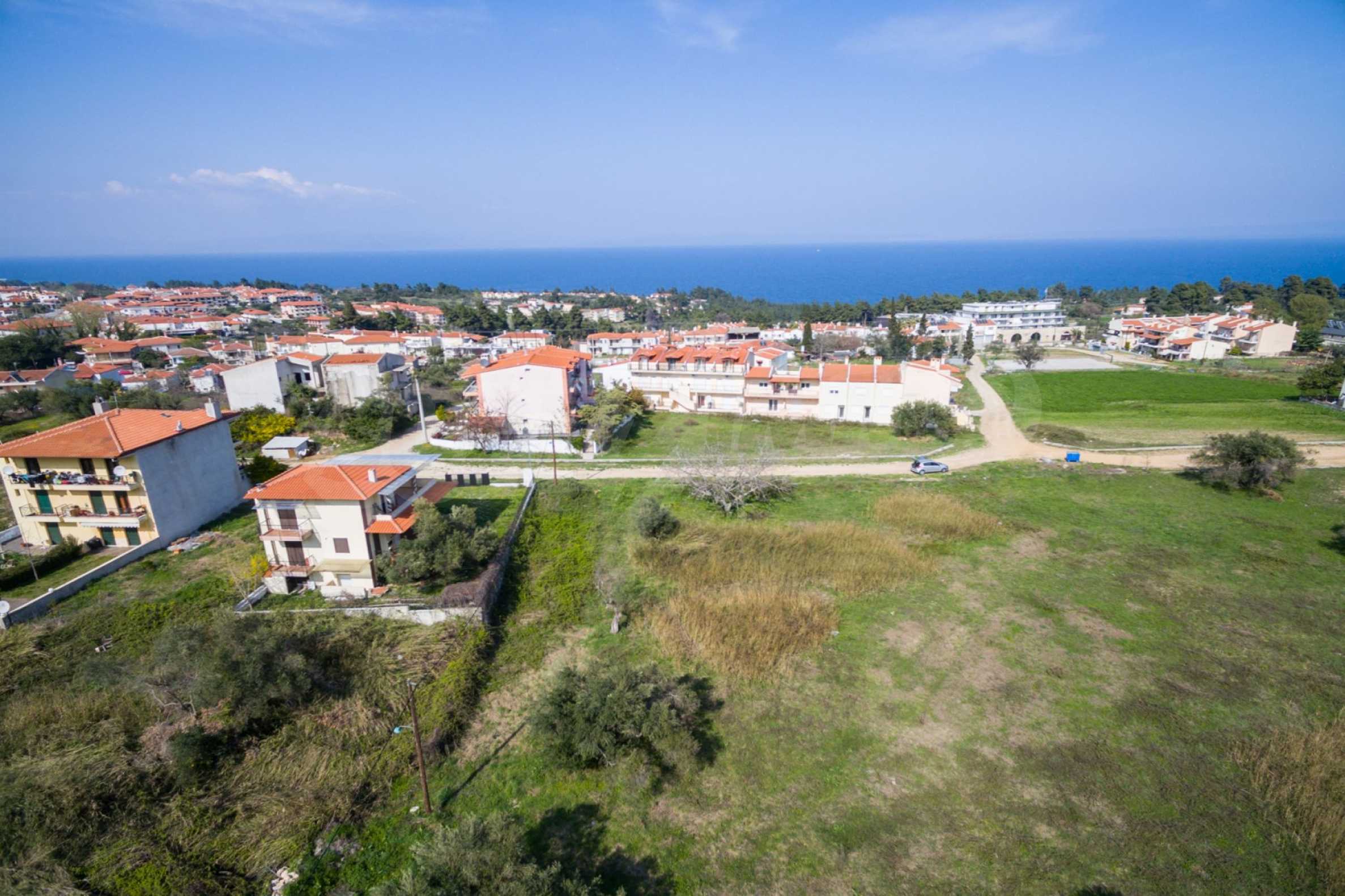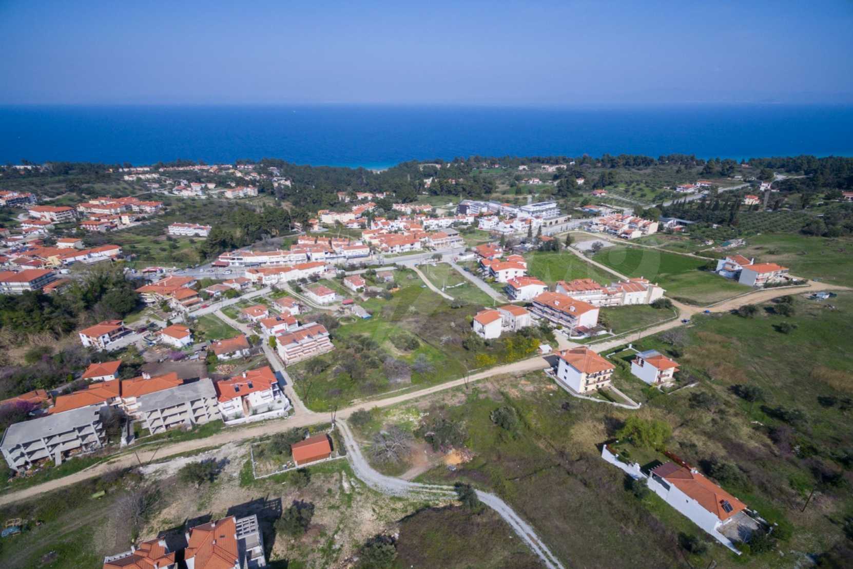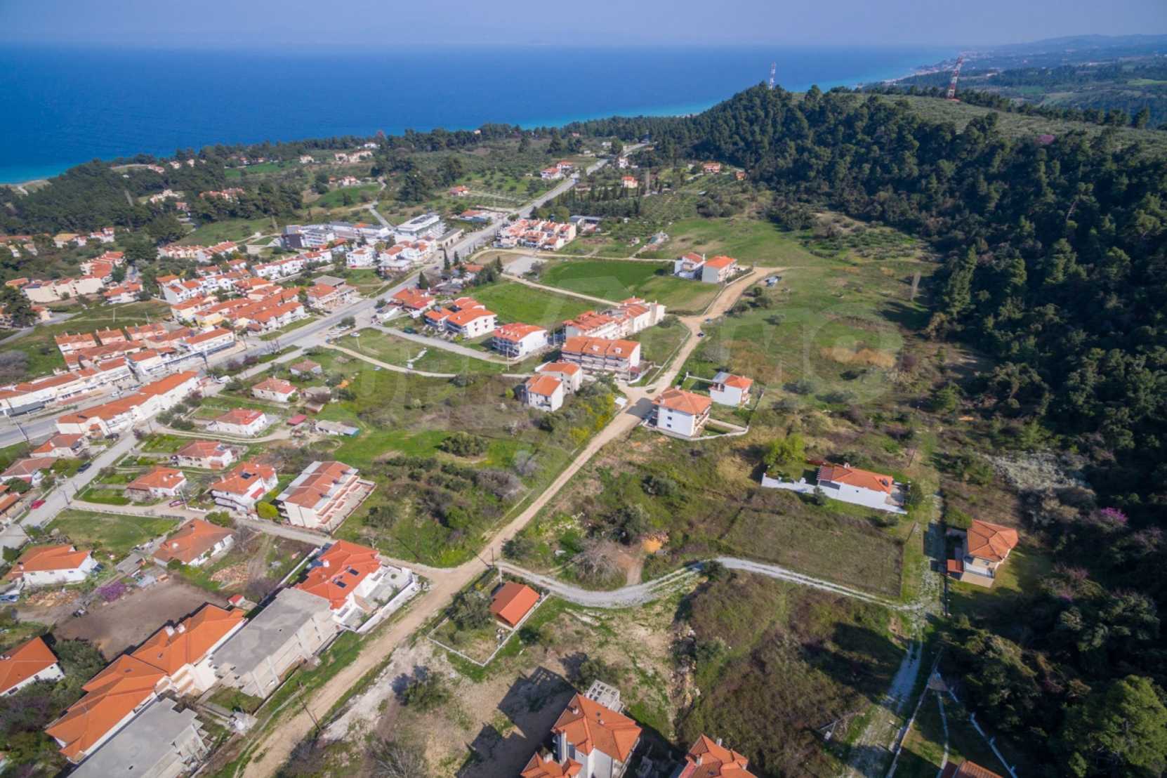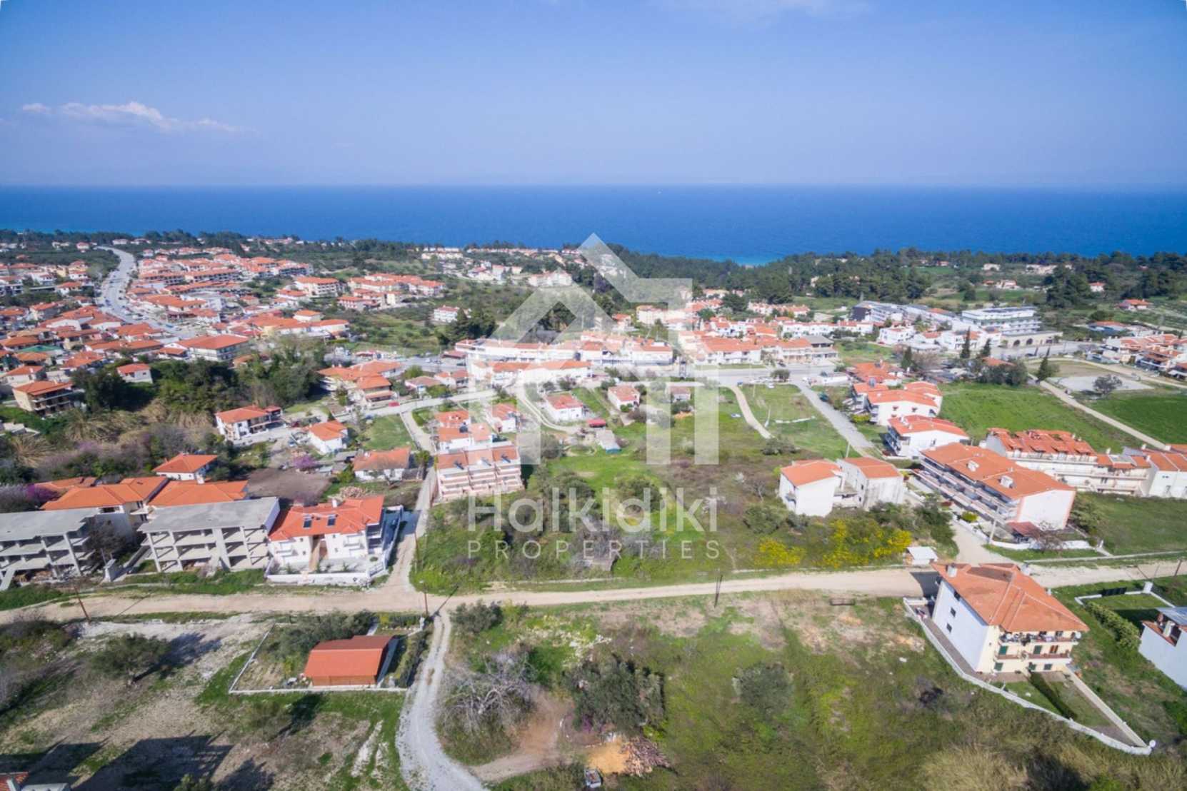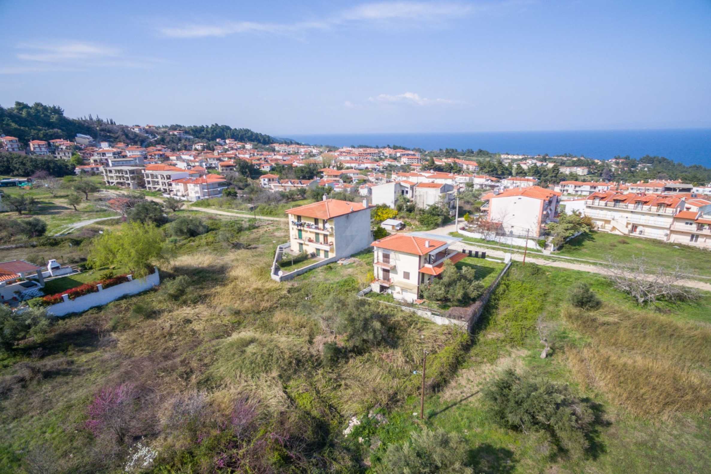 Наклонен парцел, 354 кв.м, в Касандра, Халкидики с безпрепятствен постоянен изглед и с източна ориентация. Имотът е на 600 м. от центъра на селото. Ограденият парцел е завършен, застроим и коефициентът му на застрояване е 0,6 (може да се построи 212 кв.м).