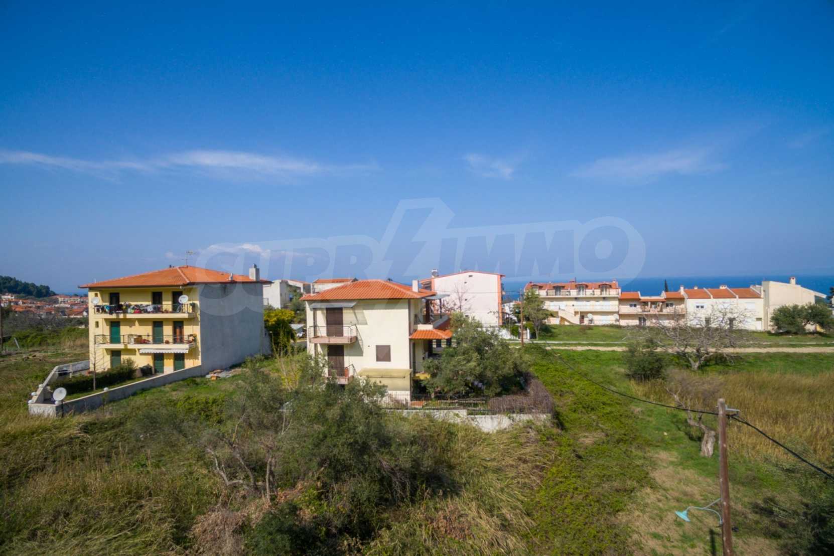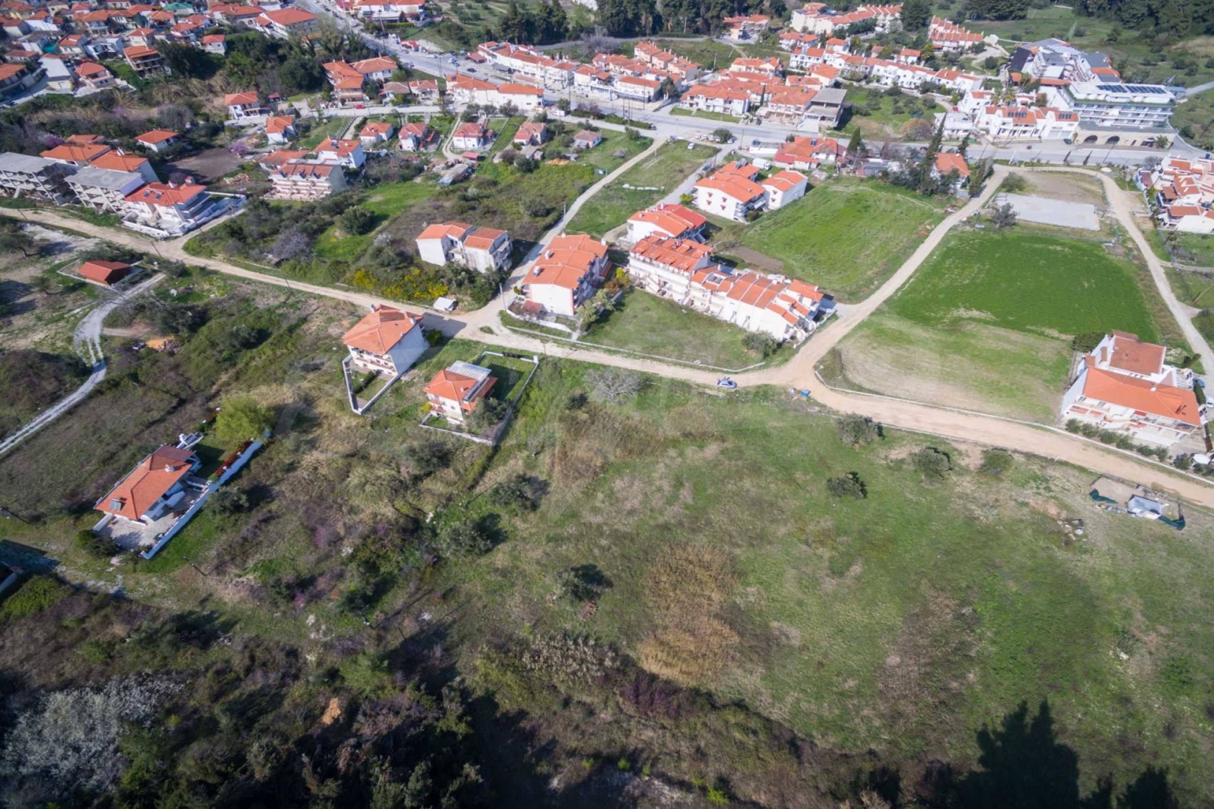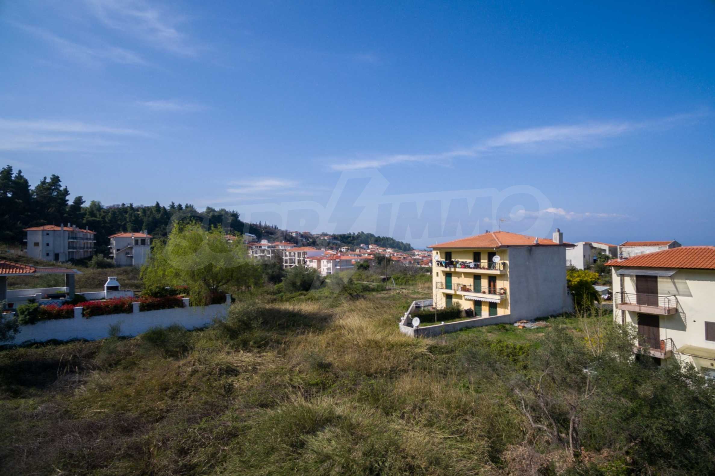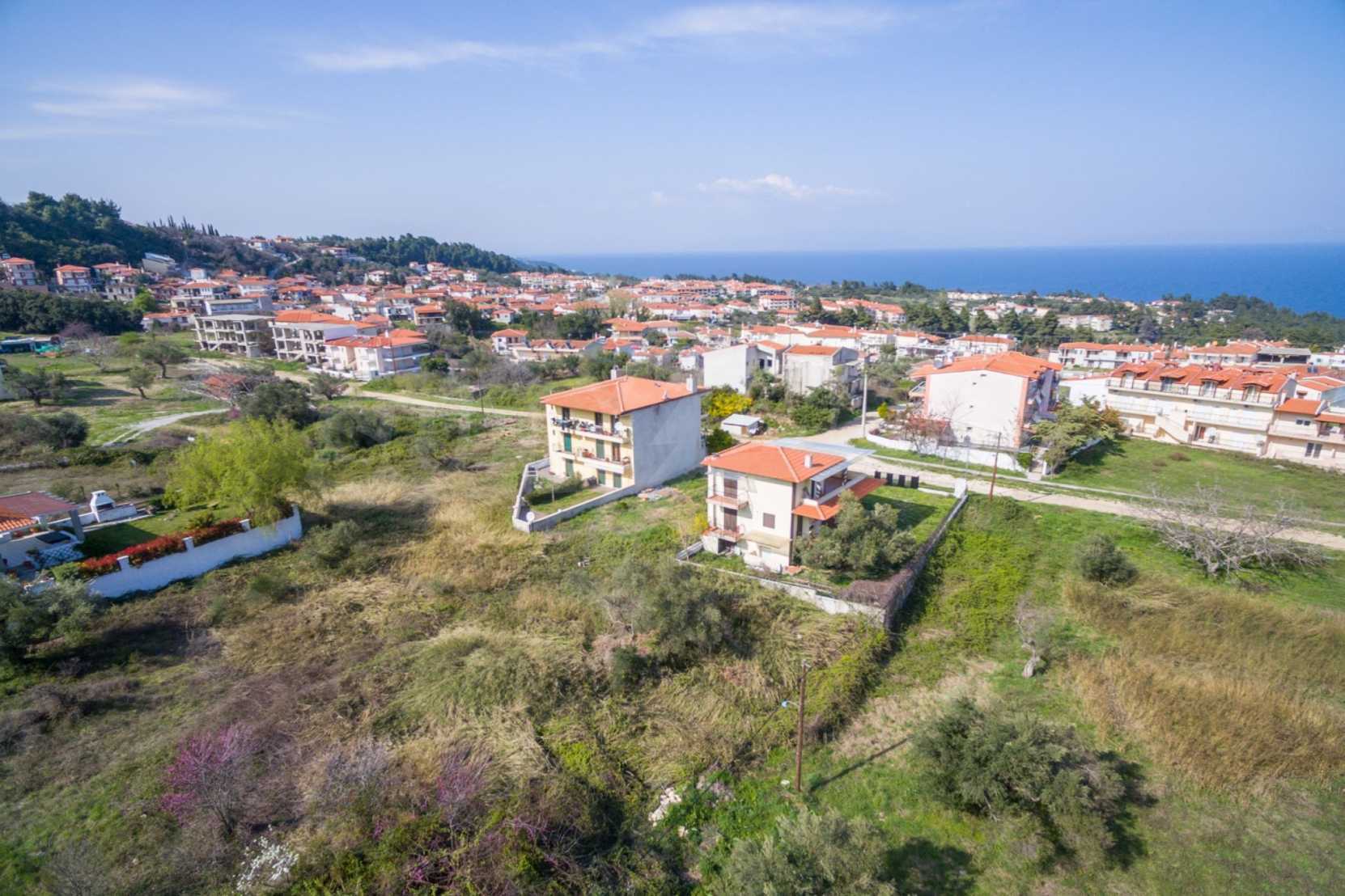 Наклонен парцел, 354 кв.м, в Касандра, Халкидики с безпрепятствен постоянен изглед и с източна ориентация. Имотът е на 600 м. от центъра на селото. Ограденият парцел е завършен, застроим и коефициентът му на застрояване е 0,6 (може да се построи 212 кв.м).