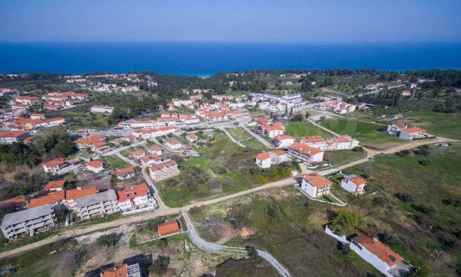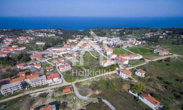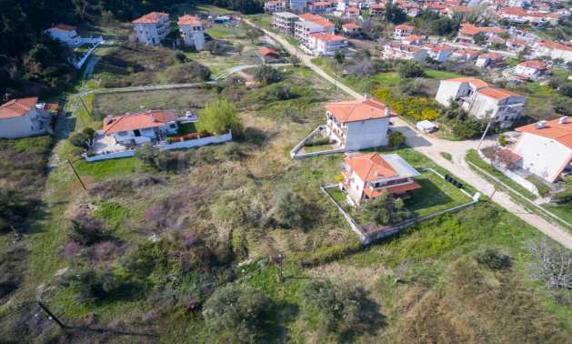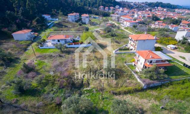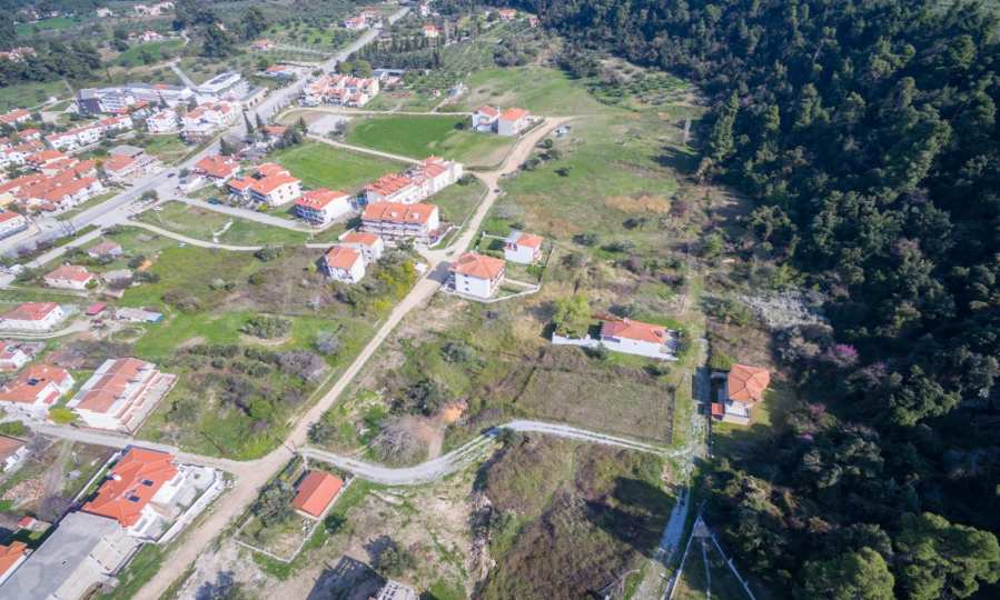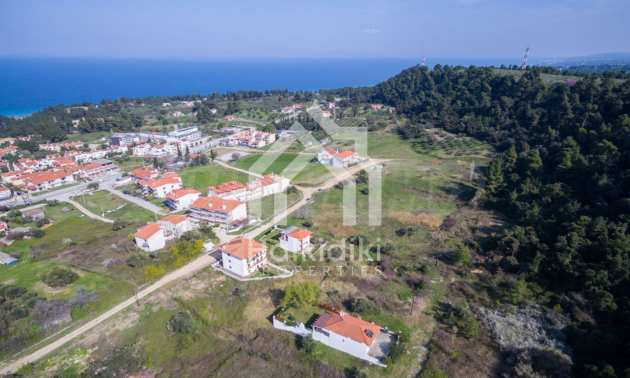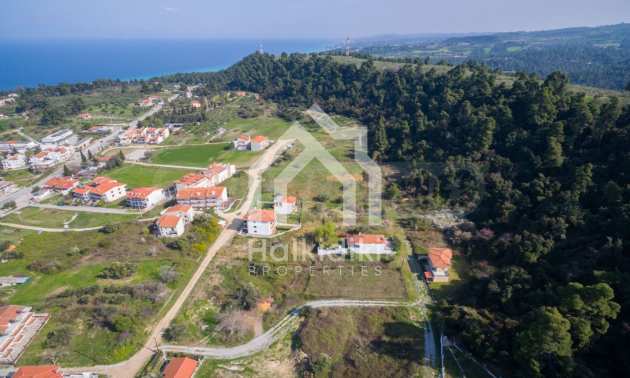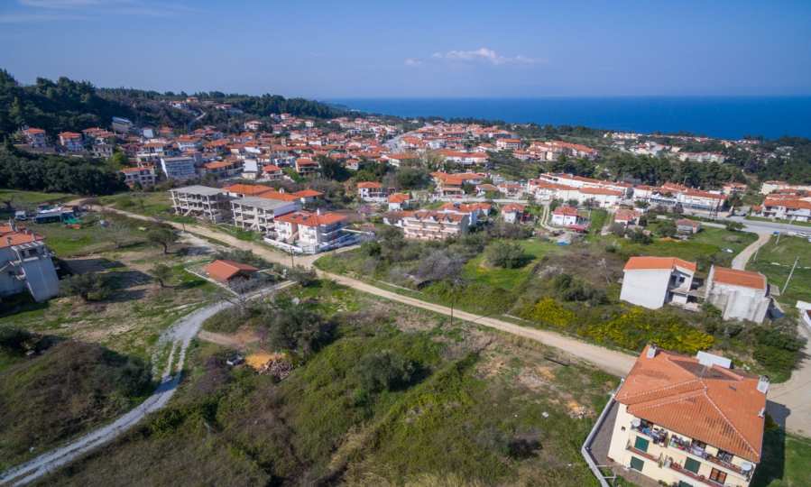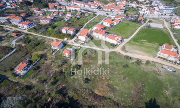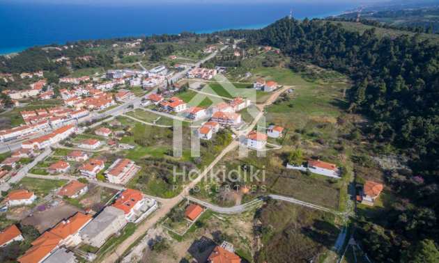 Наклонен парцел, 354 кв.м, в Касандра, Халкидики с безпрепятствен постоянен изглед и с източна ориентация. Имотът е на 600 м. от центъра на селото. Ограденият парцел е завършен, застроим и коефициентът му на застрояване е 0,6 (може да се построи 212 кв.м).