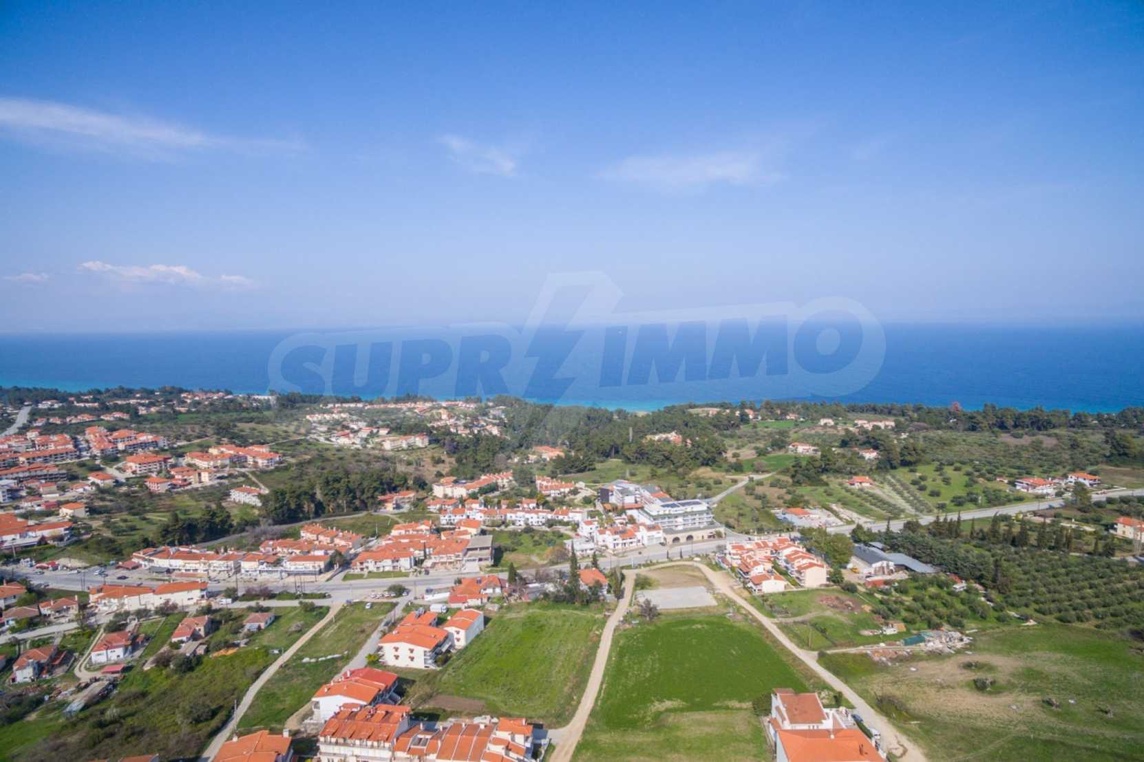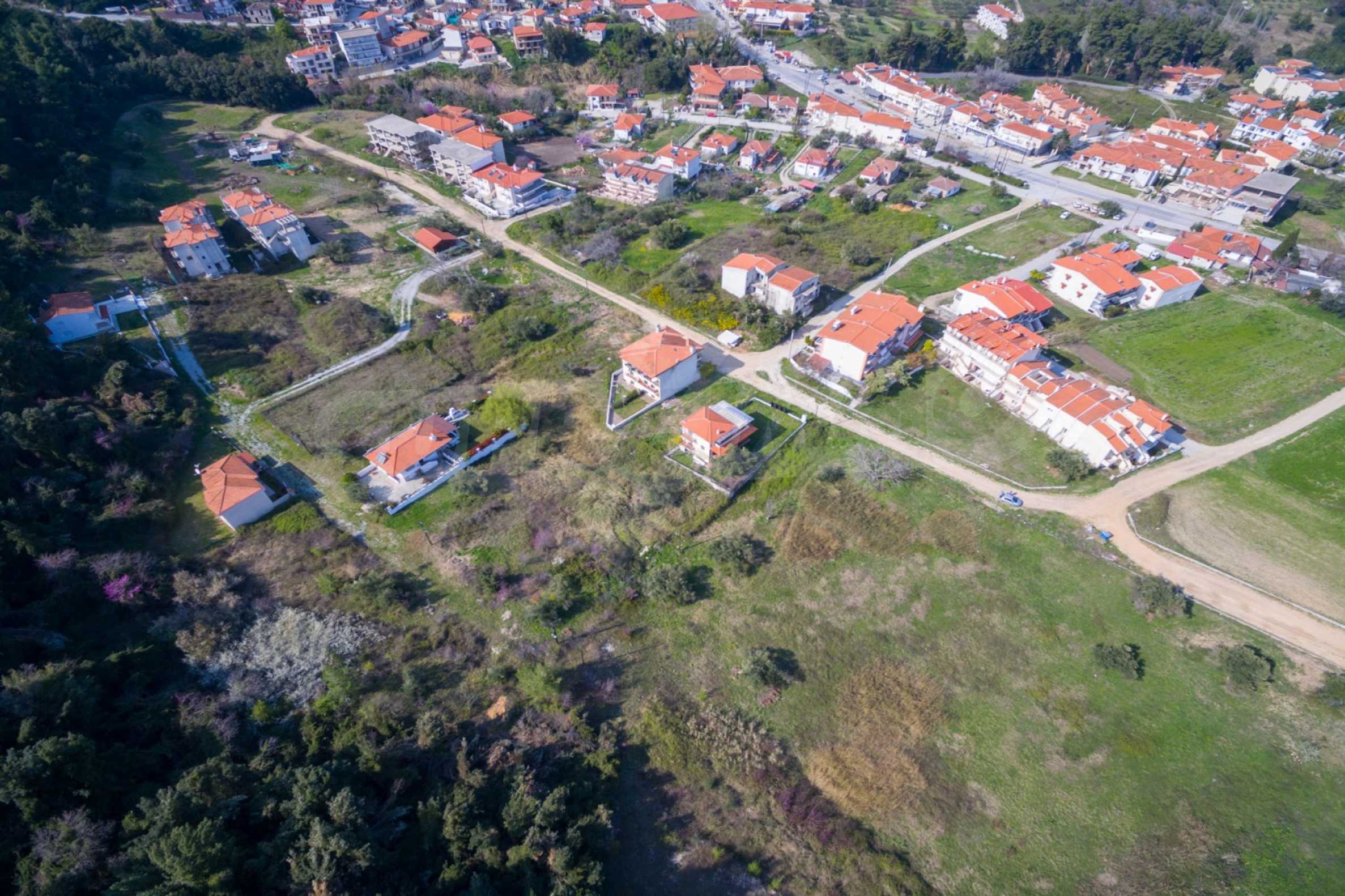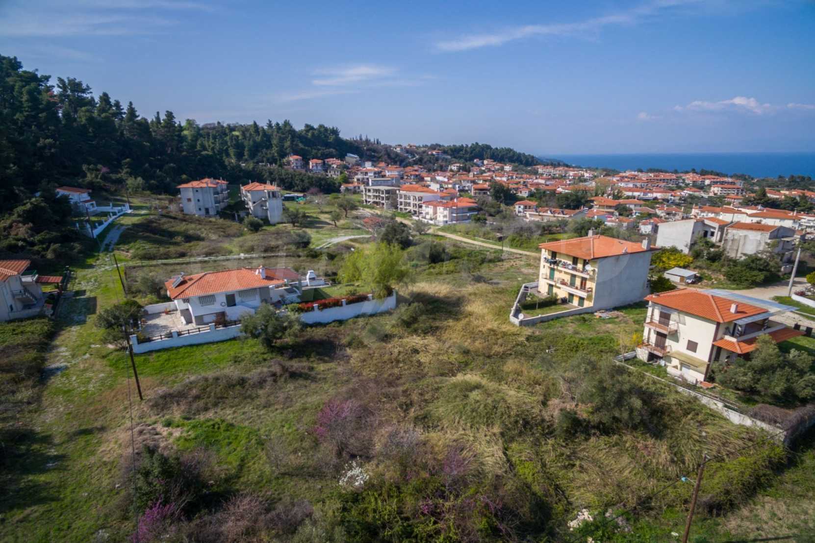 Наклонен парцел, 354 кв.м, в Касандра, Халкидики с безпрепятствен постоянен изглед и с източна ориентация. Имотът е на 600 м. от центъра на селото. Ограденият парцел е завършен, застроим и коефициентът му на застрояване е 0,6 (може да се построи 212 кв.м).