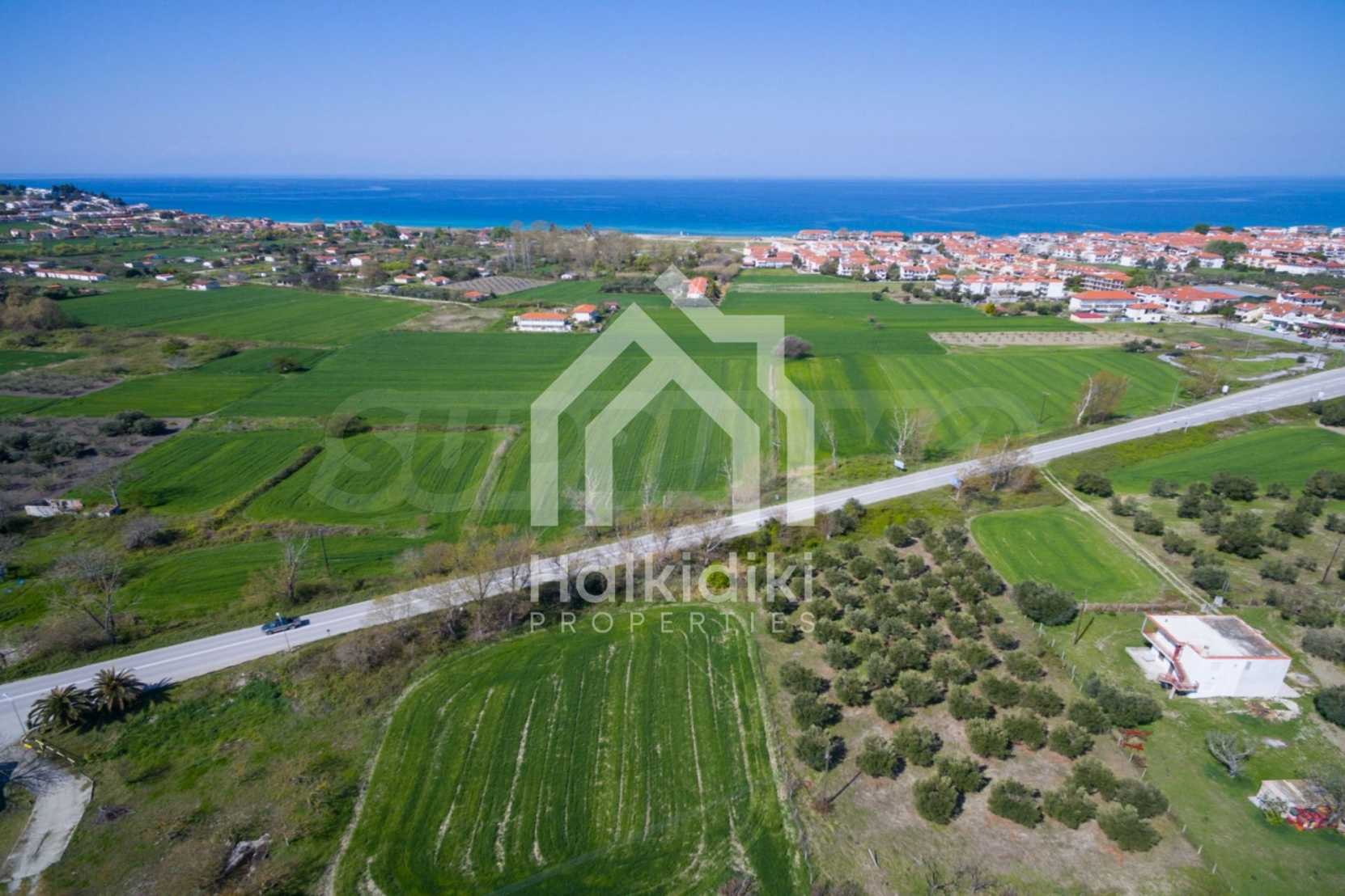 Плоско поле, 13.594 кв.м, в Касандра, Солун с безпрепятствен постоянен изглед и със западна ориентация. Имотът е 900 m. от плажа и центъра на селото. Полето е завършено, застроено и с лице към главния път. Имотът е идеален за изграждане на самостоятелни къщи и професионално ползване.