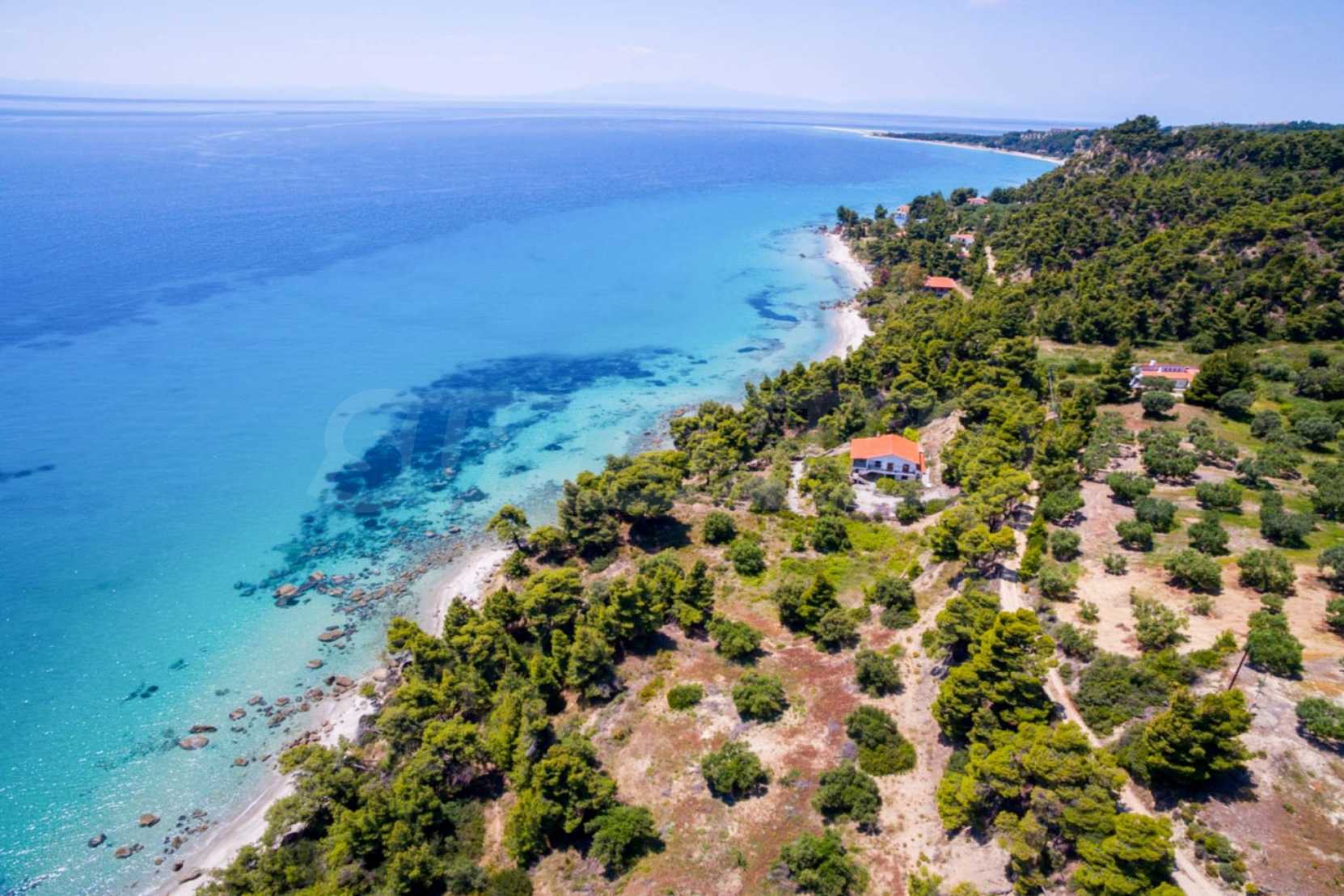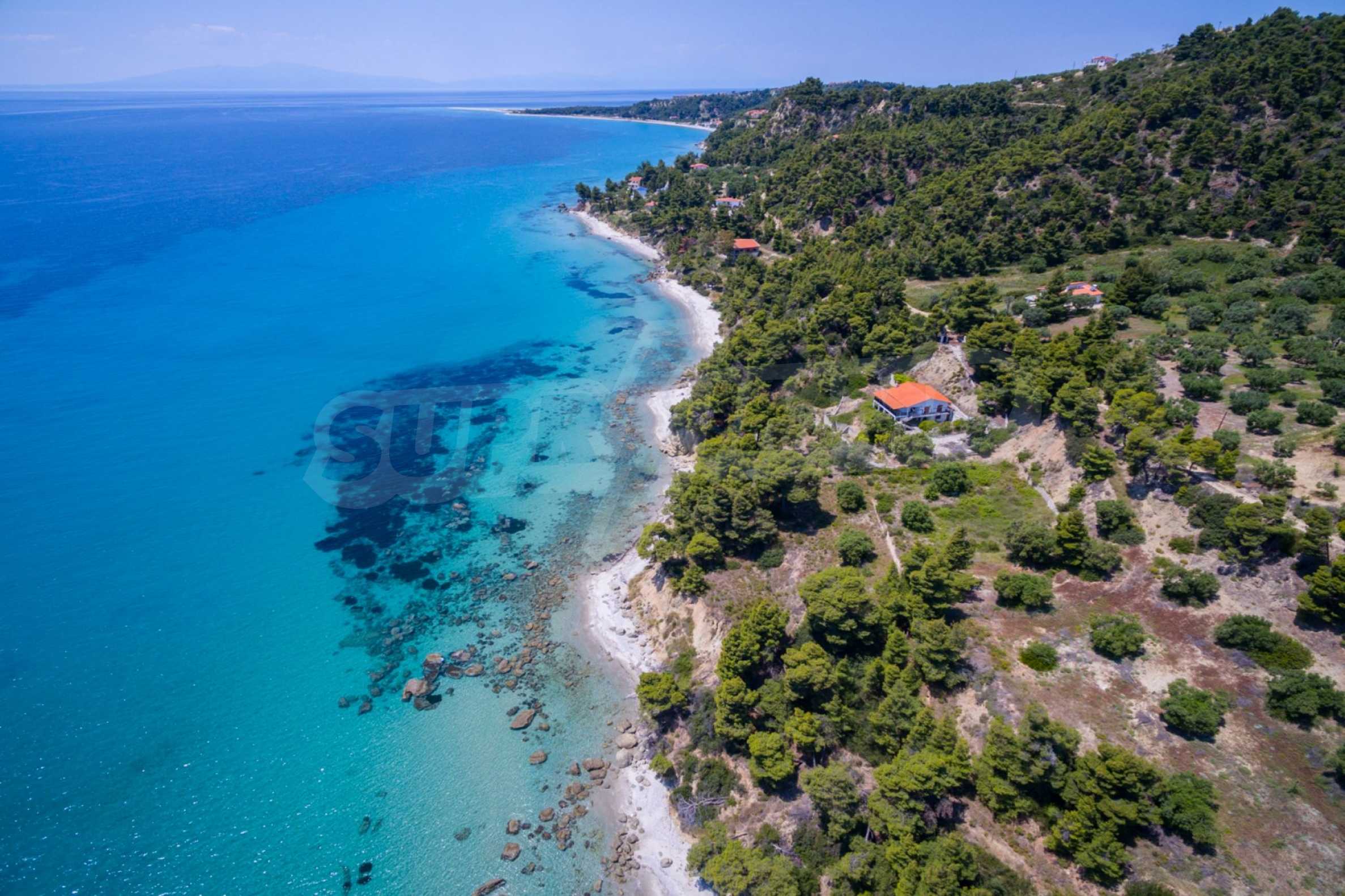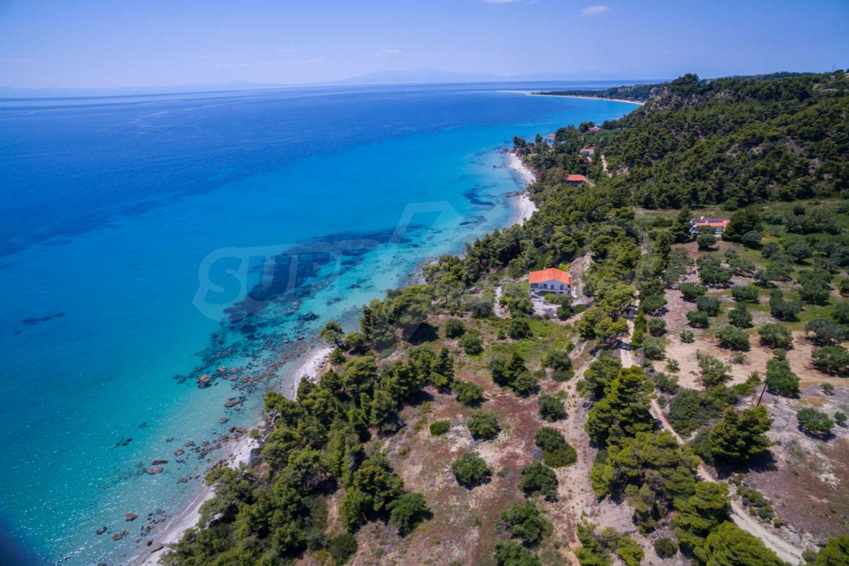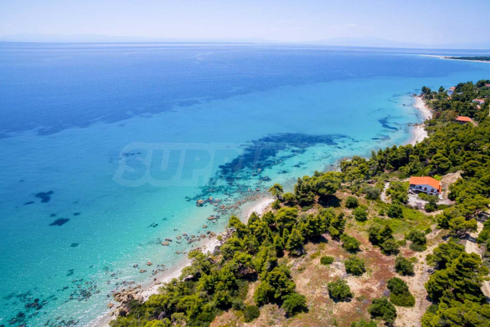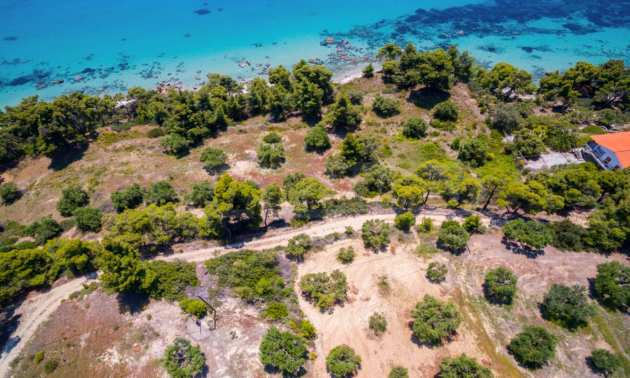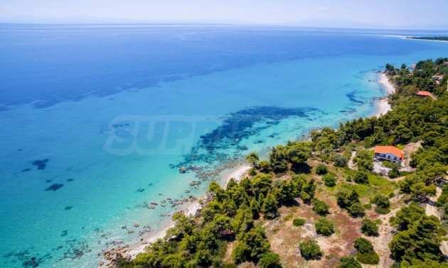 Засадено дърво поле, 4,320 кв.м, в Касандра, Халкидики с безпрепятствен постоянен изглед и с югозападна ориентация. Наклоненият имот е първо на морето, с изключителен достъп до плажа, и е на 1,8 км. от центъра на селото. Полето, което е пълно и застрояващо (може да се построи 200 кв.м), е идеално за изграждане на къща.