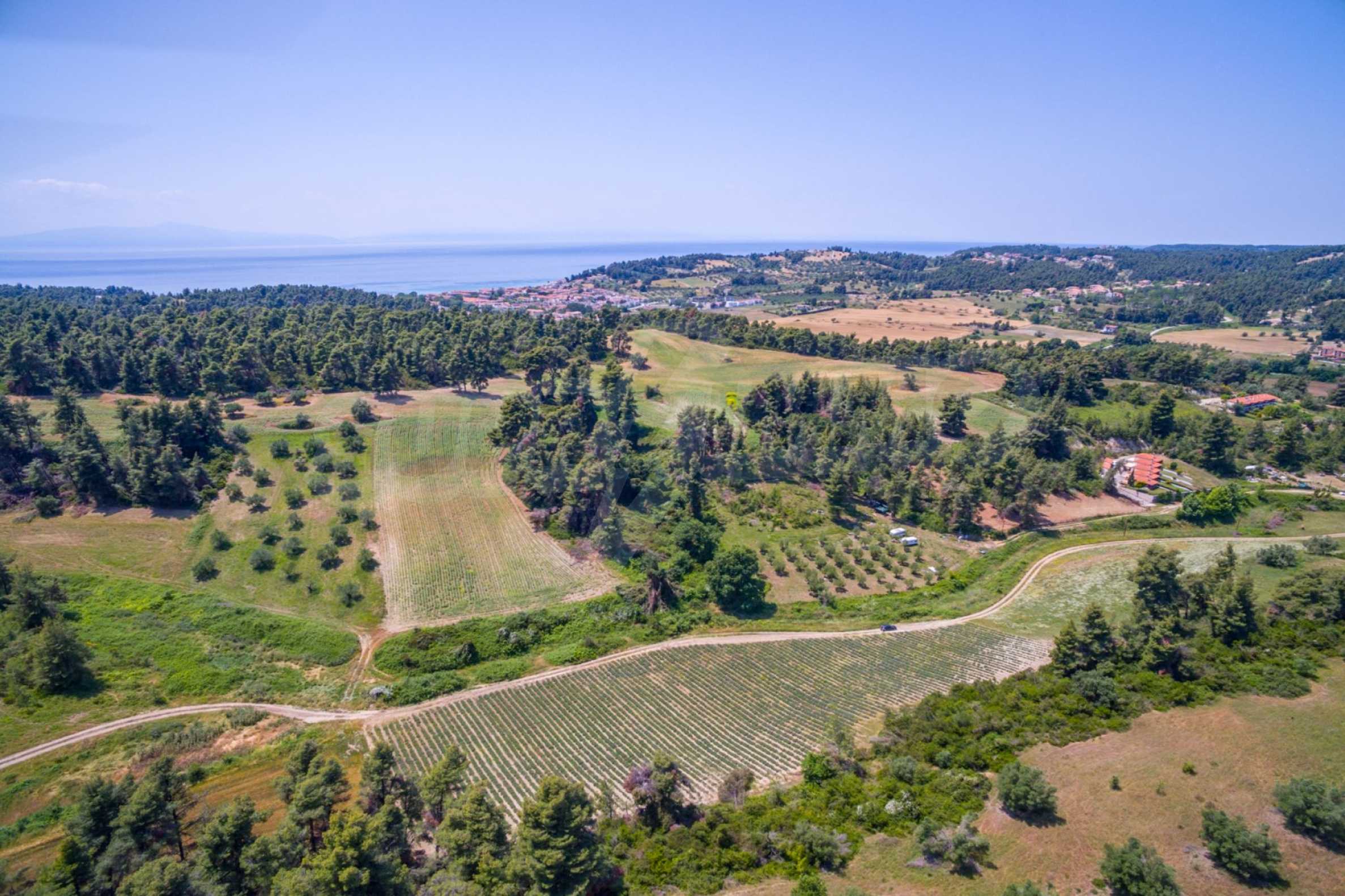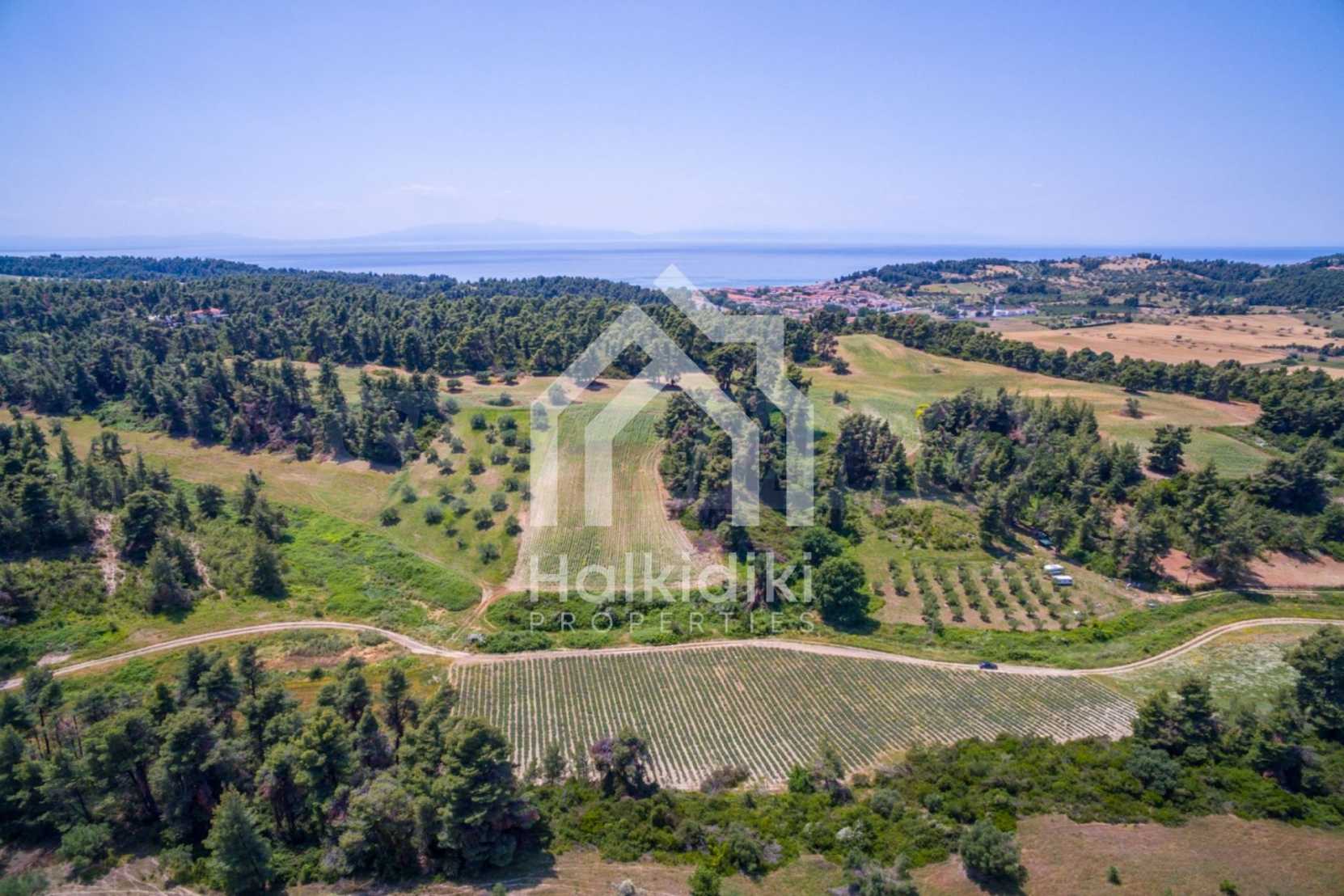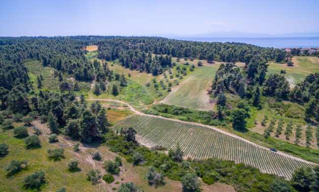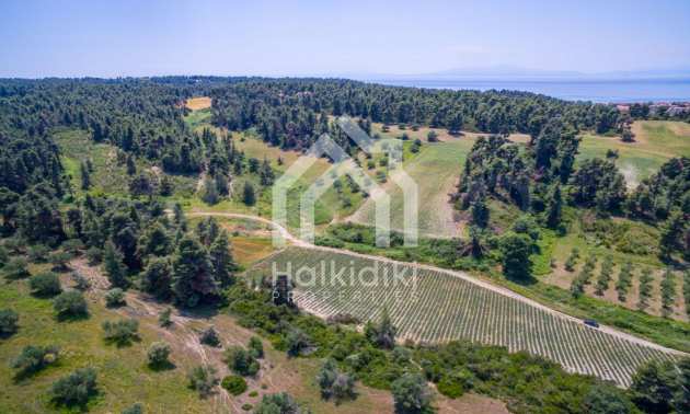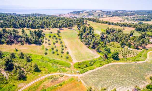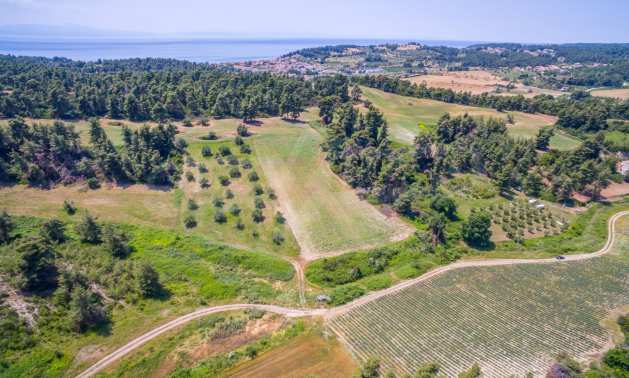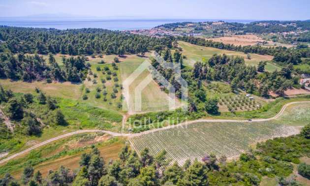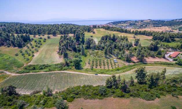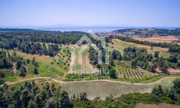 Амфитеатрално поле, 18.780 кв.м, в Касандра, Халкидики с безпрепятствен постоянен изглед и с източна ориентация. Имотът е на 2 км. от красив плаж и от центъра на селото. Полето, което е пълно и застрояващо (може да се изгради 800 кв.м), е разделено на четири еквивалента.