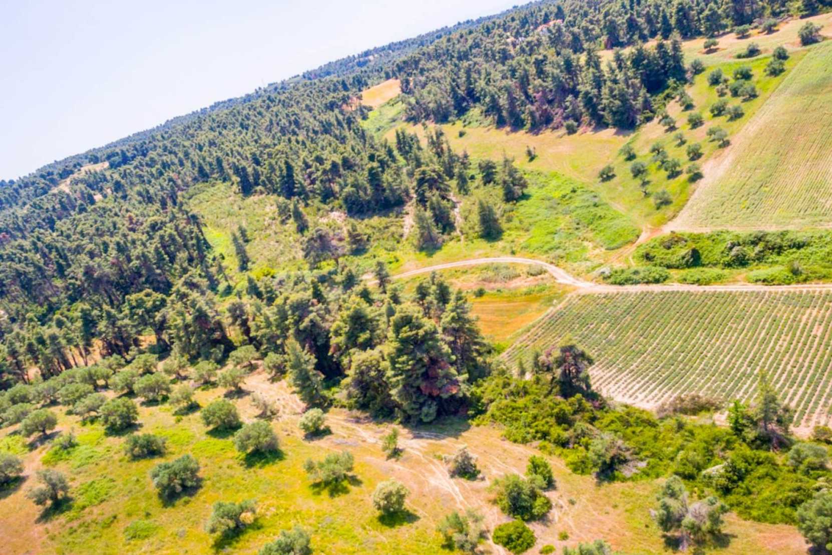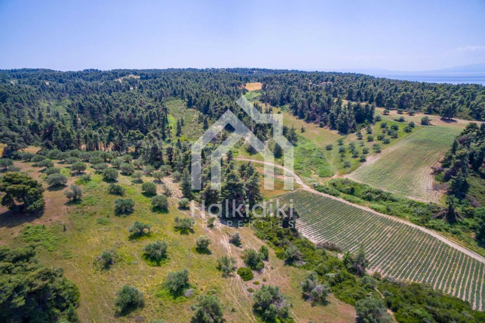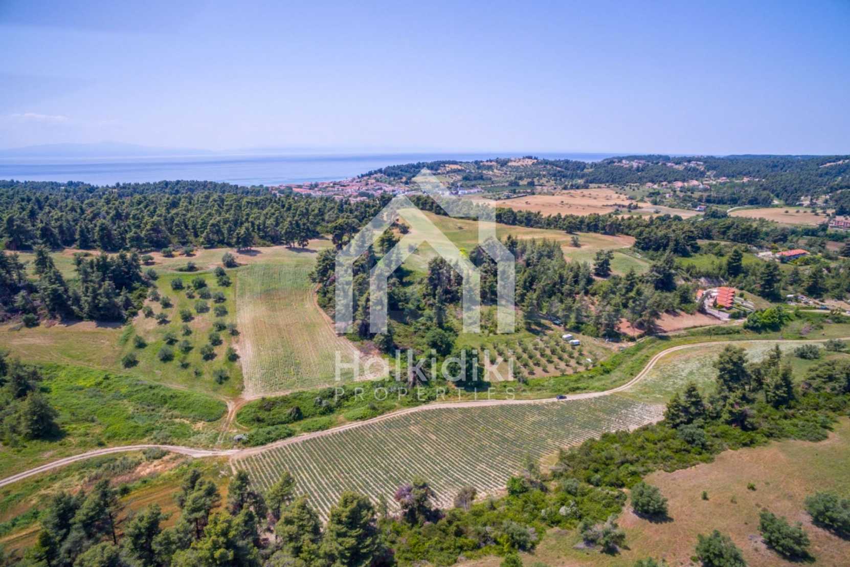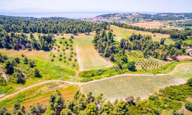 Амфитеатрално поле, 18.780 кв.м, в Касандра, Халкидики с безпрепятствен постоянен изглед и с източна ориентация. Имотът е на 2 км. от красив плаж и от центъра на селото. Полето, което е пълно и застрояващо (може да се изгради 800 кв.м), е разделено на четири еквивалента.