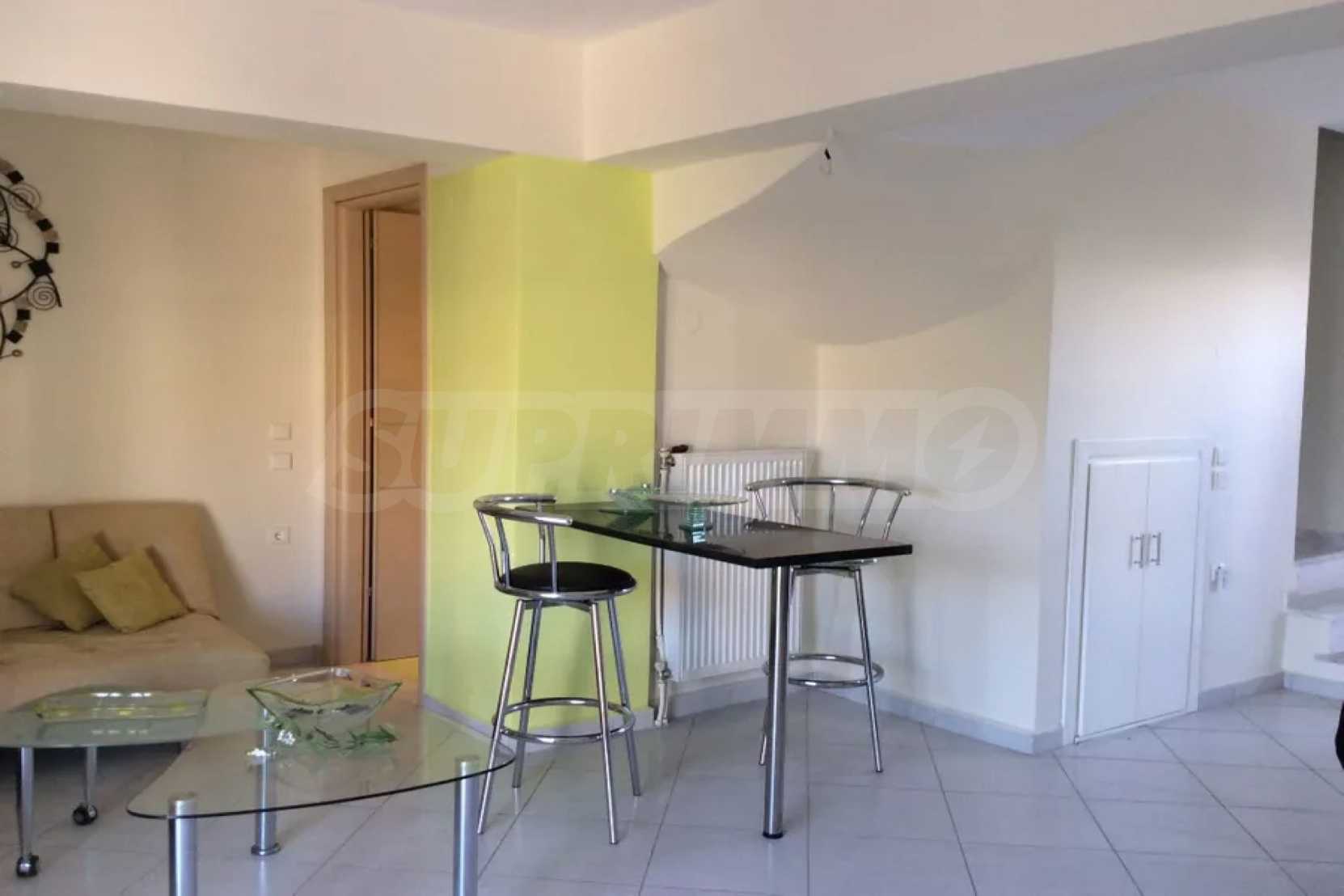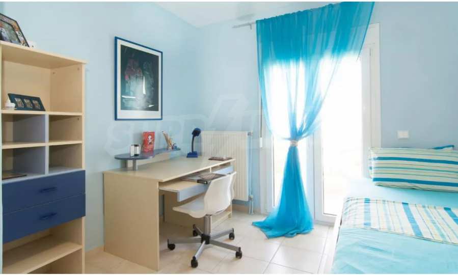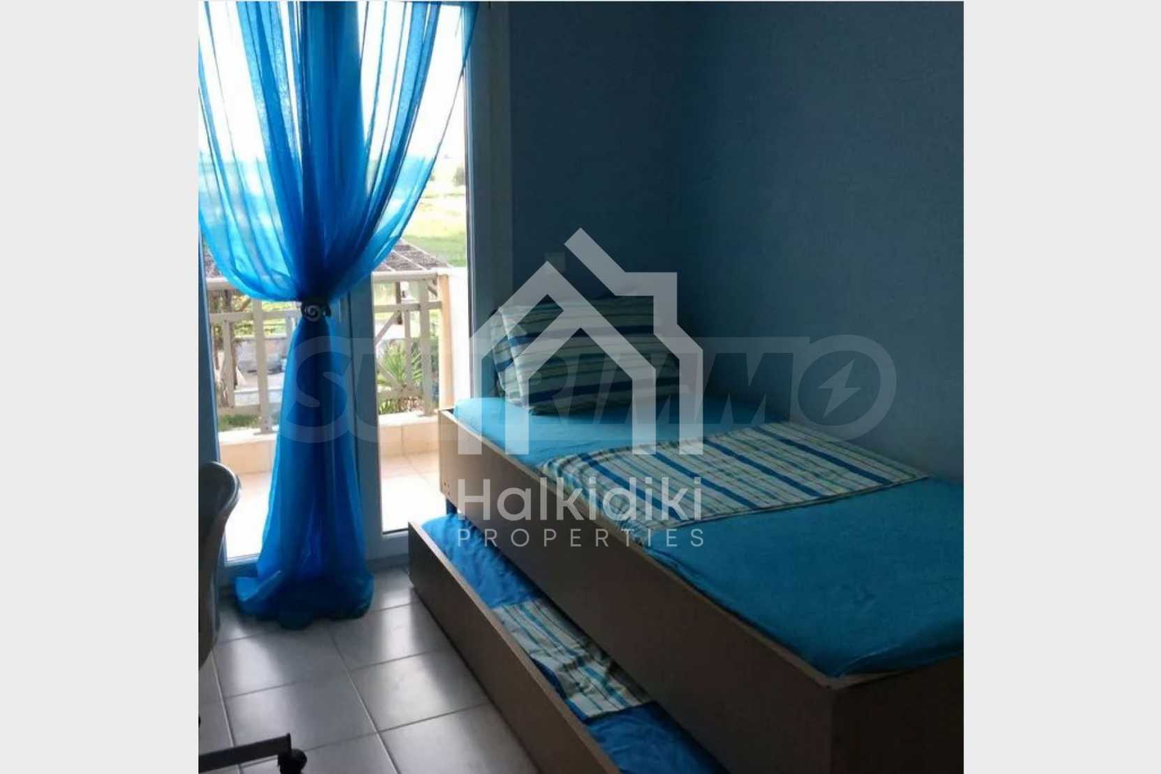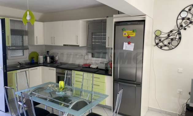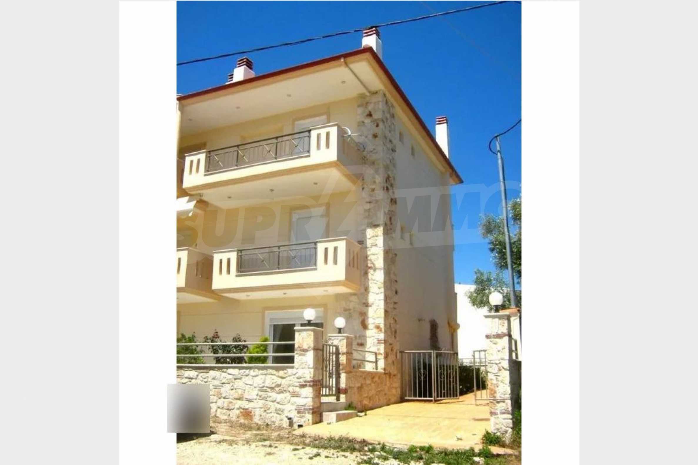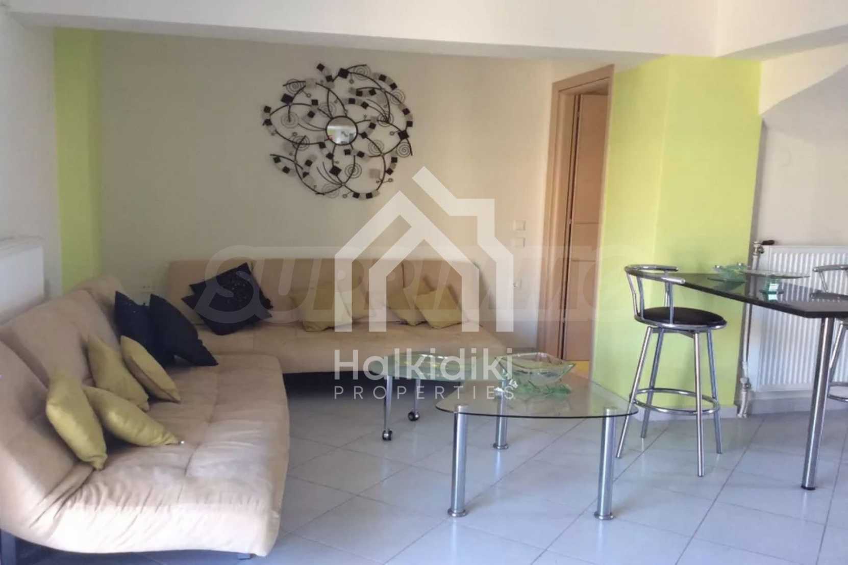 Красив мезонет, 128 кв.м, в Касандра, Халкидики с източна ориентация и с безпрепятствен постоянен изглед. Имотът е на 750 м. от плажа и на 400 м. от центъра на селото. Мезонетът е разделен на три нива, състоящ се от хол, свързан с кухнята, четири спални, пет бани и килер. Имотът също има големи тераси, място за паркиране и PVC дограма ,