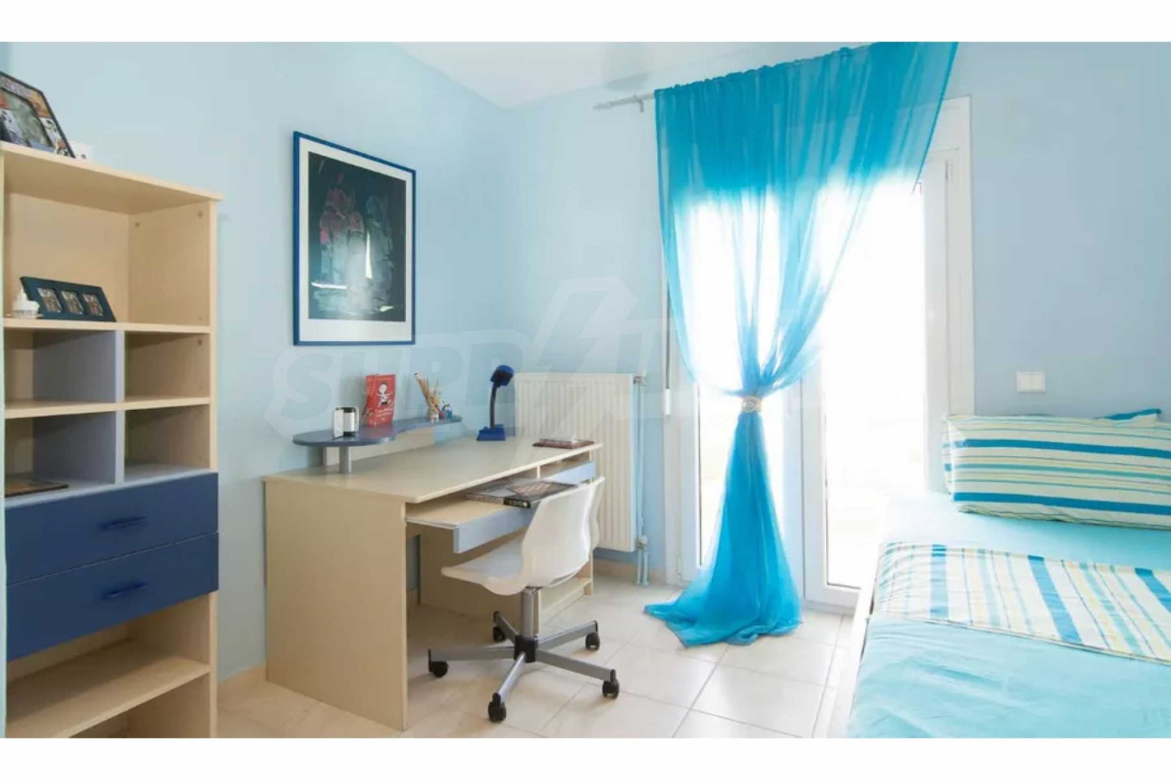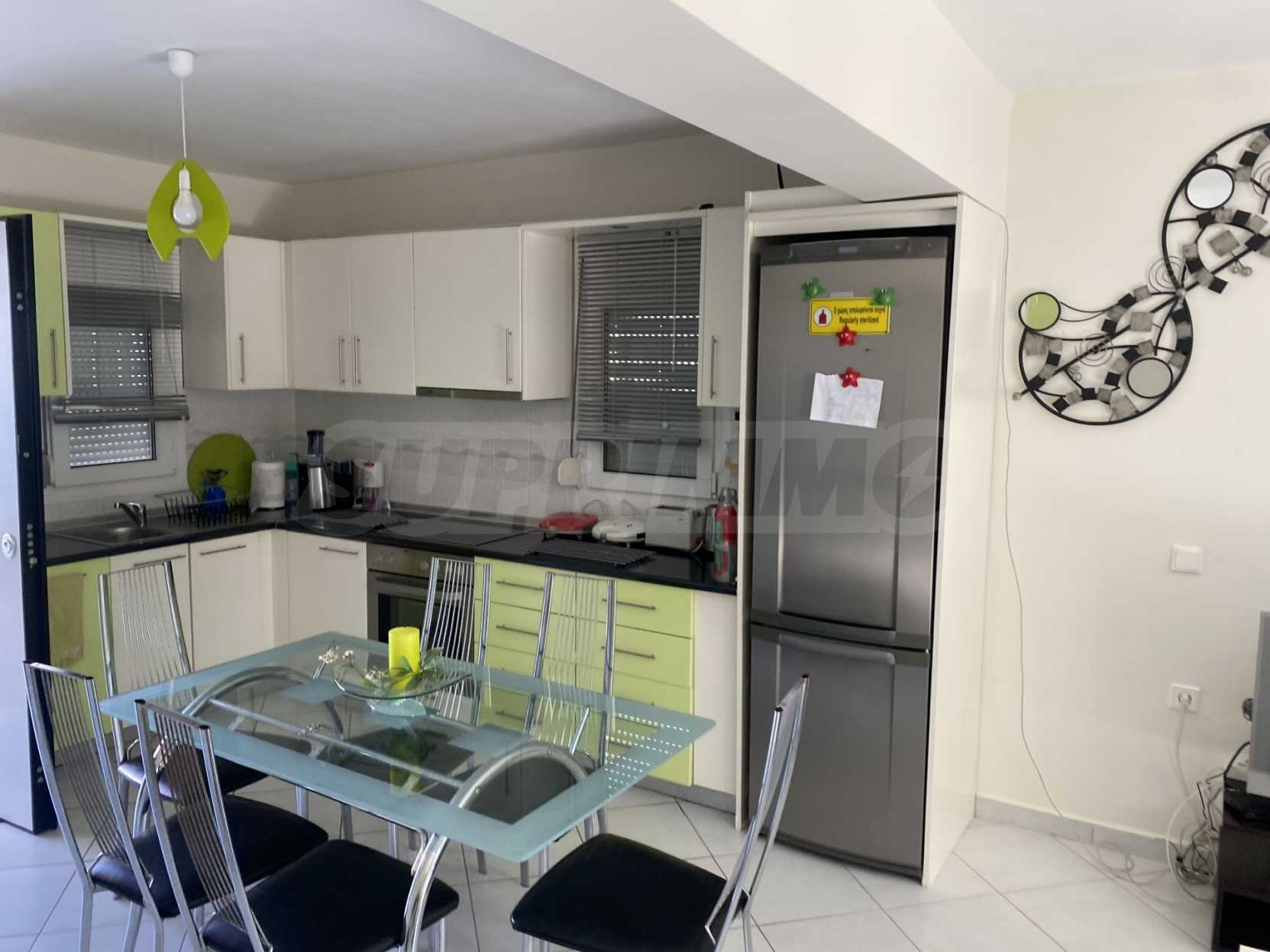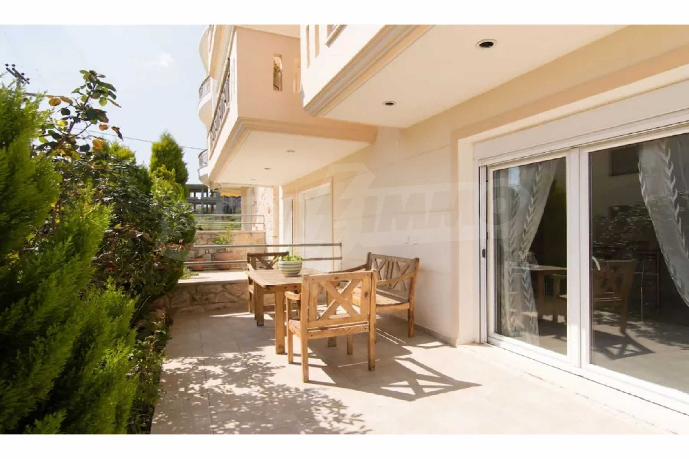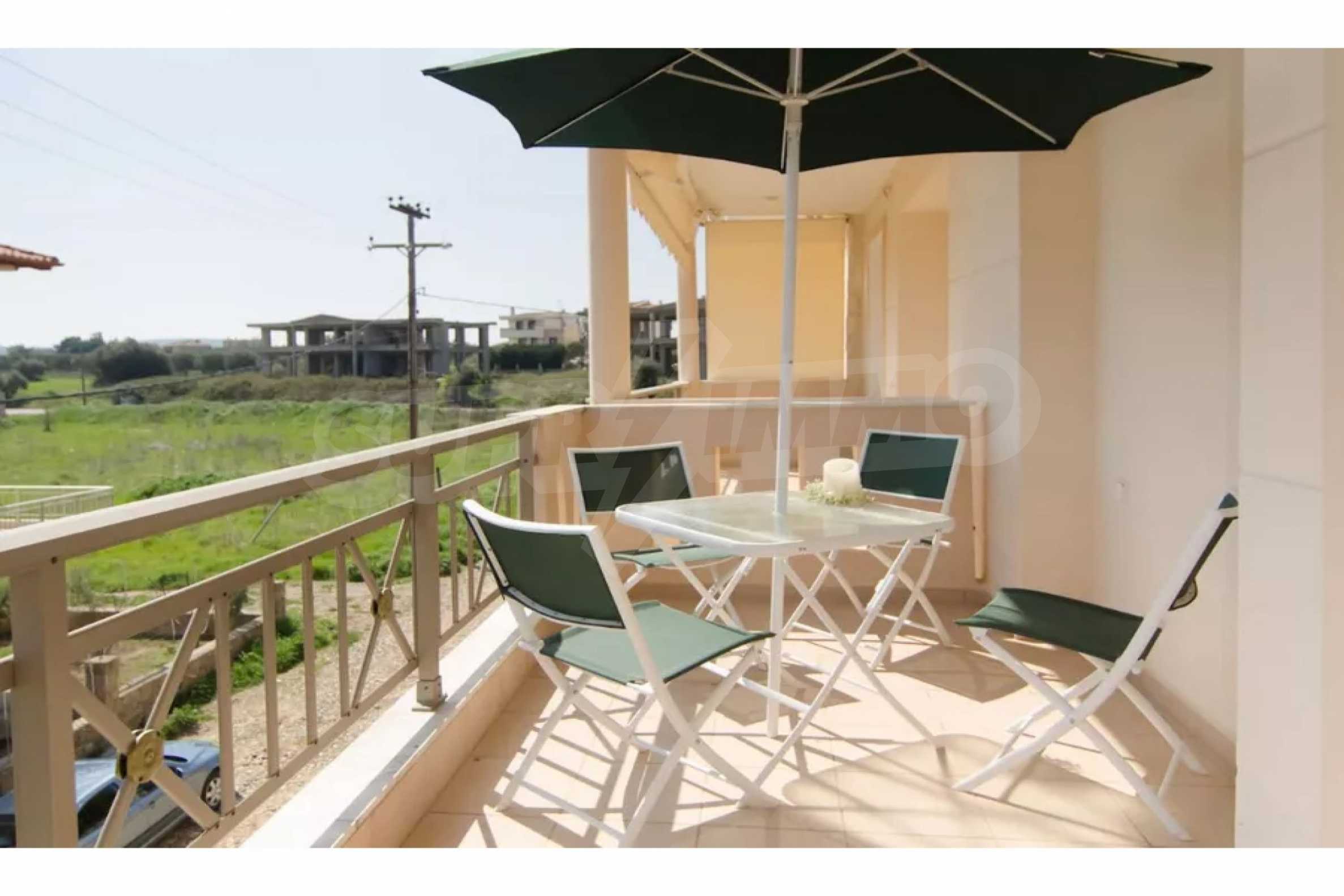 Красив мезонет, 128 кв.м, в Касандра, Халкидики с източна ориентация и с безпрепятствен постоянен изглед. Имотът е на 750 м. от плажа и на 400 м. от центъра на селото. Мезонетът е разделен на три нива, състоящ се от хол, свързан с кухнята, четири спални, пет бани и килер. Имотът също има големи тераси, място за паркиране и PVC дограма ,