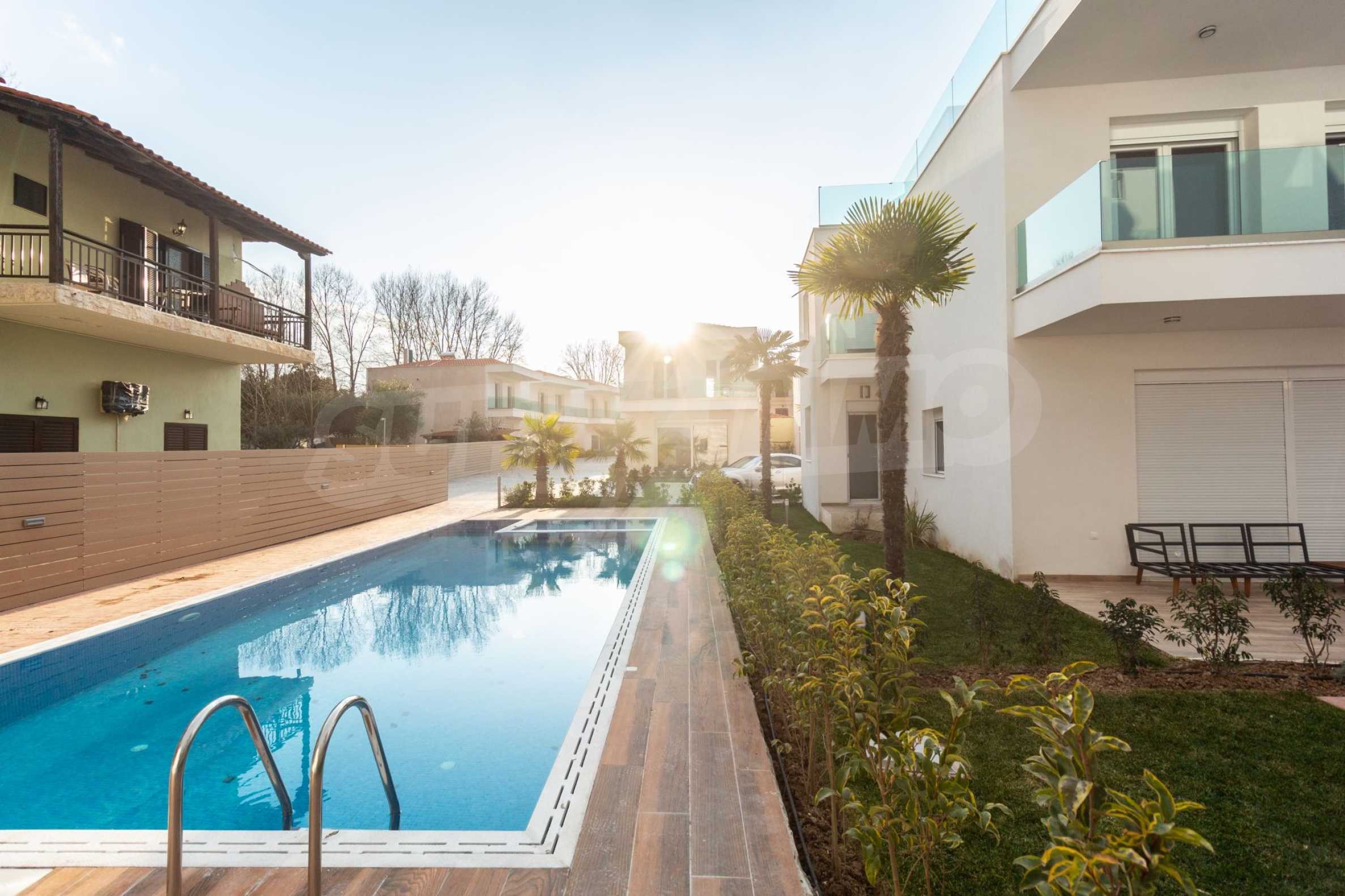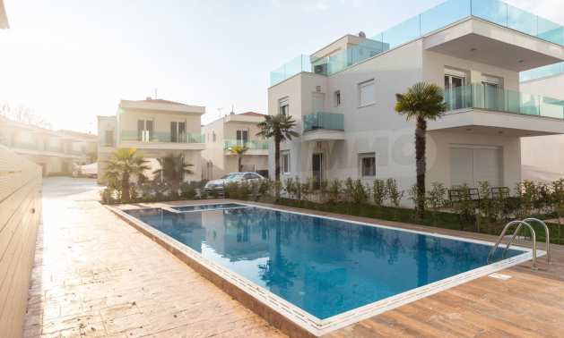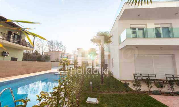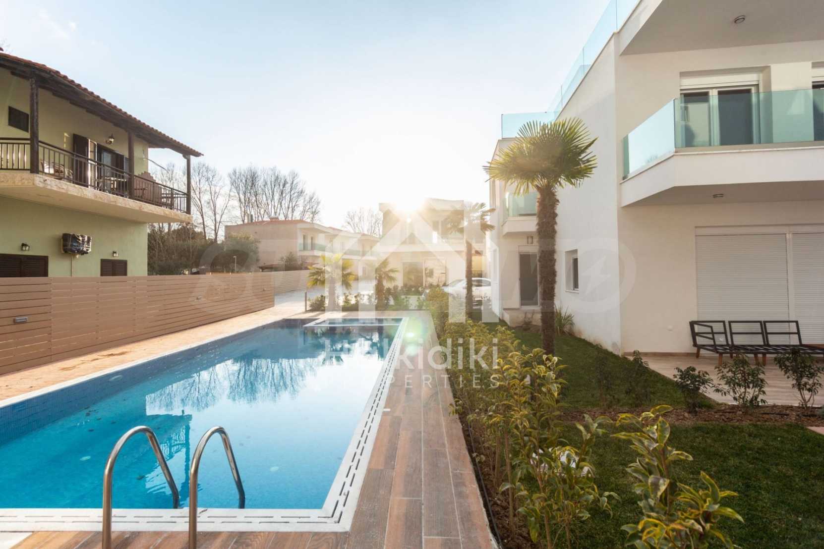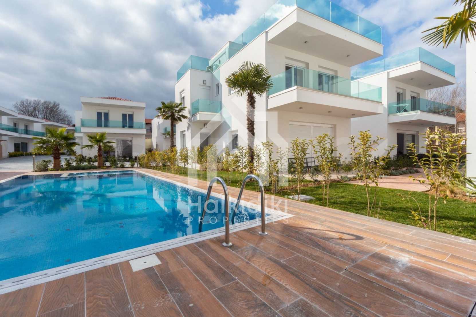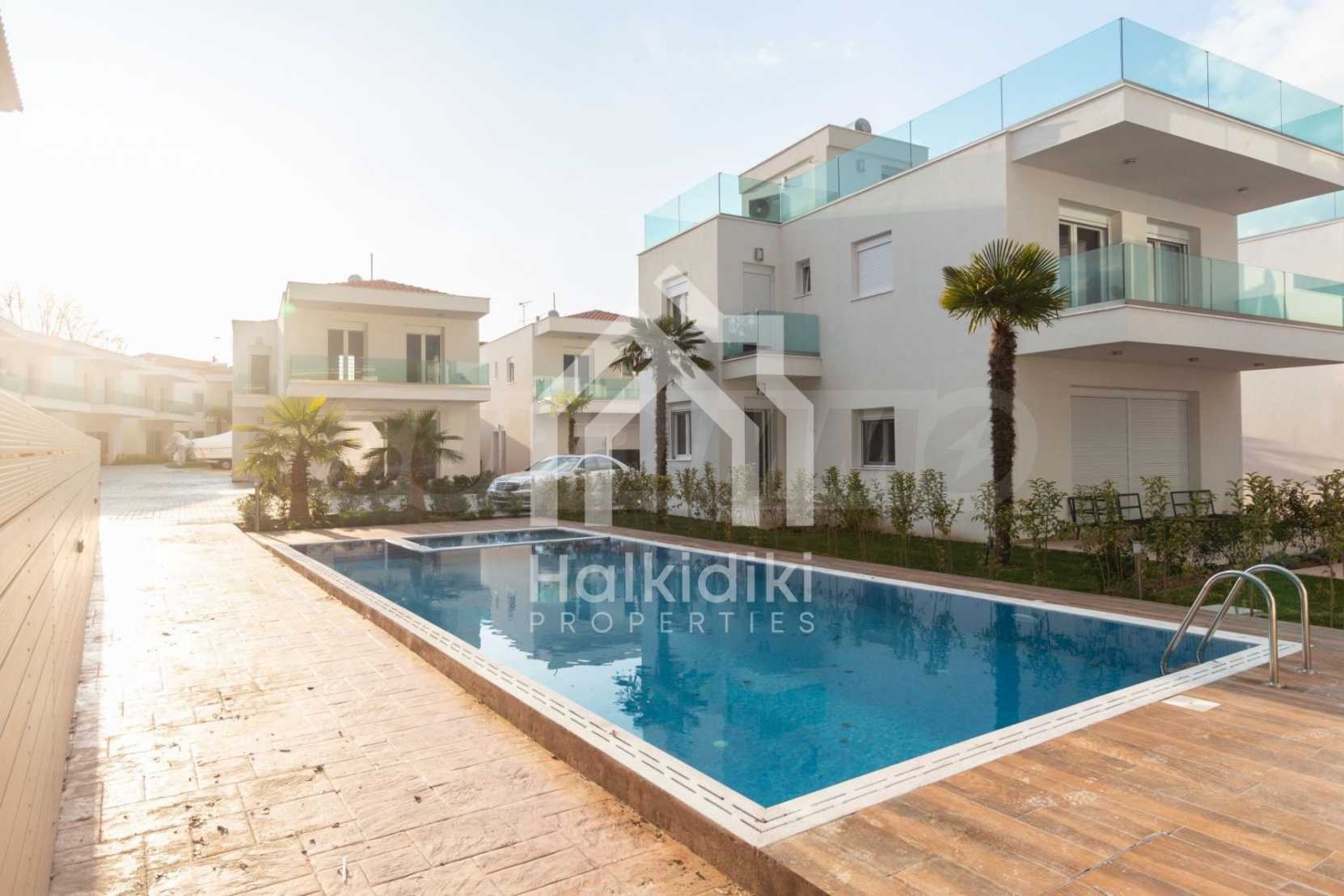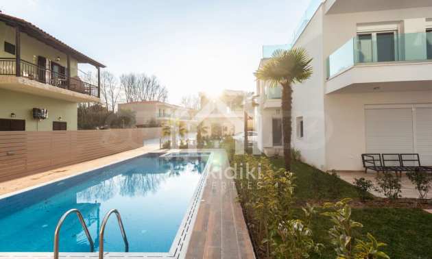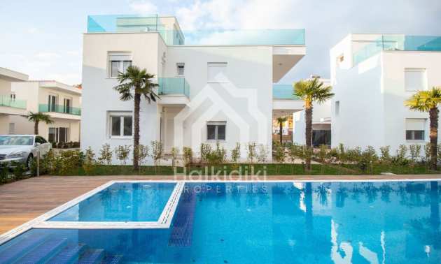 Вила, Ситония, 116 кв.м, морска панорама, открит изглед, гледка към градината, открито поле, Ъглов имот, Вътре в селото, Гледка към морето, Близо до морето, Ограда, Паркинг, Автоматично поливане, Моделирани външни пространства, Оборудвани килери, Обществен басейн навън, Обзаведен, Бяла Техника, Слънчев нагревател, Просторна градина, Прозорци, Предварителна инсталация на Алармена система, Без ДДС, Самостоятелна къща в комплекс, Еърна, Големи балкони, Новопостроена, Луксозна, Модерна конструкция, висок таван