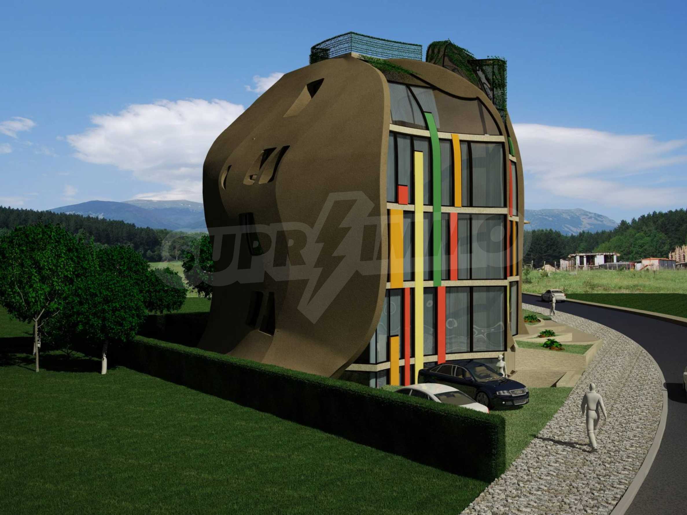Техническа инфраструктура: лице на асфалтов път; ток (чисто нов кабел по границата на парцела), вода, оптичен кабел (интернет/тел./ТВ); канализация в района няма – визата за проектиране предписва изгребна яма или минипречиствателна станция. 5) Параметри проект: a) Застроена площ около 305 м2; b) РЗП 2000 м2 (четрири етажа + подпокривен етаж + покривна тераса); c) артистичен амфитеатралем двор 600 м2; d) няма загуба на РЗП чрез подземни гаражи, тъй като проектът е за апартаментен хотел с облекчени изисквания относно места за паркиране; около 3 м. сервитут на асфалтовата улица пред парцела с дължина около 70 м. дава възможност за паркиране на 15 автомобила + 10 паркоместа върху собствения имот.