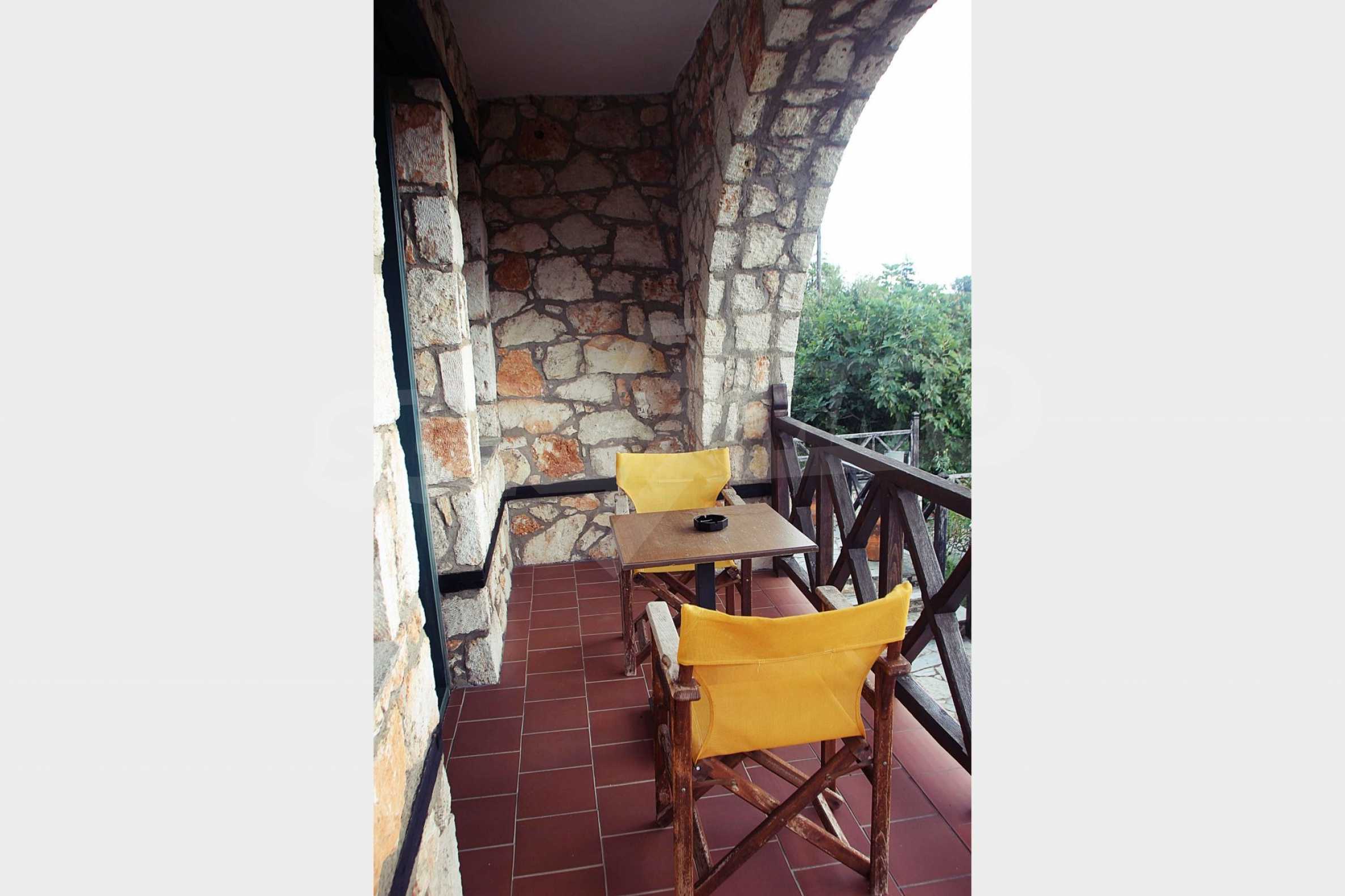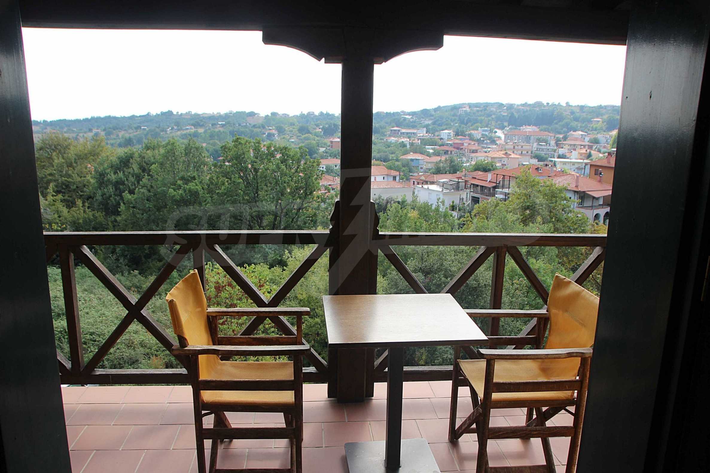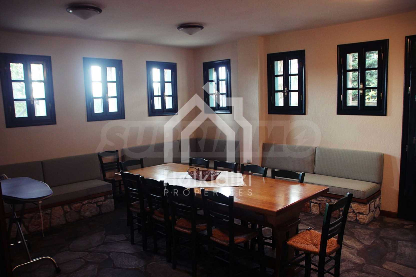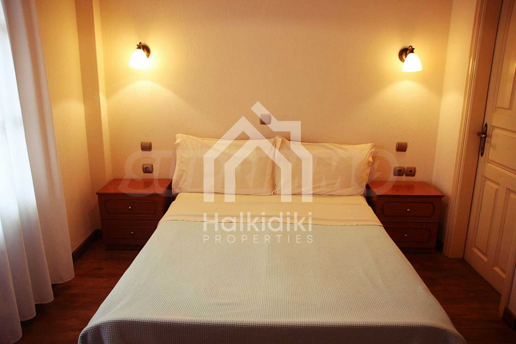 Уникална, панорамна вила в Атон, Халкидики. Имотът е 235 кв.м, има южна ориентация и е разделен на три нива. Състои се от три големи дневни, кухня, четири големи спални и три бани. Той е напълно обзаведен и оборудван с всички електрически уреди. Разполага с паркинг за две коли и градина от 350 кв.м, с много добре проектирано барбекю. Това е луксозен имот с голямо уединение. Разполага също с дървени и каменни подове, дървена дограма и големи балкони.
