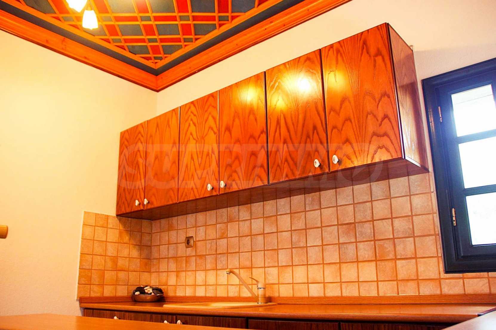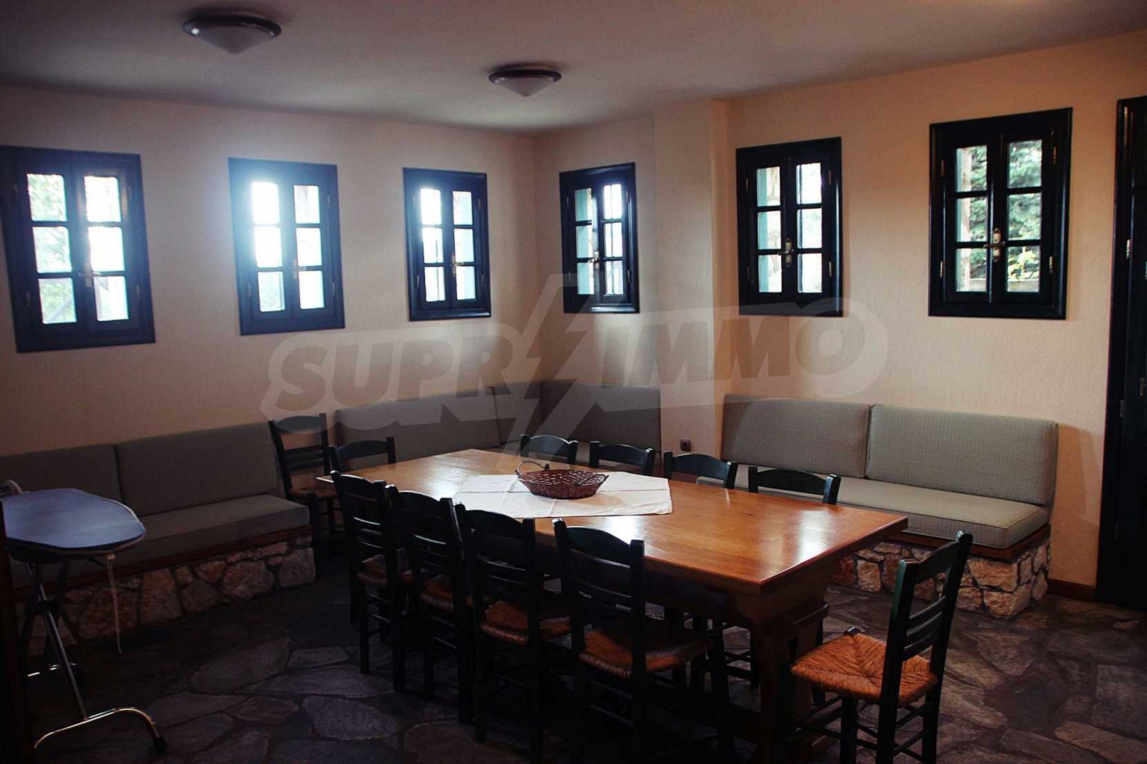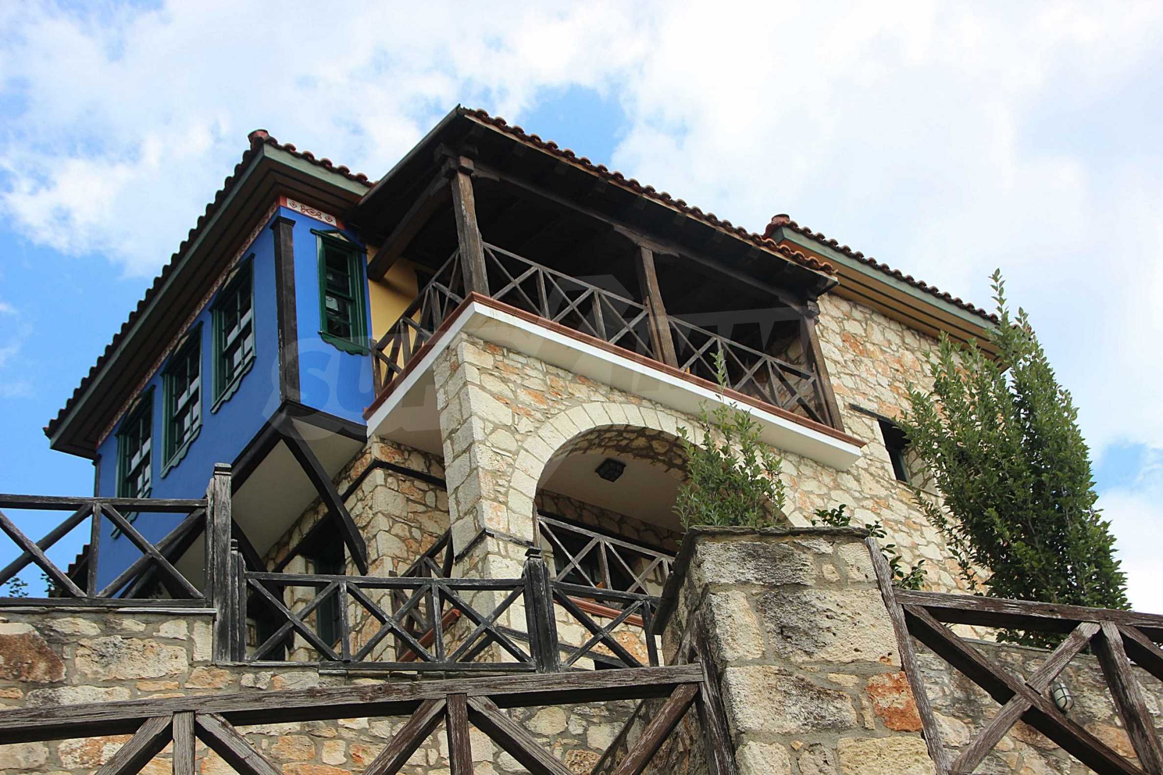 Уникална, панорамна вила в Атон, Халкидики. Имотът е 235 кв.м, има южна ориентация и е разделен на три нива. Състои се от три големи дневни, кухня, четири големи спални и три бани. Той е напълно обзаведен и оборудван с всички електрически уреди. Разполага с паркинг за две коли и градина от 350 кв.м, с много добре проектирано барбекю. Това е луксозен имот с голямо уединение. Разполага също с дървени и каменни подове, дървена дограма и големи балкони.