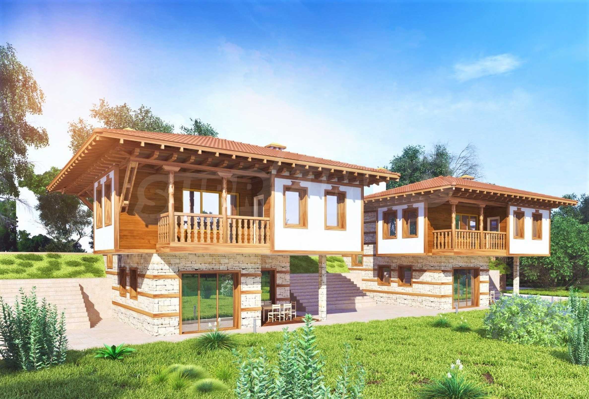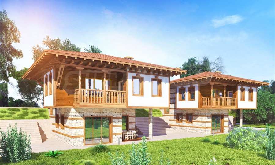 Първият етап на строителството на еко-комплекса е стартирал в началото на 2020 г. Архитектурният образ на къщите може да се отнесе към възрожденската архитектура. На лице са характерните за този стил материали и визия с еркери и изнесени стрехи на покрива. Първото ниво на сградата е решено с облицовка от камък. Вторият етаж е с бяла минерална мазилка и дъсчена обшивка. Присъстват и характерните кантирания на ъглите, стените и рамките на прозорците със сантрачи и дървен материал. Покривът е скатен с дървена конструкция и декоративни елементи.