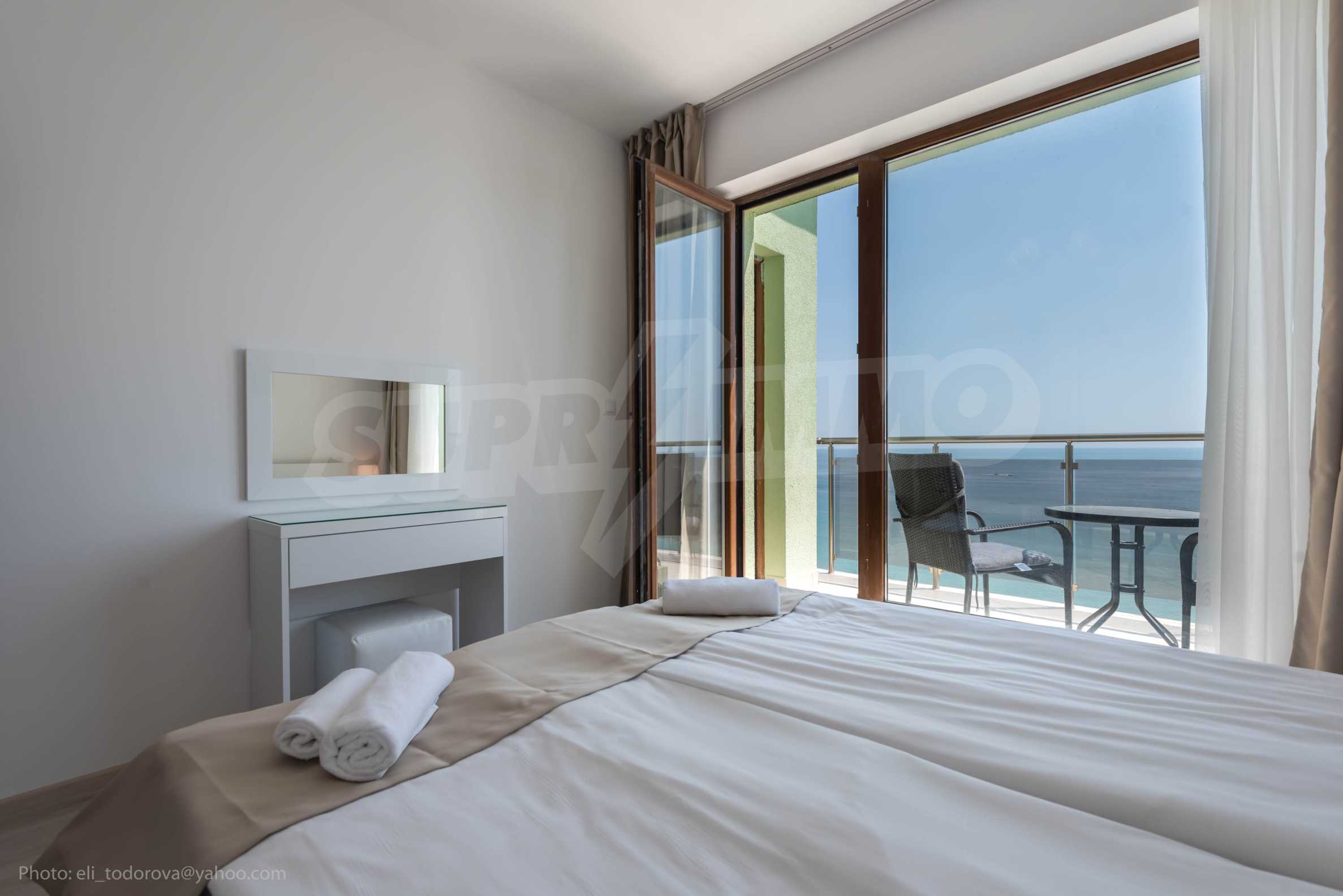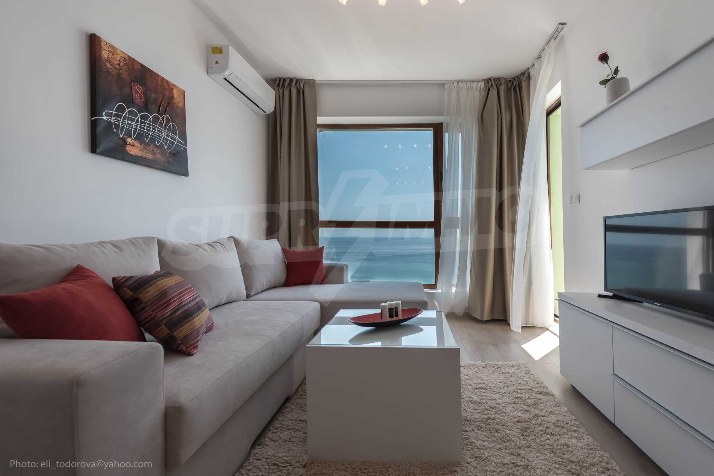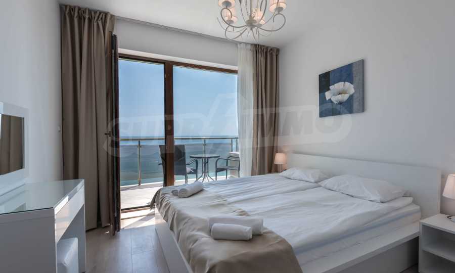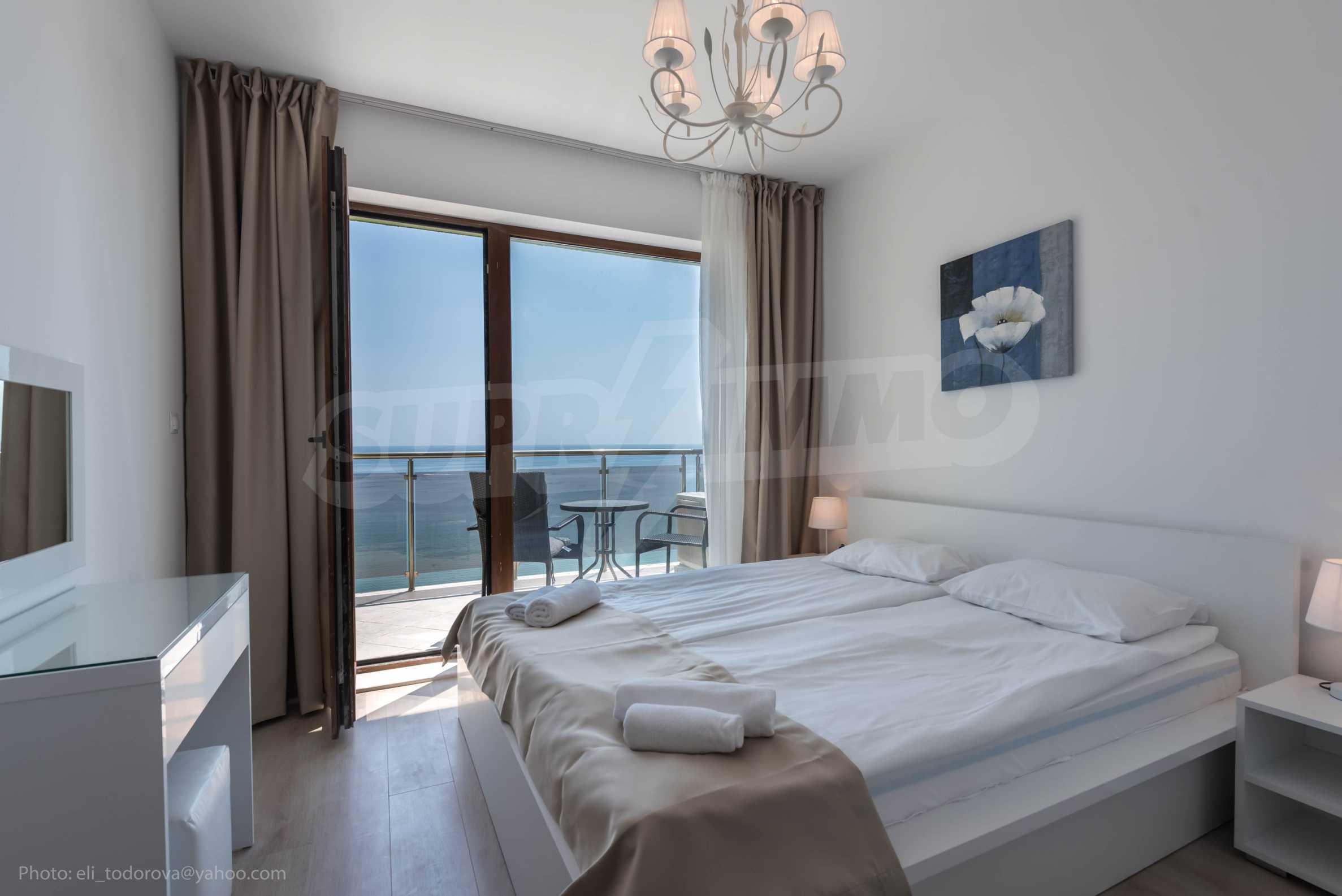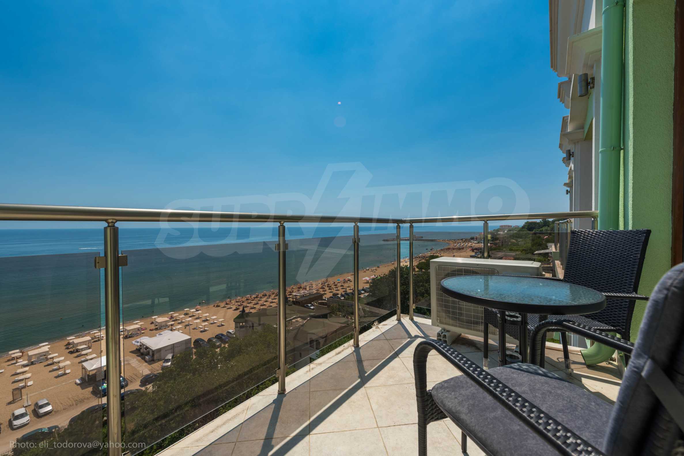 Фронтална гледка към морето и плажа - двустаен апартамент под наем, в нова сграда на брега на морето.