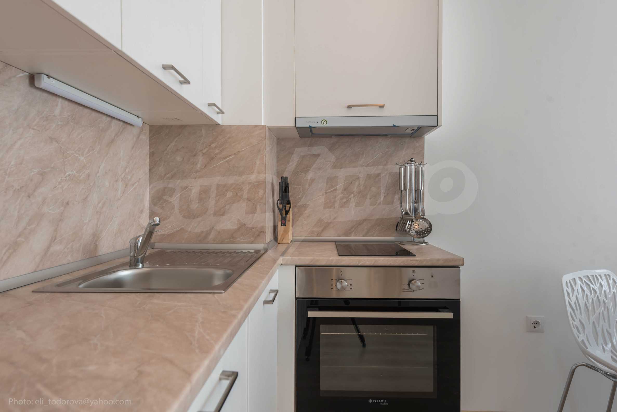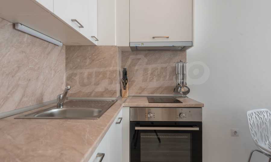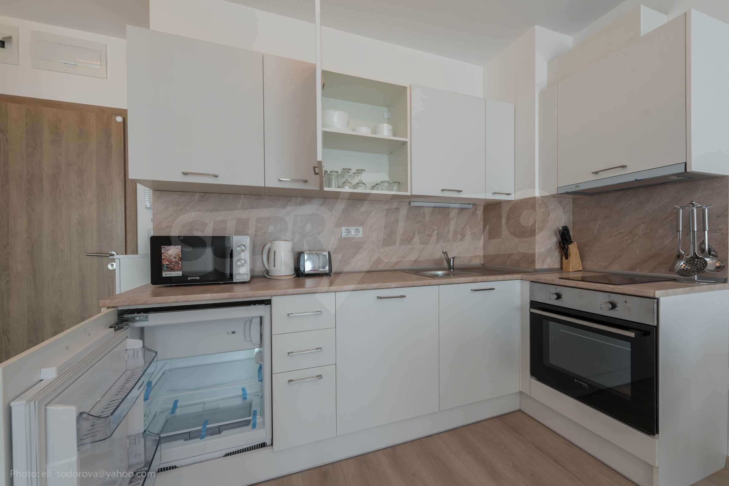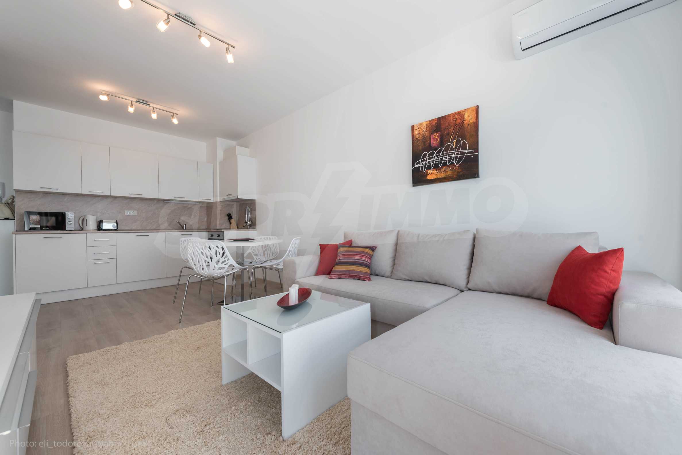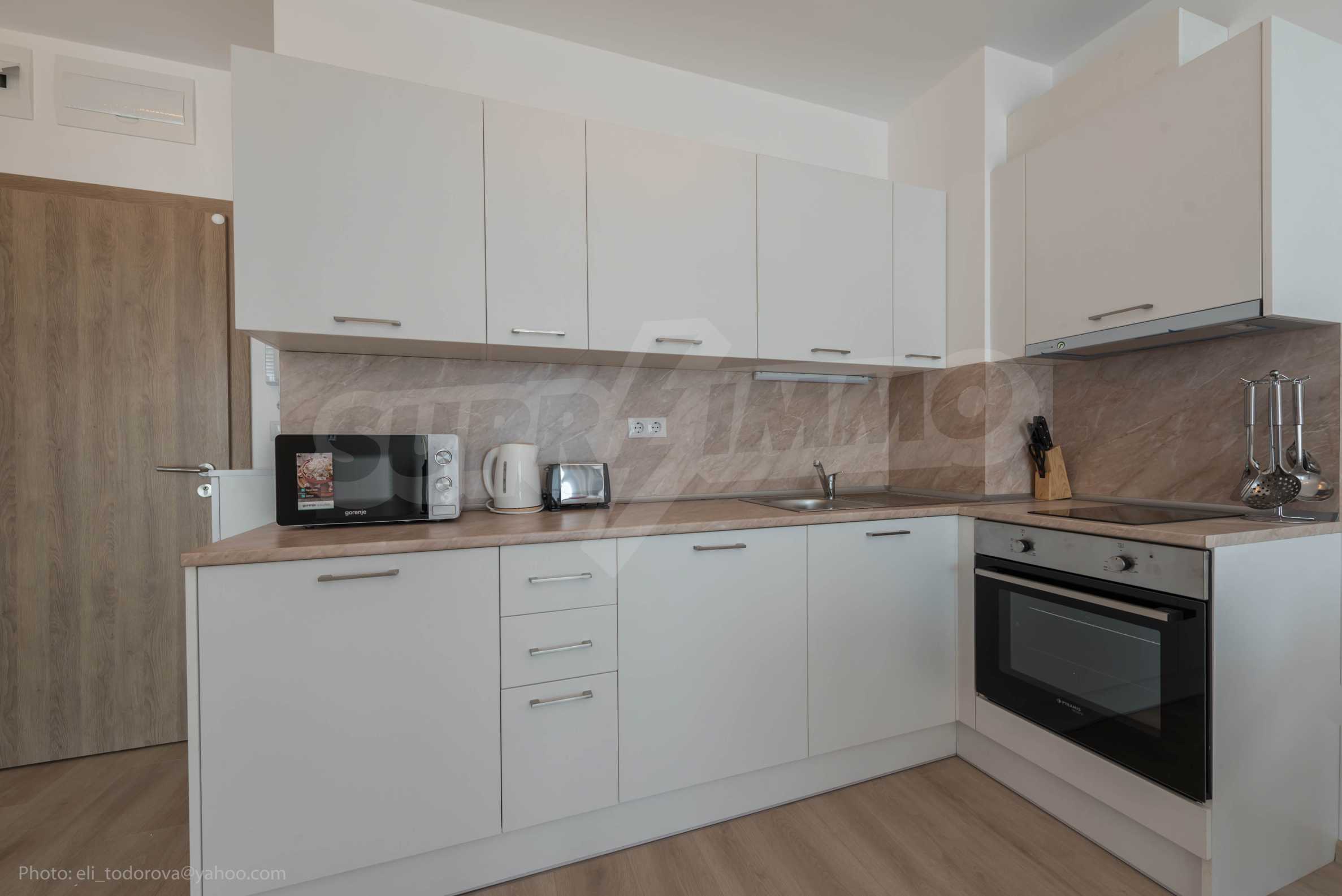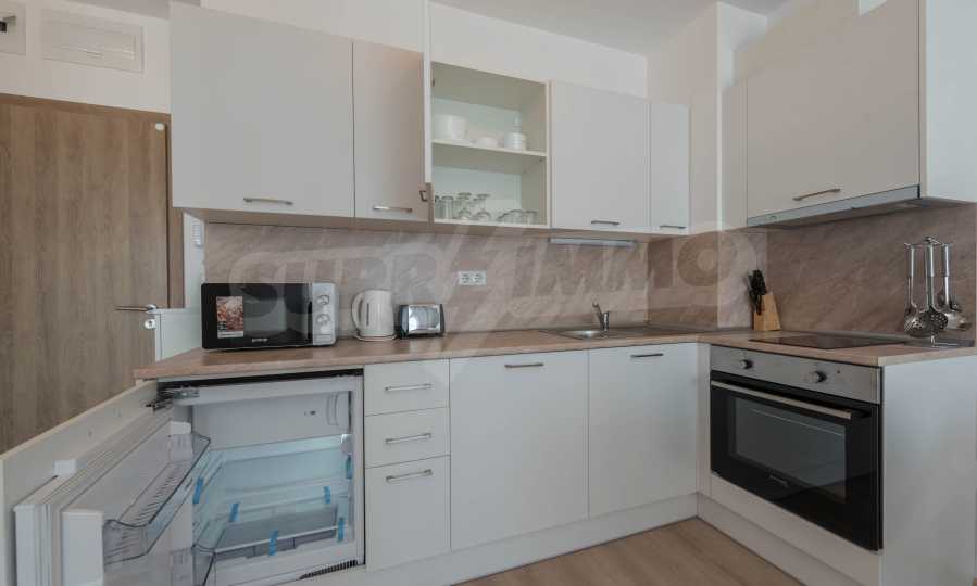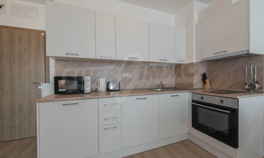 Апартаментът се състои от светла всекидневна с кухня, спалня, баня и тераса с изглед към морето. Кухнята е напълно оборудвана с шкафове и вградени електрически уреди - хладилник, фурна, котлони и аспиратор, в хола има инверторен климатик.