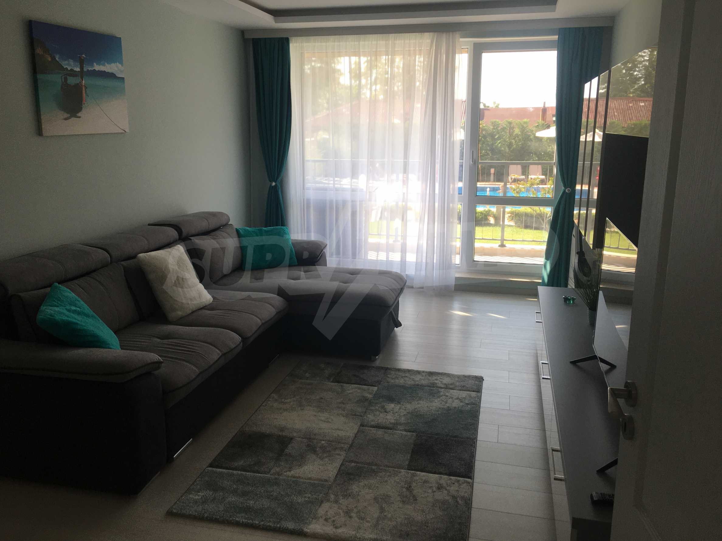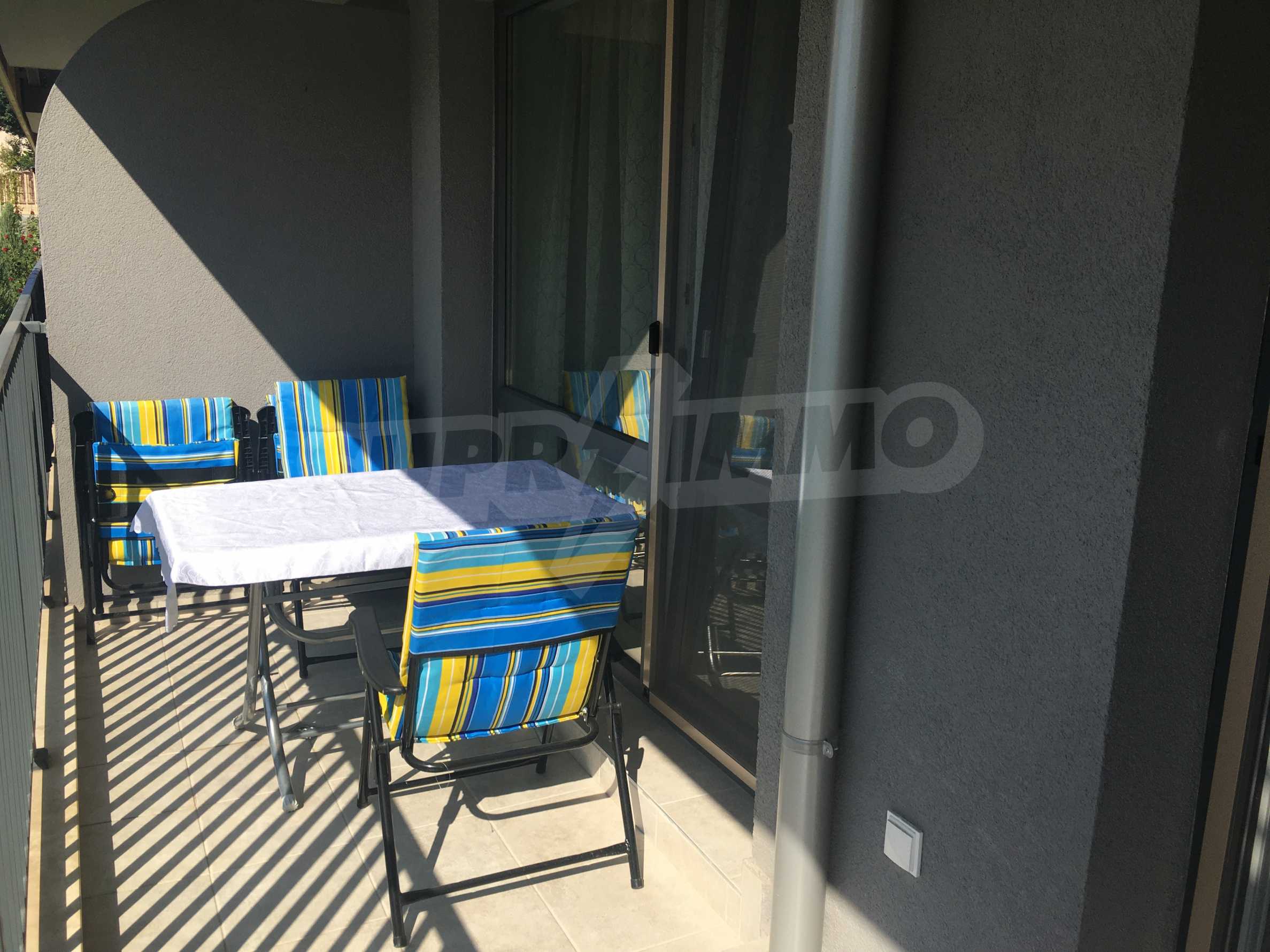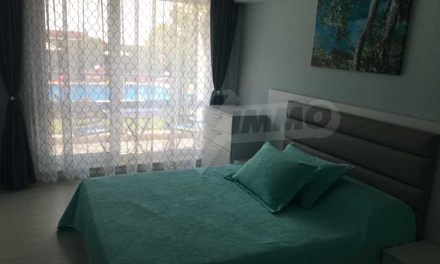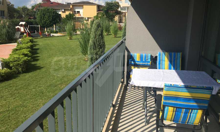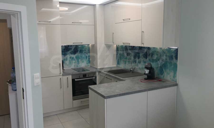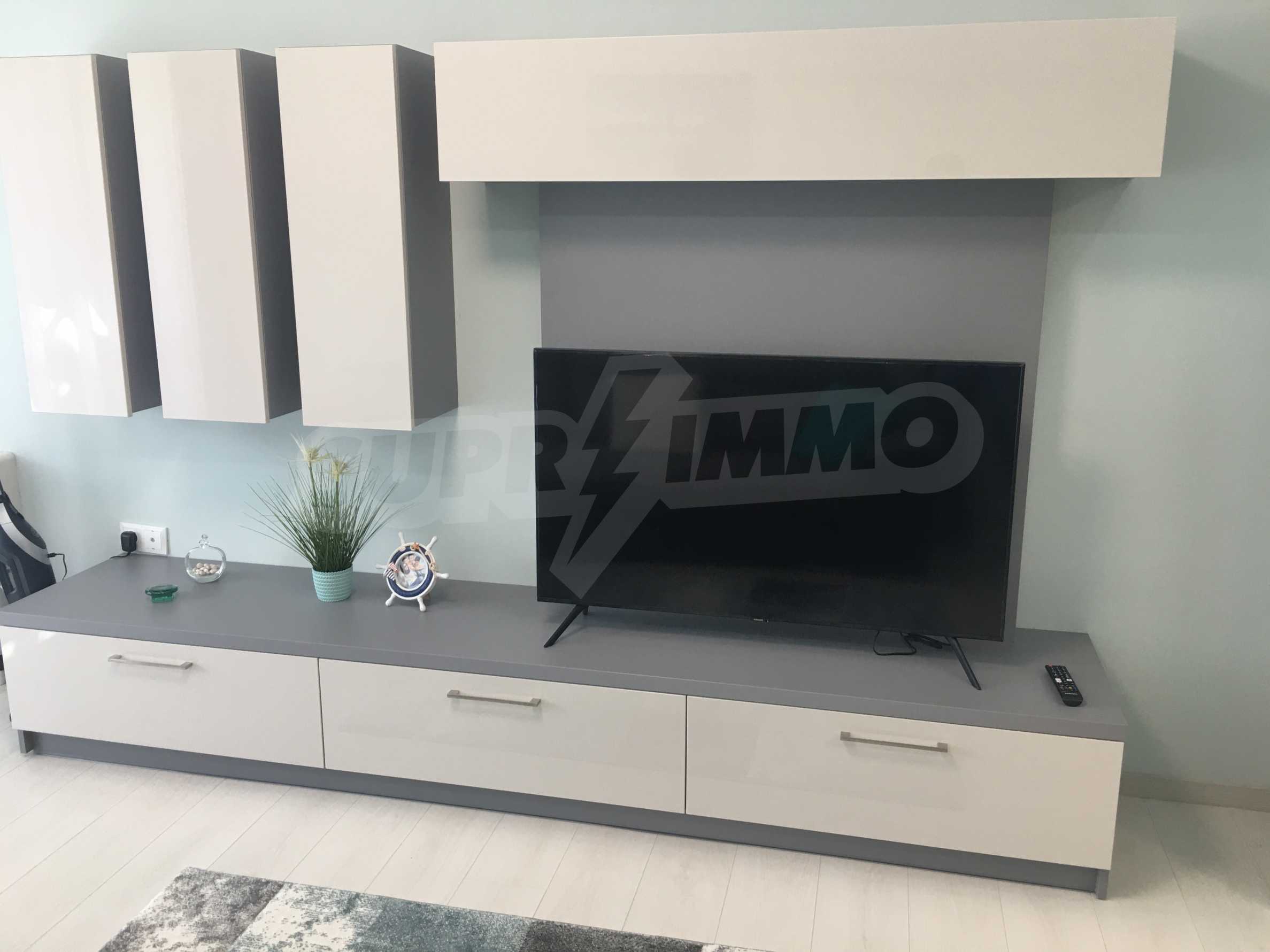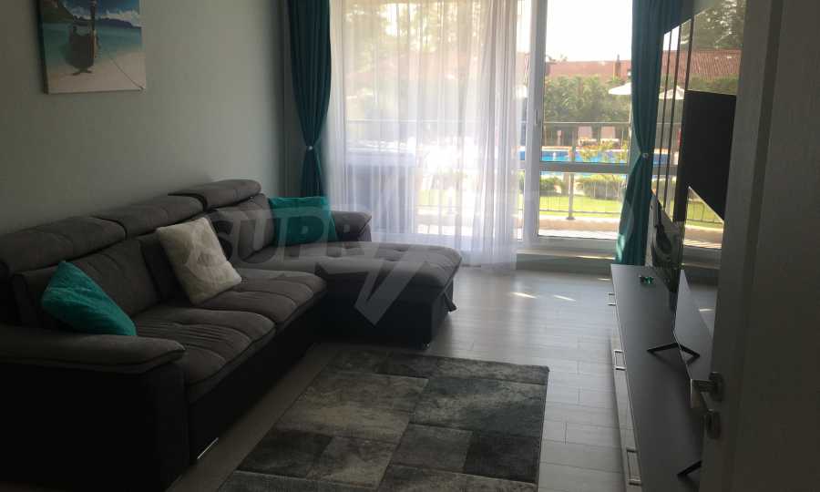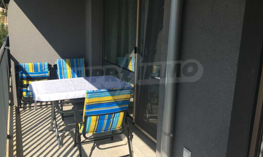 Апартаментът е приятно мебелиран, с отлични електроуреди и е готов за нанасяне. Състои се от просторна спалня с изход на терасата, обширна баня с душ кабина, кухненски бокс с всичко необходимо и уютен хол с изход към терасата.