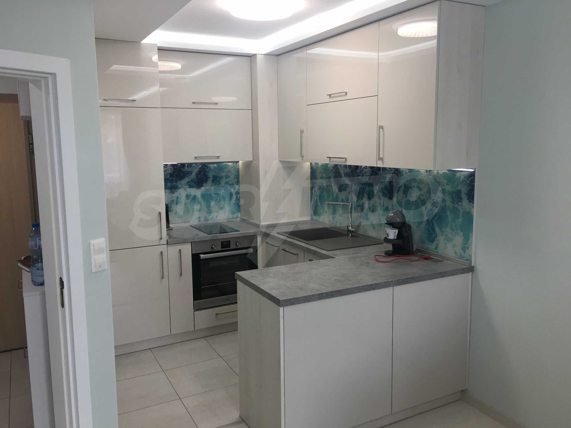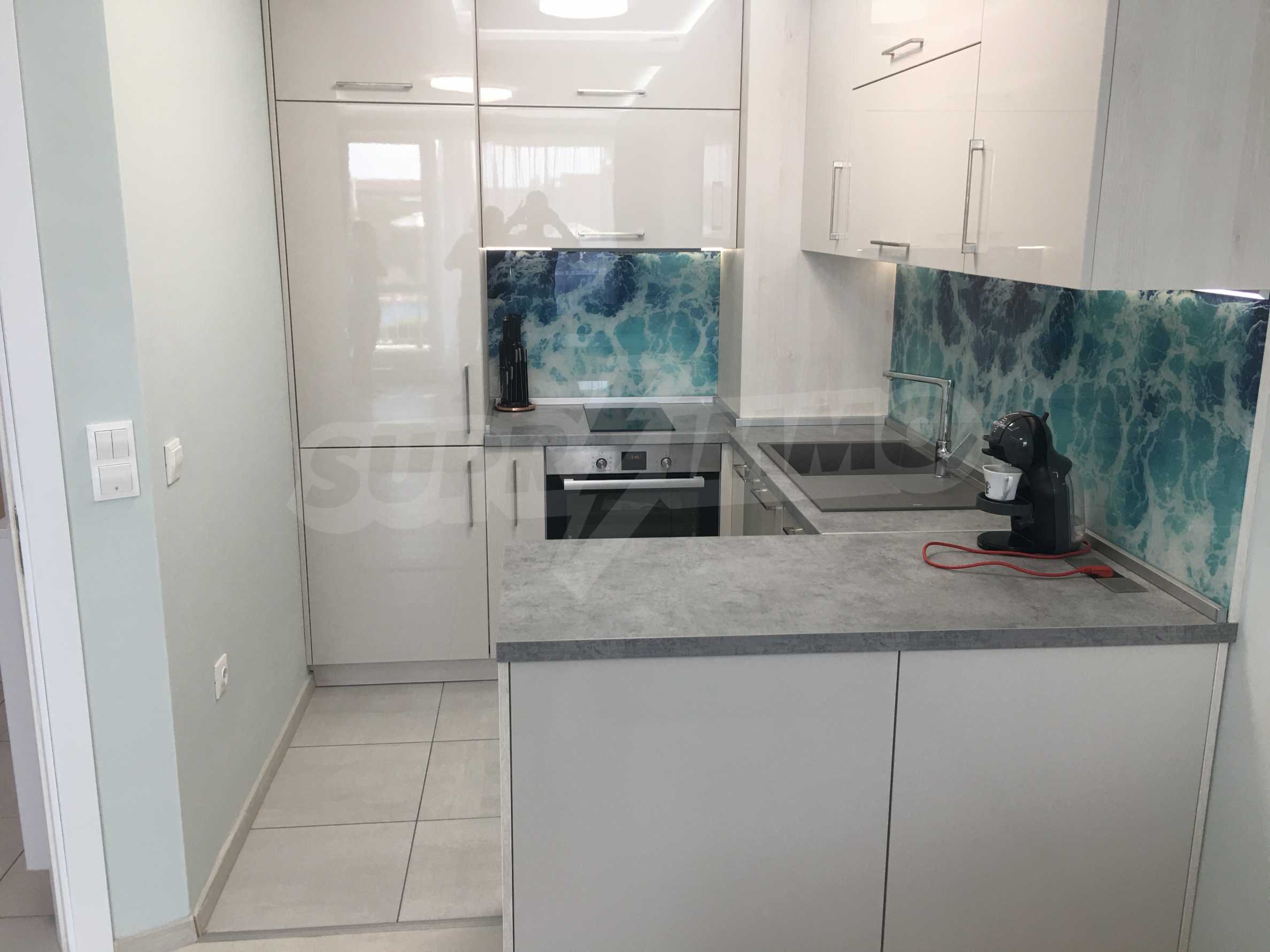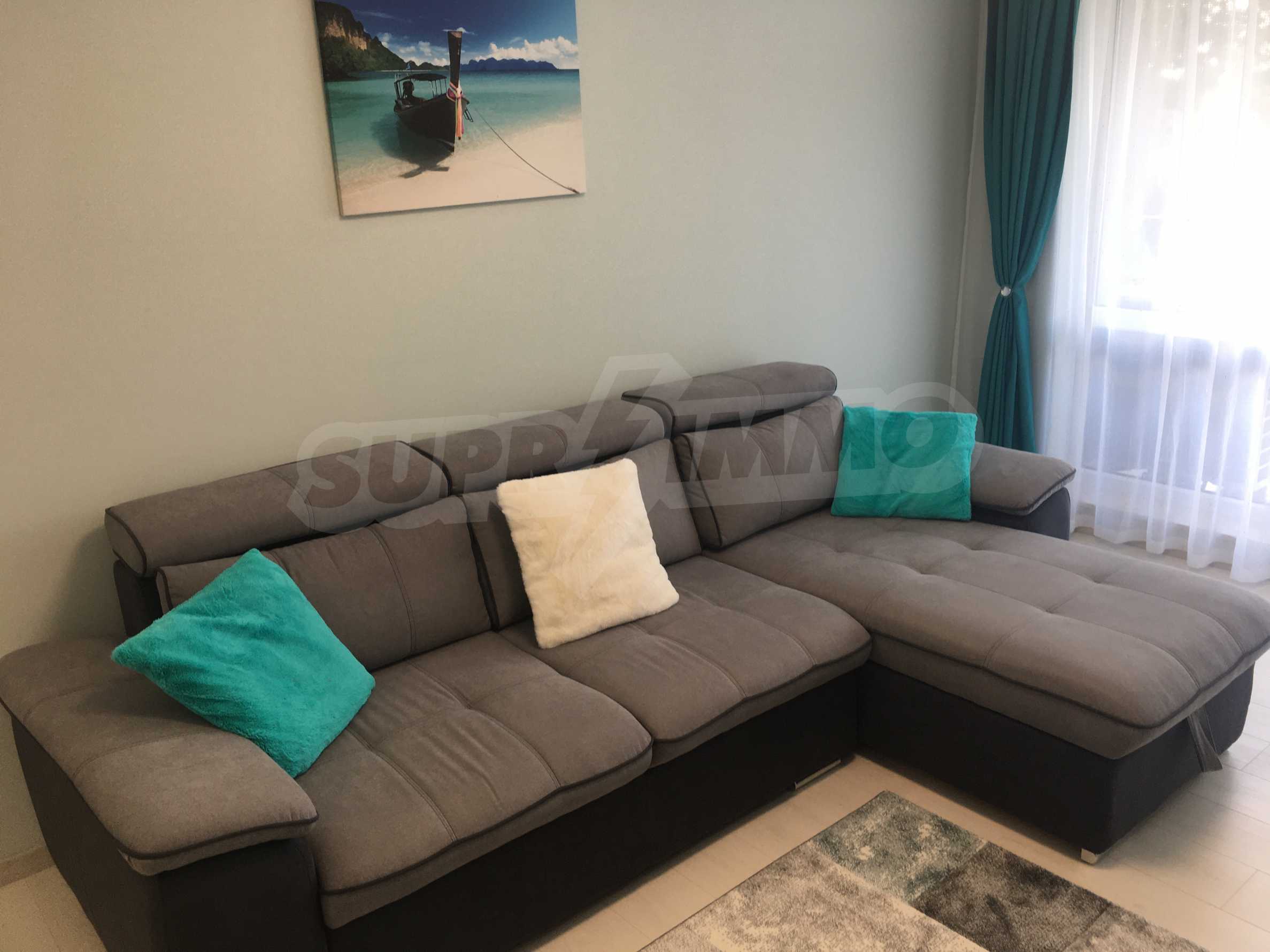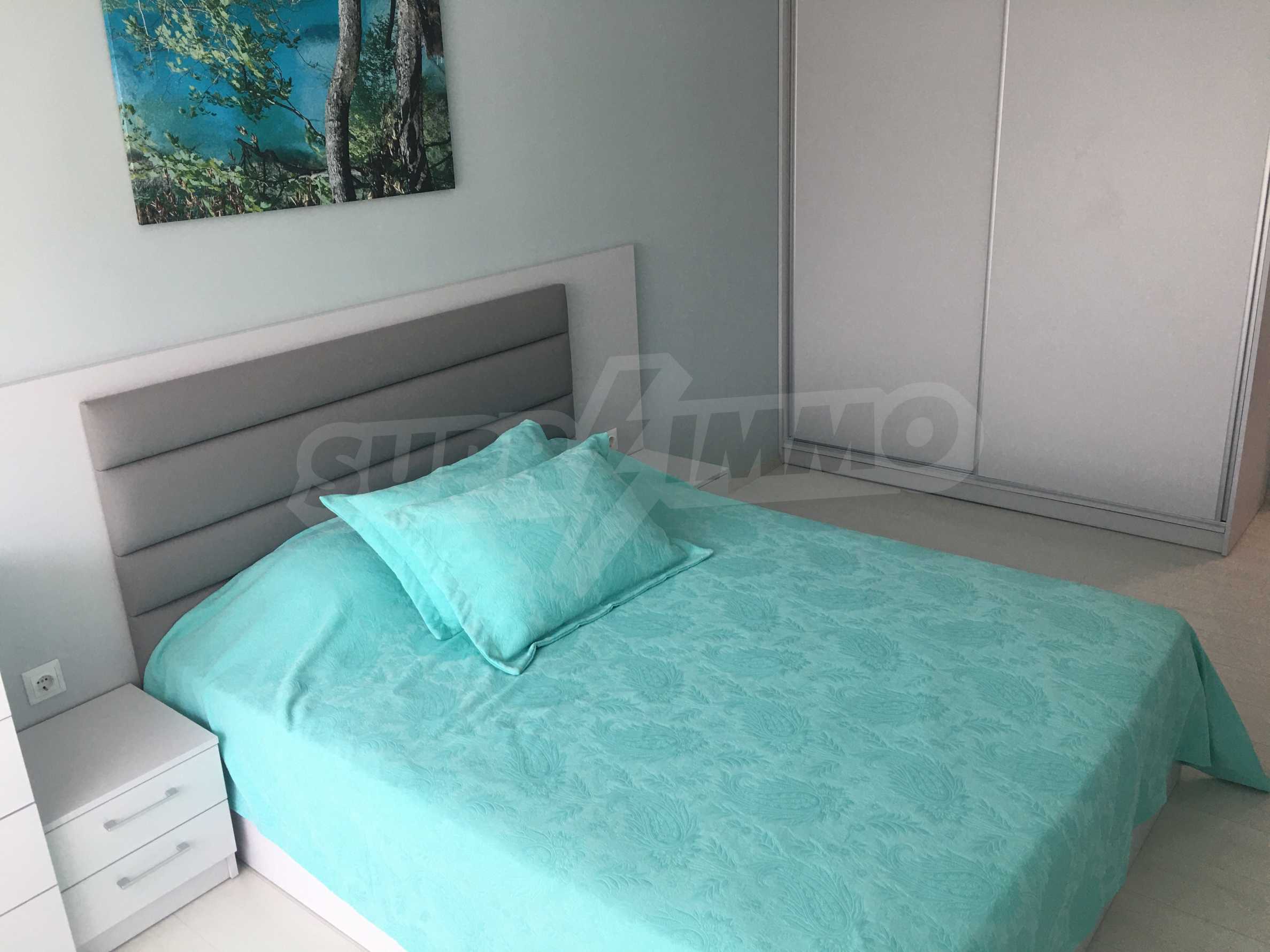 Апартаментът е приятно мебелиран, с отлични електроуреди и е готов за нанасяне. Състои се от просторна спалня с изход на терасата, обширна баня с душ кабина, кухненски бокс с всичко необходимо и уютен хол с изход към терасата.