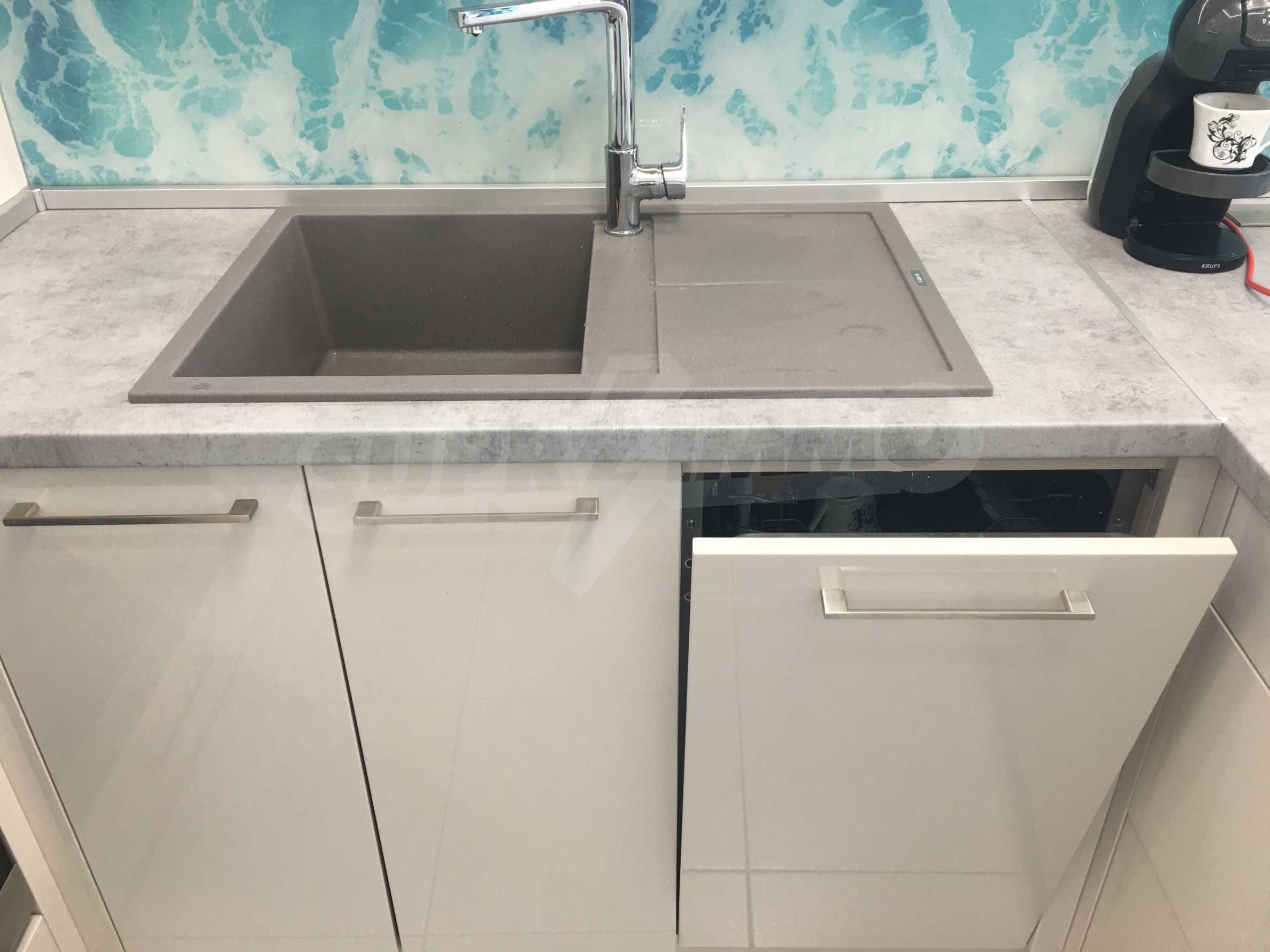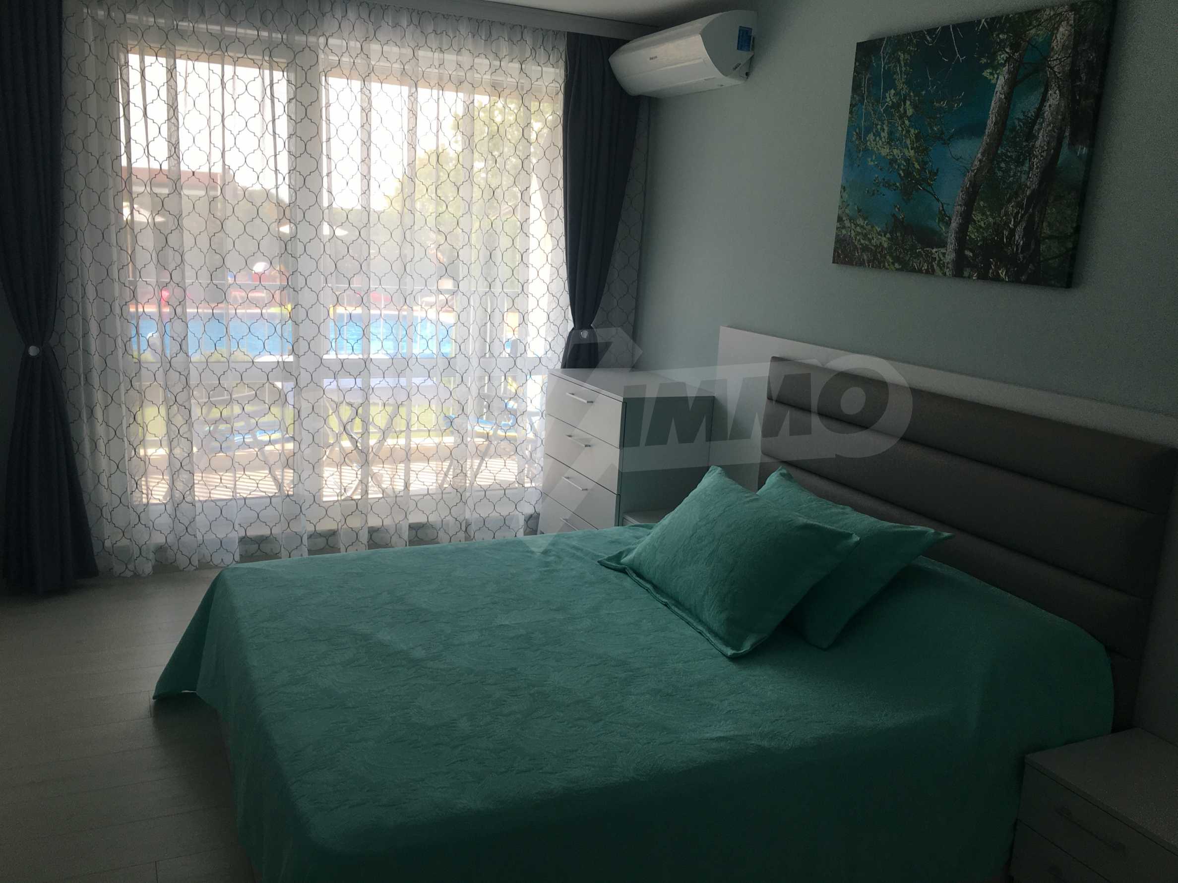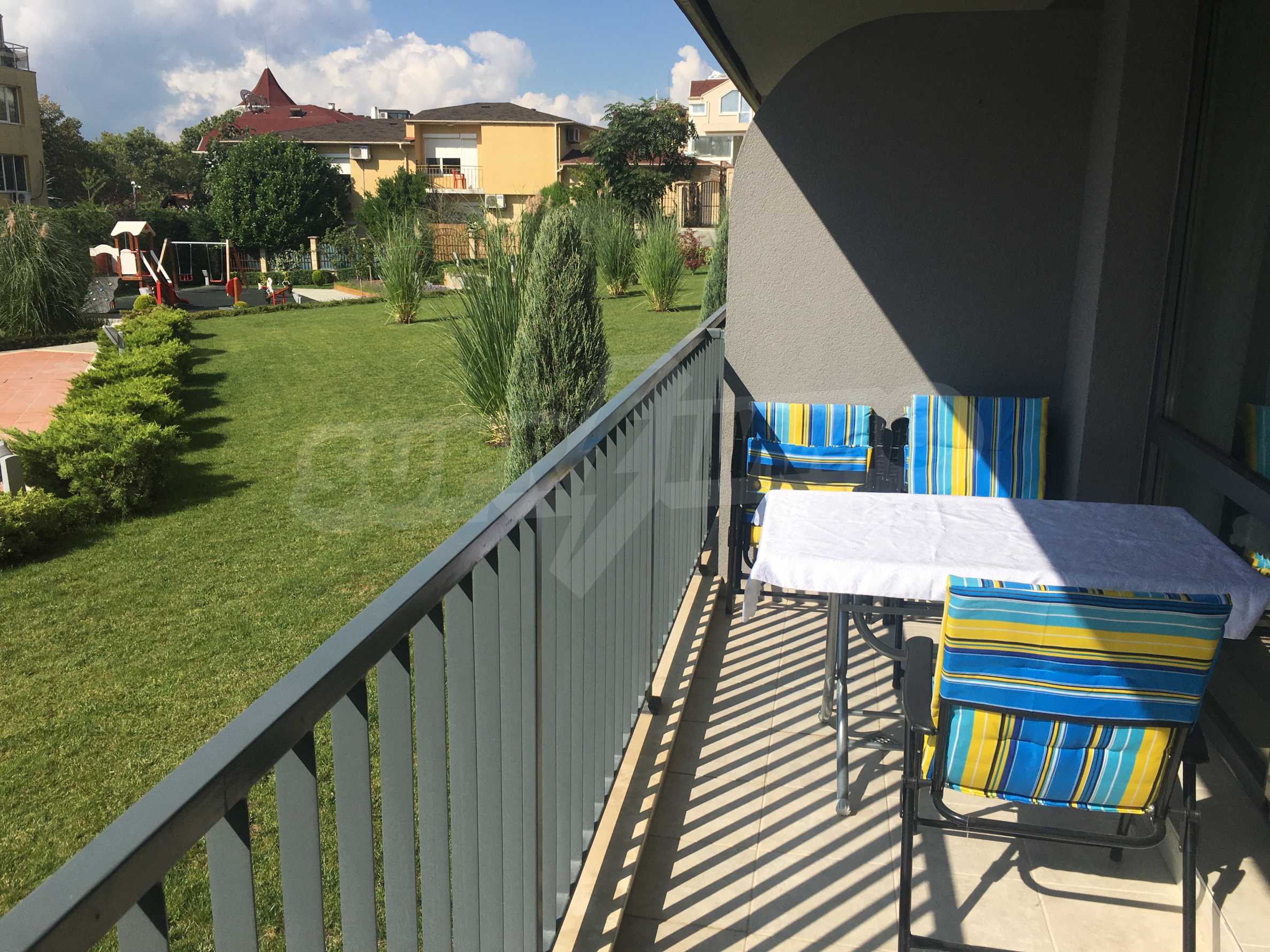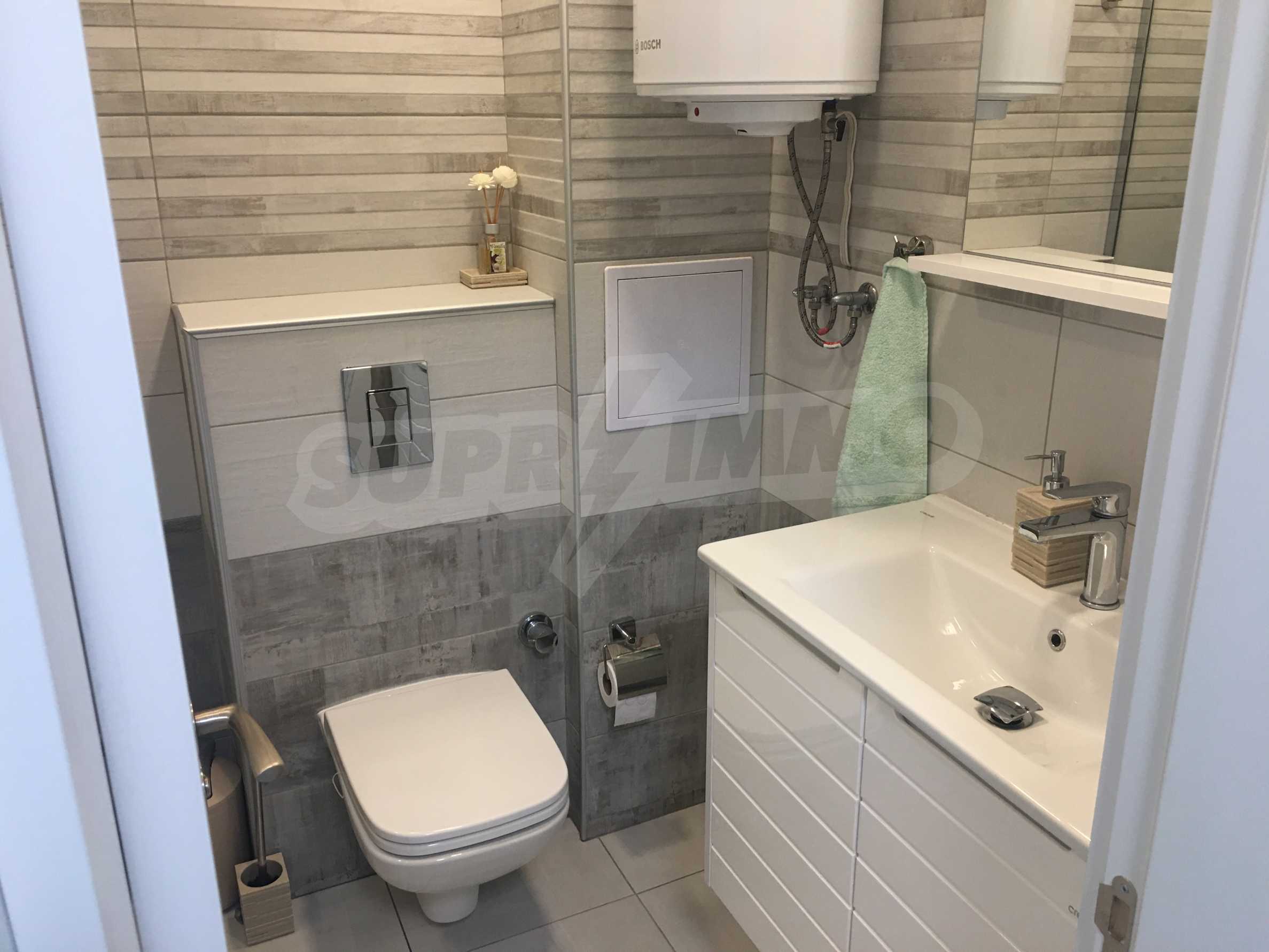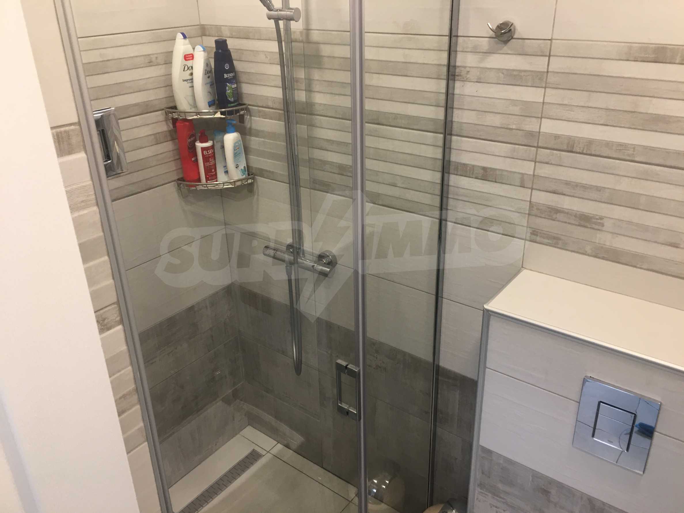 Апартаментът е приятно мебелиран, с отлични електроуреди и е готов за нанасяне. Състои се от просторна спалня с изход на терасата, обширна баня с душ кабина, кухненски бокс с всичко необходимо и уютен хол с изход към терасата.