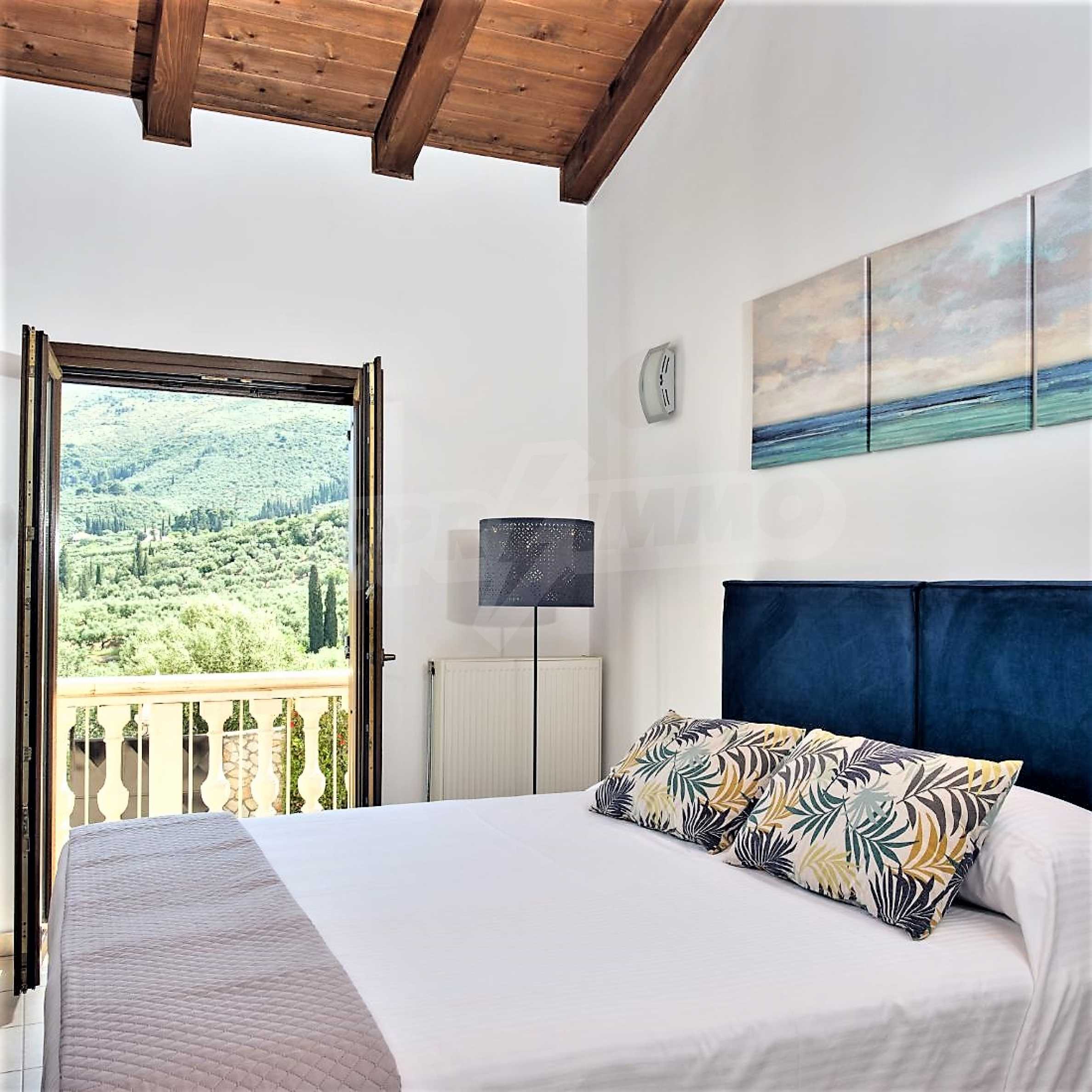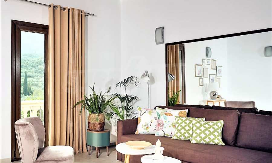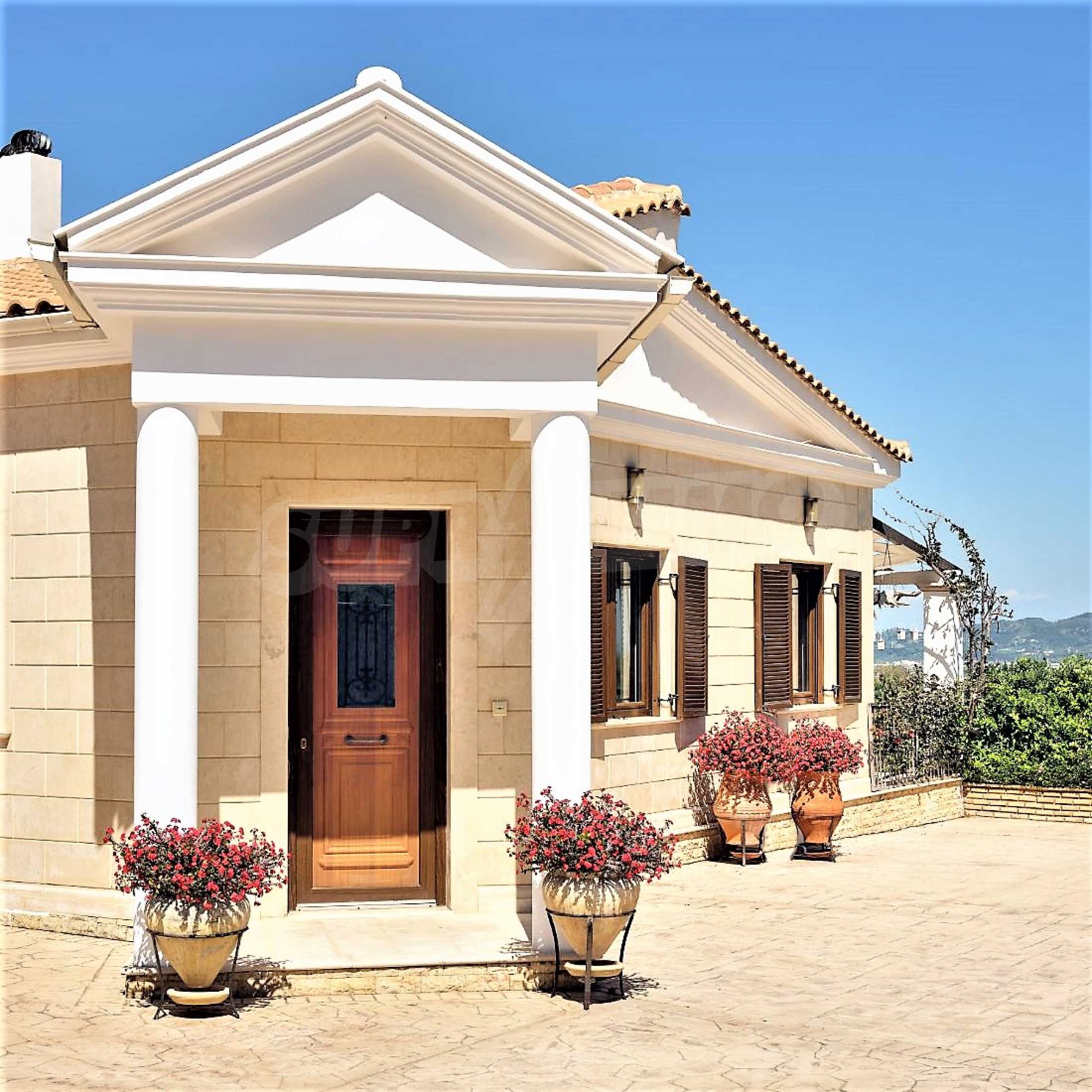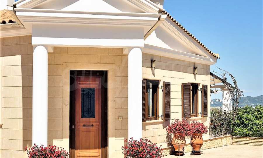 Това е един изключително луксозен имот с красива градина и басейн, както и безкрайна гледка към морето. Вилата е построена на две нива и се състои от 4 спални, 4 бани, 2 дневни и просторна кухня., обширни тераси и веранди, лятна кухня и външни кътове за отдих. Имотът е разположен на върха на частен хълм с безпрепятствен изглед към Йонийско море, уединен в недокосната, девствена природна среда, но и в непосредствена близост до Лагана, където ще намерите всичко от което имате нужда, магазини, характерни за острова ресторанти и таверни, но също и модерни барове, клубове и кафетерии.