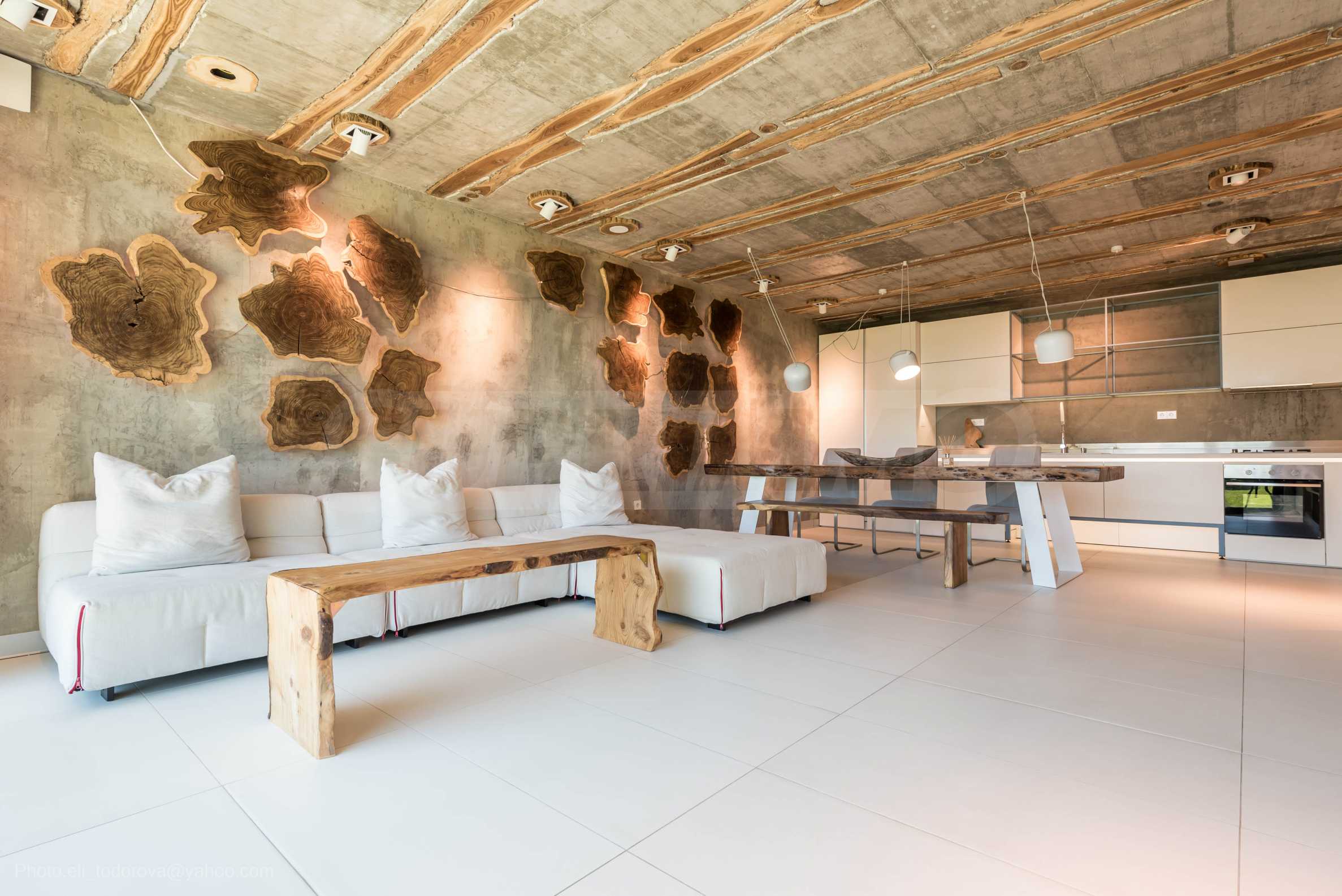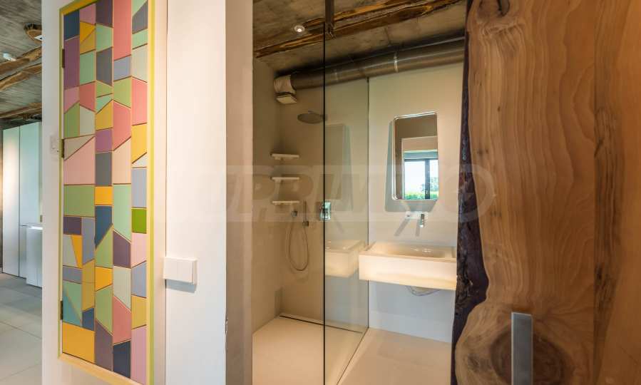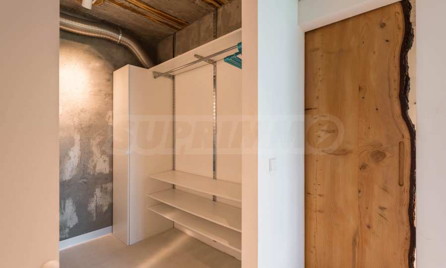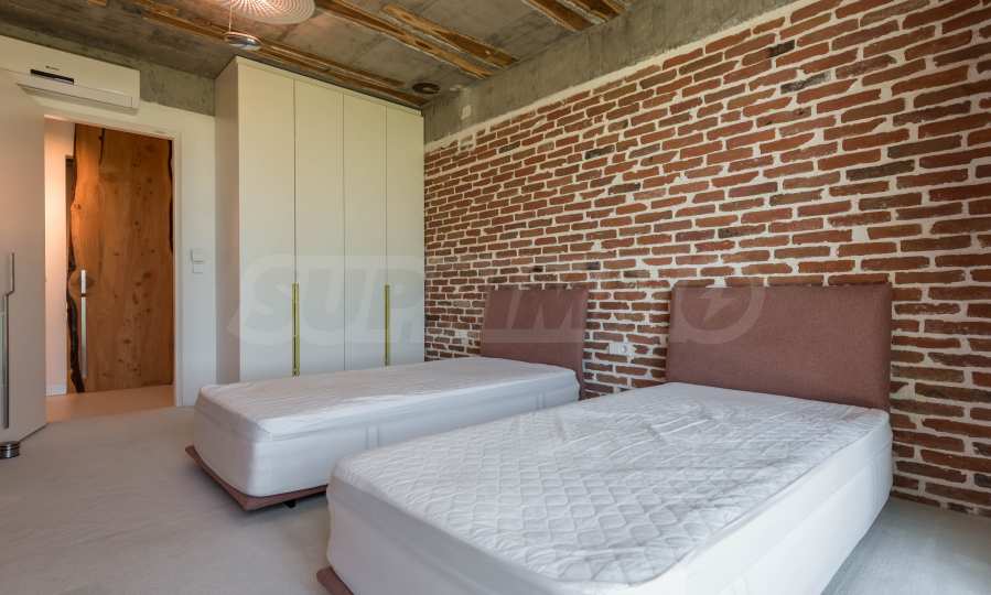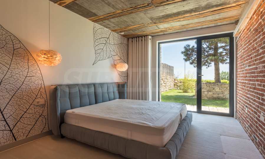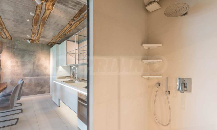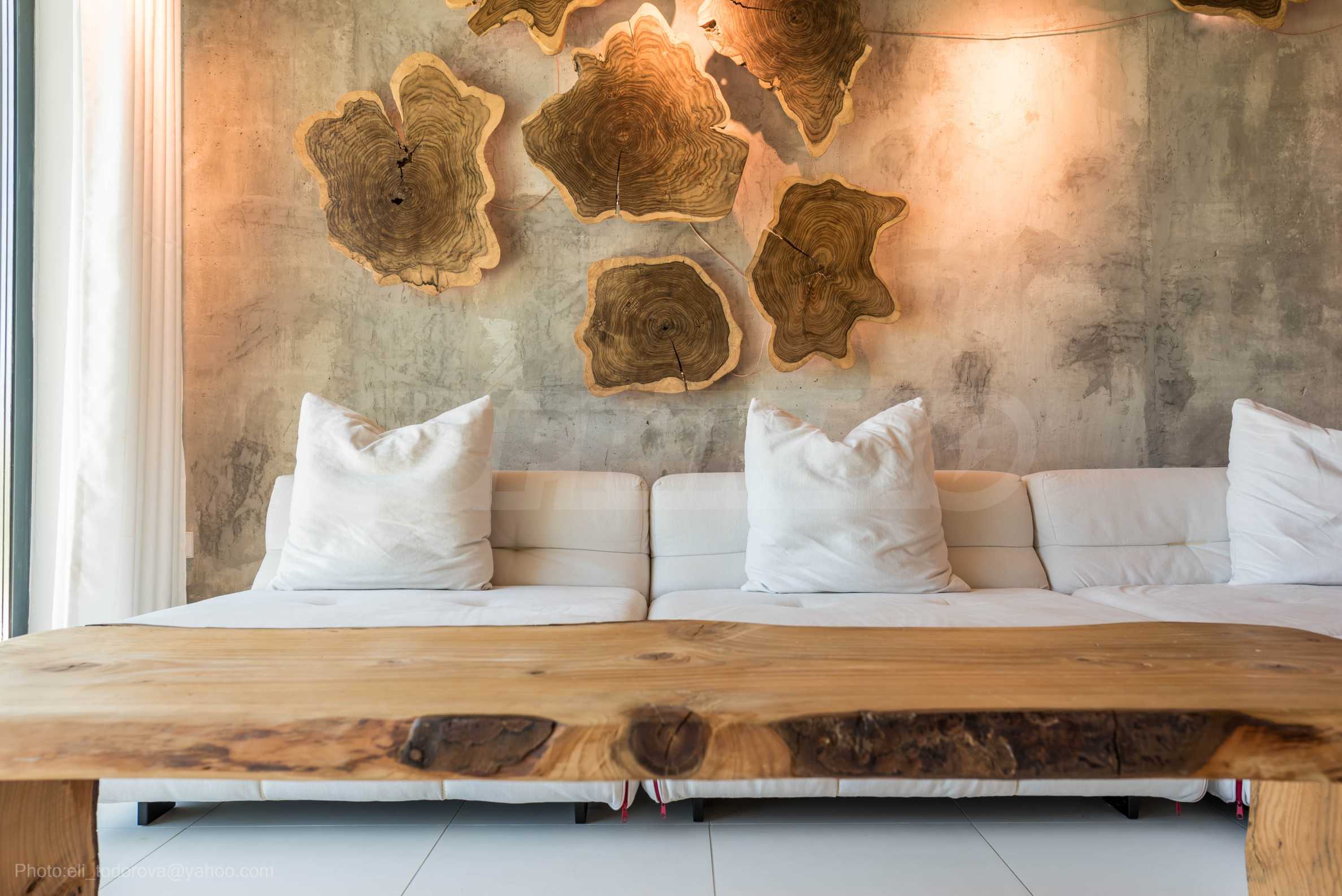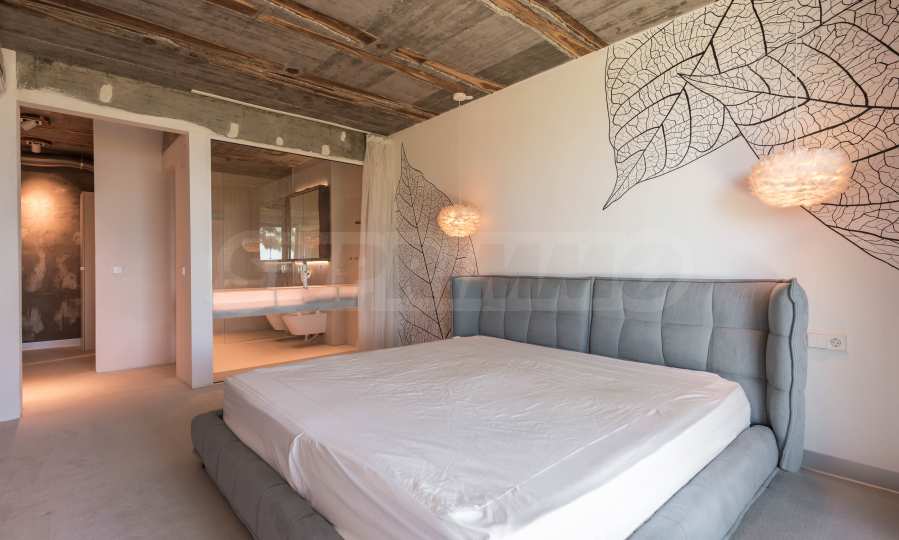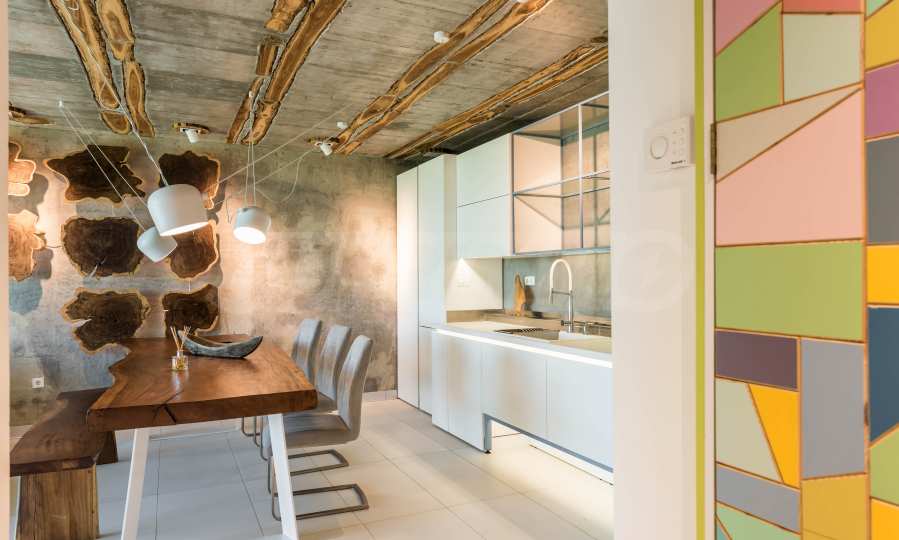 Дизайнът е уникален - естествен и модерен, предизвикателен и светъл, носещ посланието на автономност, релакс и морската атмосфера. В бетоновите плочи по тавана на апартамента са вградени естествени дървени орнаменти от акация. Тухлените стени и бетонът са използвани за естествена декорация, като са допълнително обработени, импрегнирани и грундирани. Мебели, кухня, матраци и дивани, атрактивни плочки, осветителни тела - всички са на известни италиански марки. Вниманието в трапезария е с акцент на екстравагантната маса, изработена по поръчка, от ценно и рядко дърво от Амазонка. Банята е отделена със стъклена врата, за изобилието на слънчева светлина, а всички санитарии са първокласно немско качество.