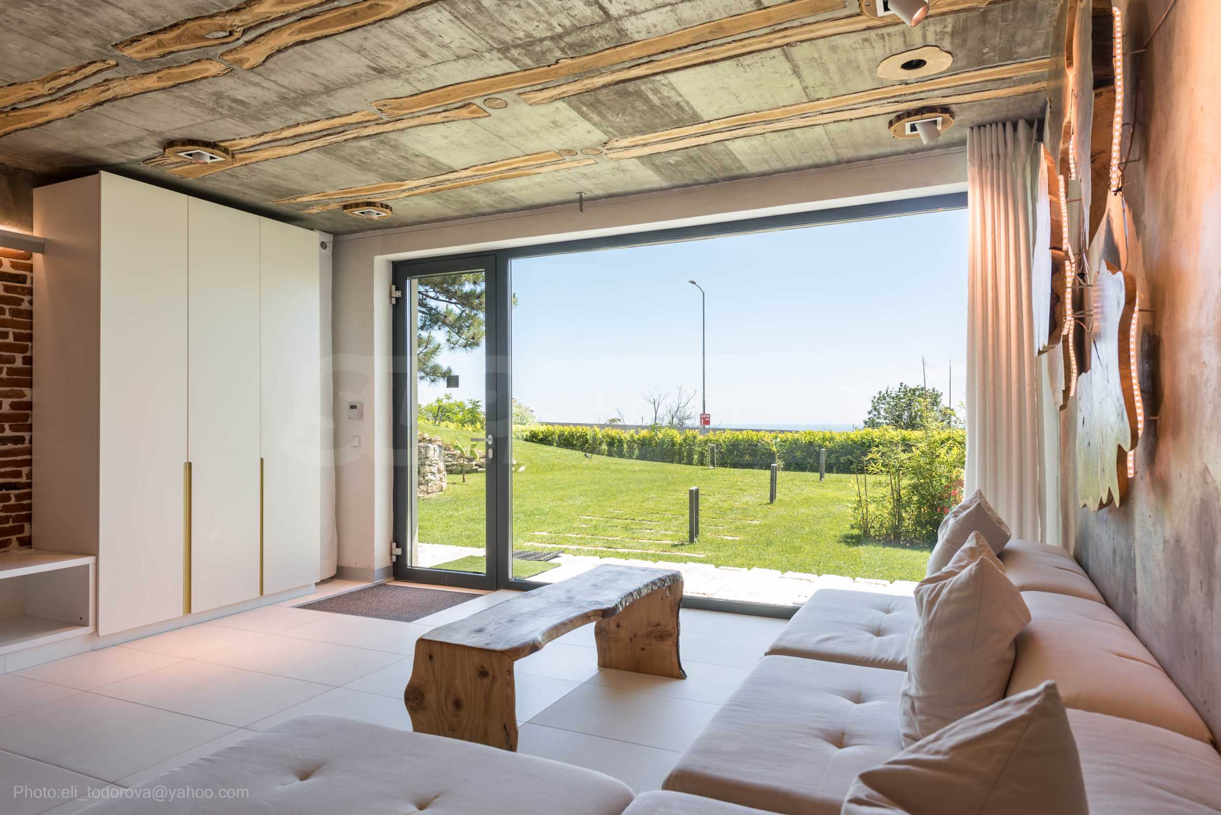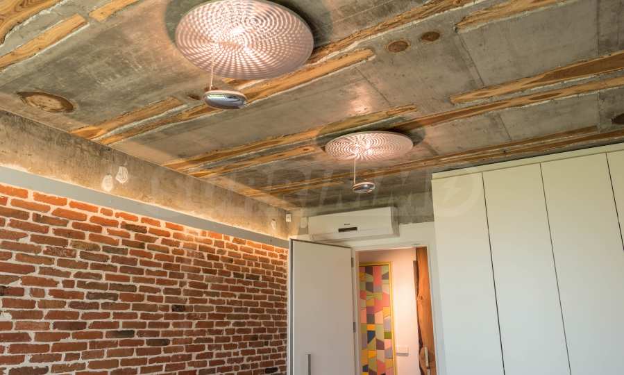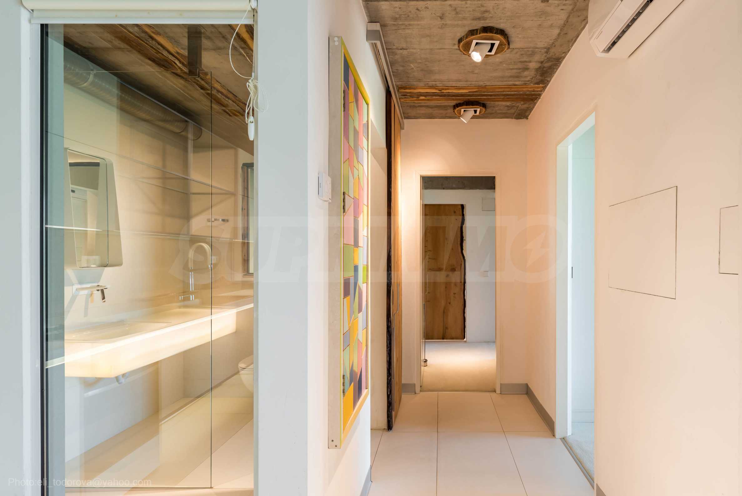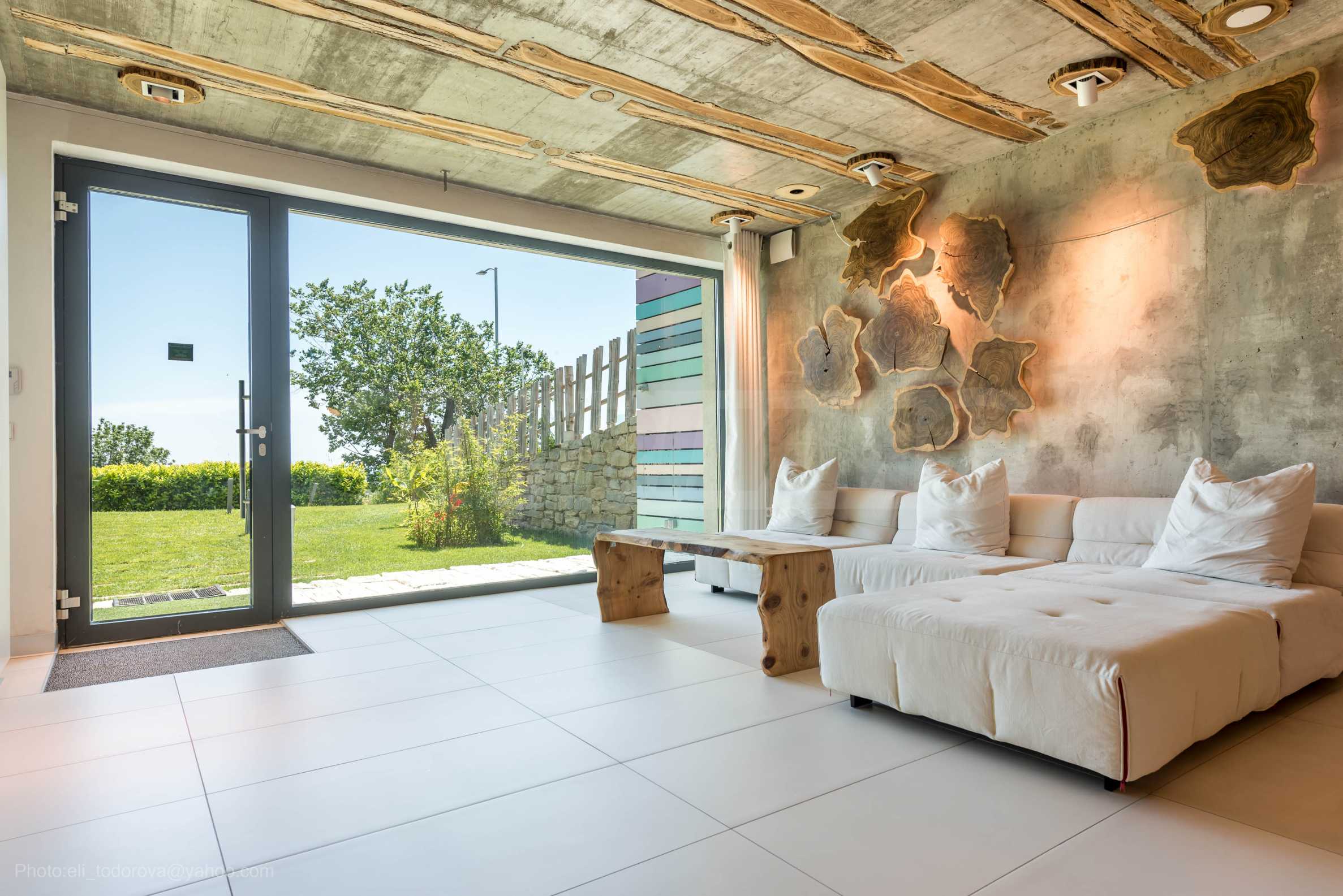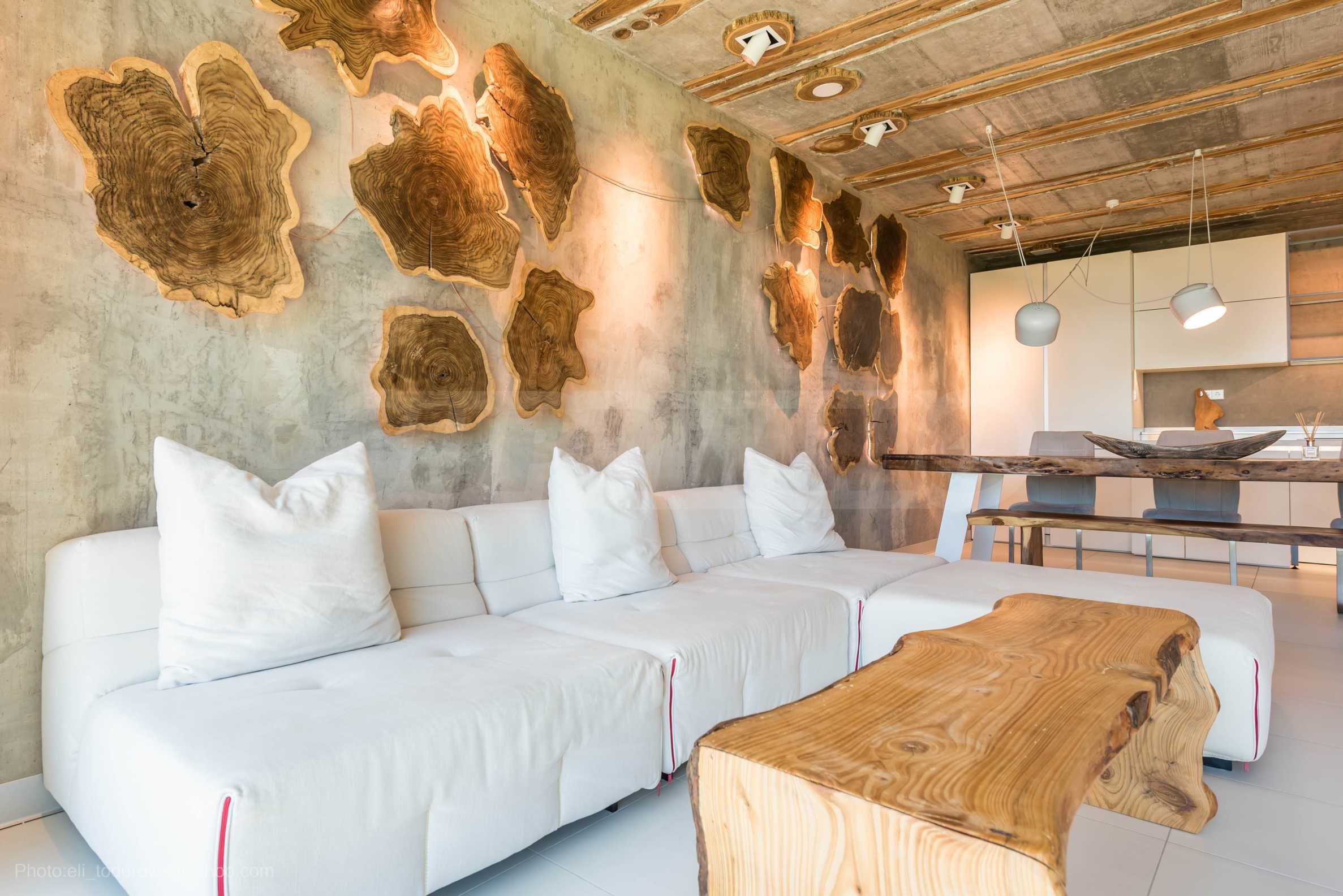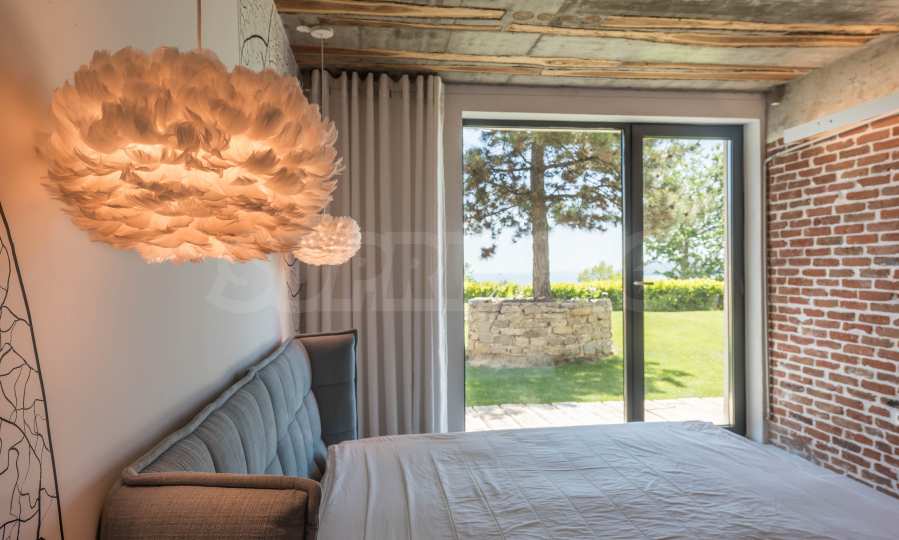 Дизайнът е уникален - естествен и модерен, предизвикателен и светъл, носещ посланието на автономност, релакс и морската атмосфера. В бетоновите плочи по тавана на апартамента са вградени естествени дървени орнаменти от акация. Тухлените стени и бетонът са използвани за естествена декорация, като са допълнително обработени, импрегнирани и грундирани. Мебели, кухня, матраци и дивани, атрактивни плочки, осветителни тела - всички са на известни италиански марки. Вниманието в трапезария е с акцент на екстравагантната маса, изработена по поръчка, от ценно и рядко дърво от Амазонка. Банята е отделена със стъклена врата, за изобилието на слънчева светлина, а всички санитарии са първокласно немско качество.