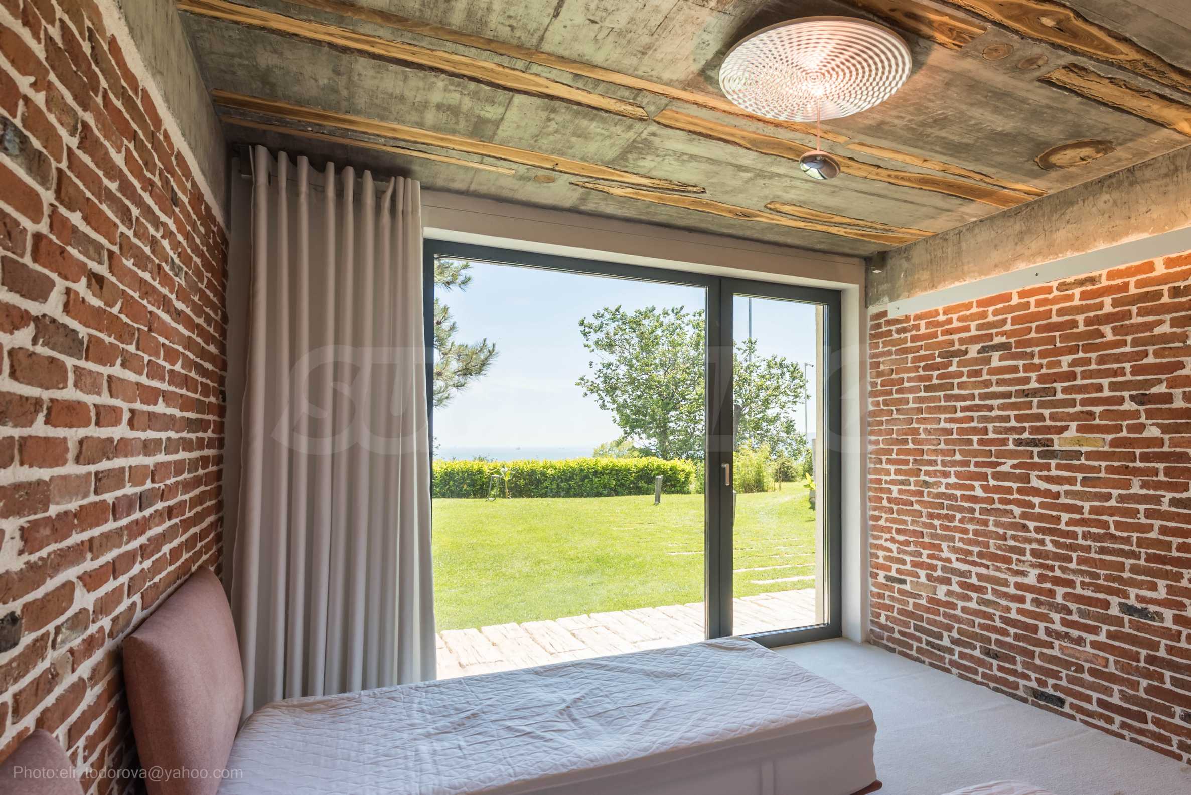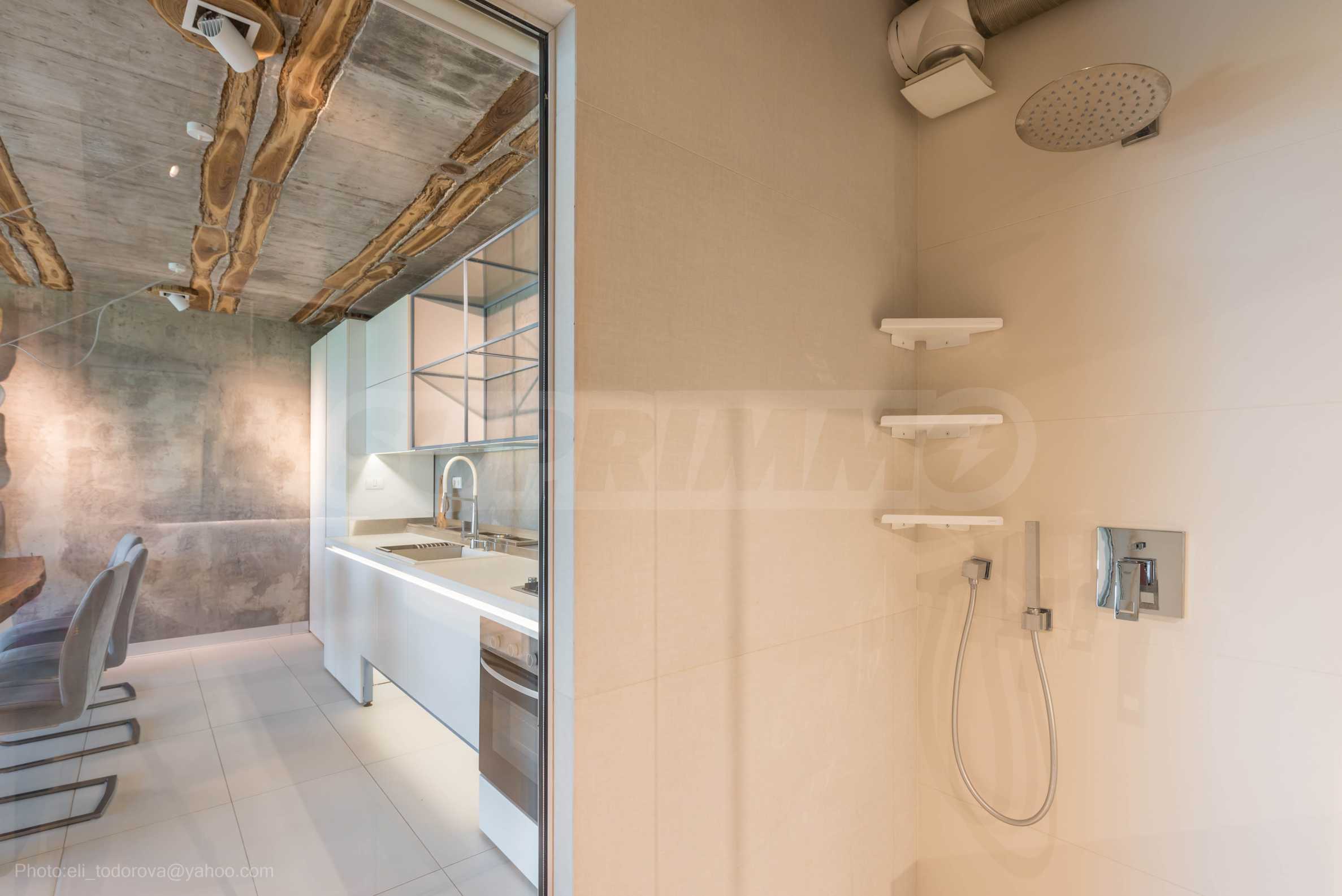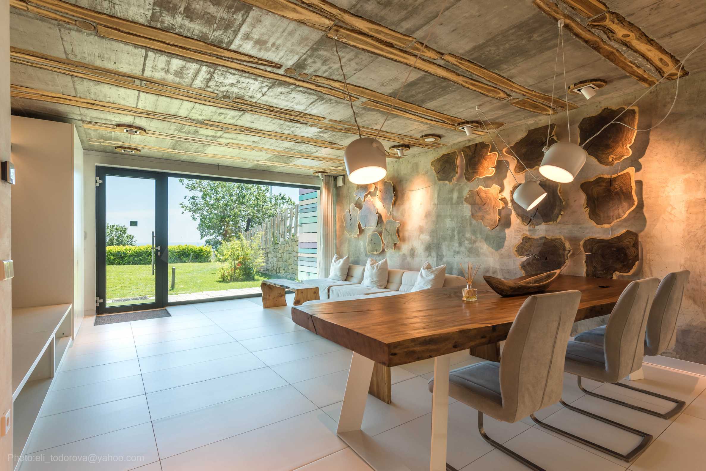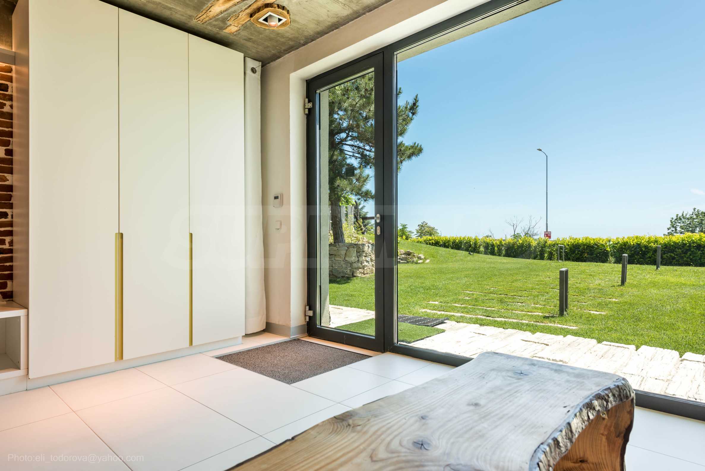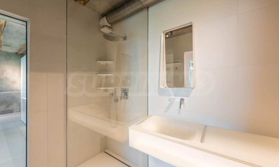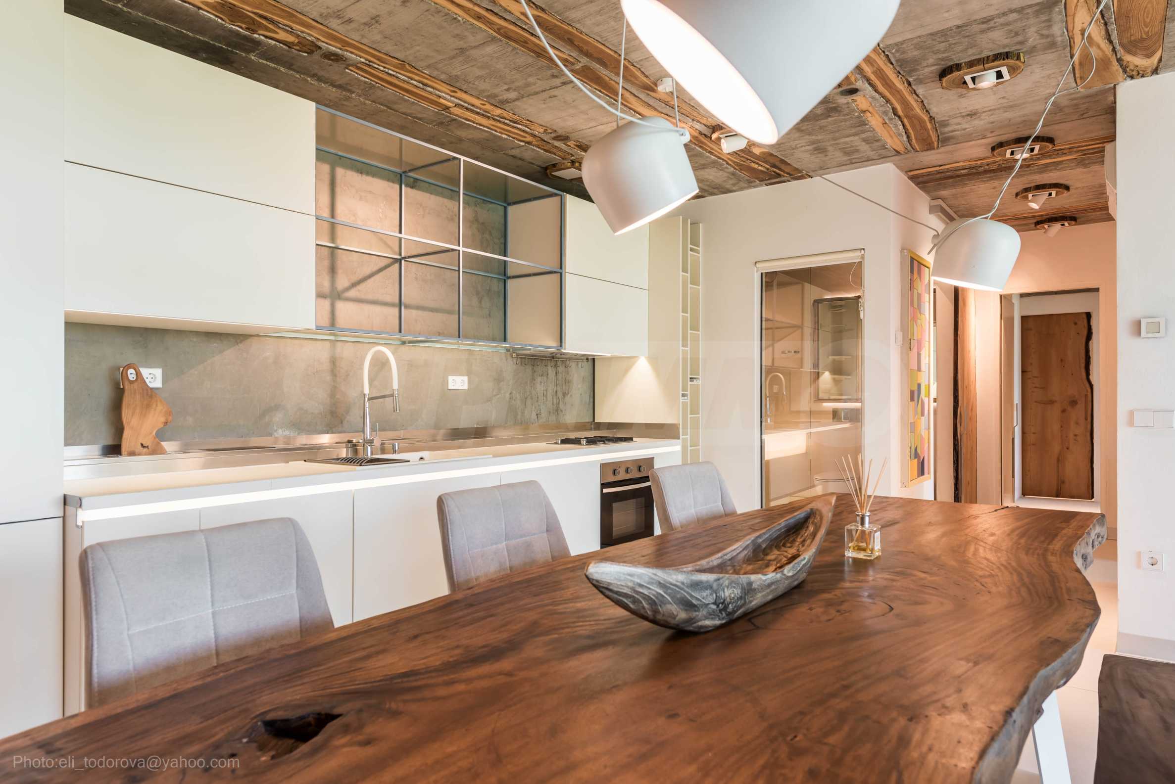 Дизайнът е уникален - естествен и модерен, предизвикателен и светъл, носещ посланието на автономност, релакс и морската атмосфера. В бетоновите плочи по тавана на апартамента са вградени естествени дървени орнаменти от акация. Тухлените стени и бетонът са използвани за естествена декорация, като са допълнително обработени, импрегнирани и грундирани. Мебели, кухня, матраци и дивани, атрактивни плочки, осветителни тела - всички са на известни италиански марки. Вниманието в трапезария е с акцент на екстравагантната маса, изработена по поръчка, от ценно и рядко дърво от Амазонка. Банята е отделена със стъклена врата, за изобилието на слънчева светлина, а всички санитарии са първокласно немско качество.