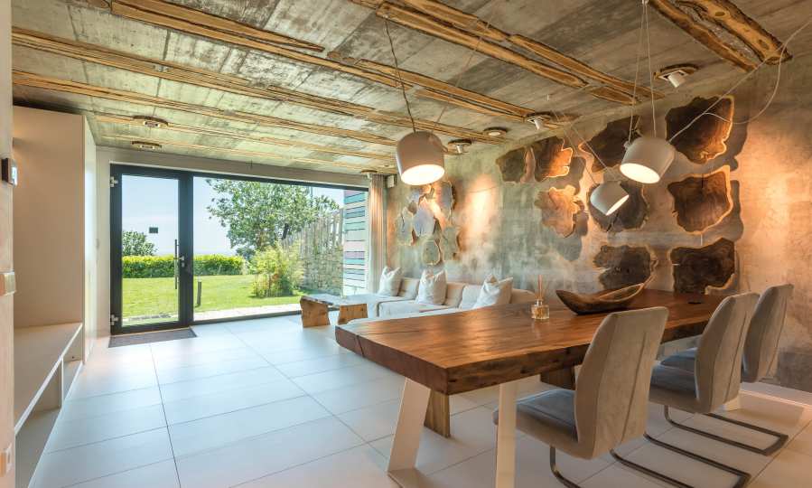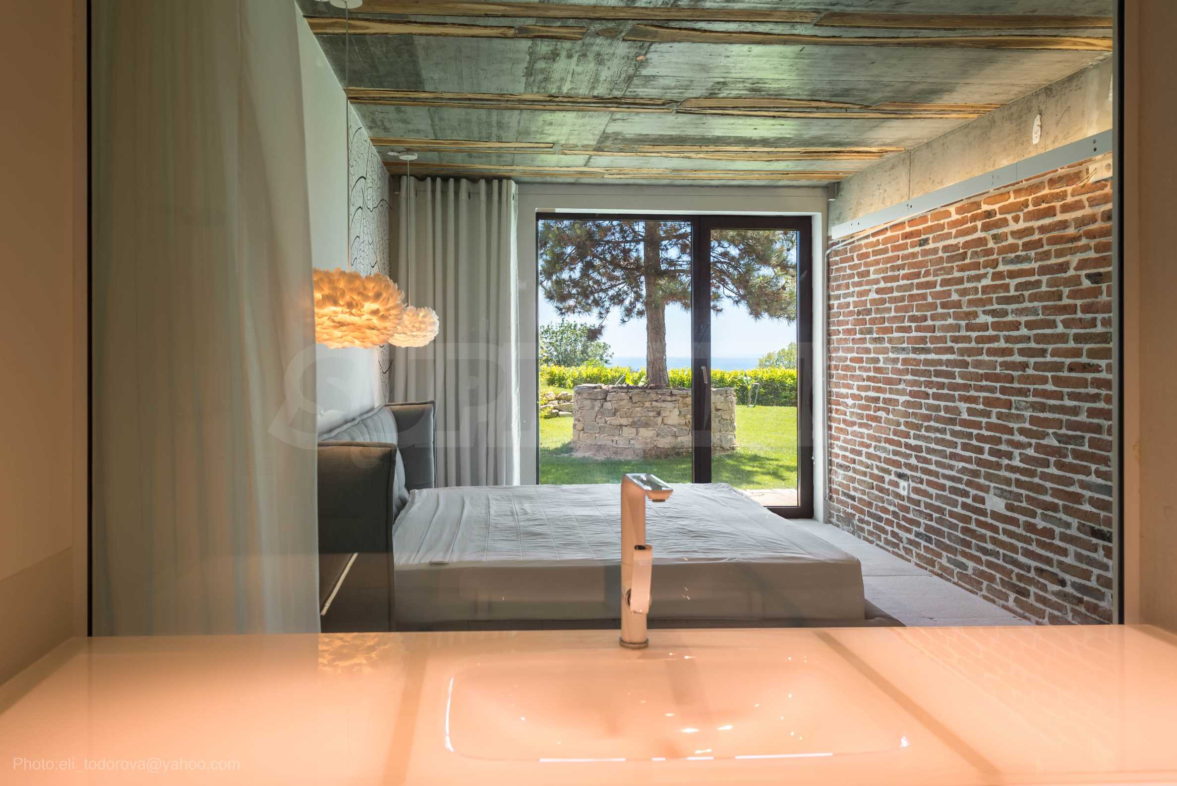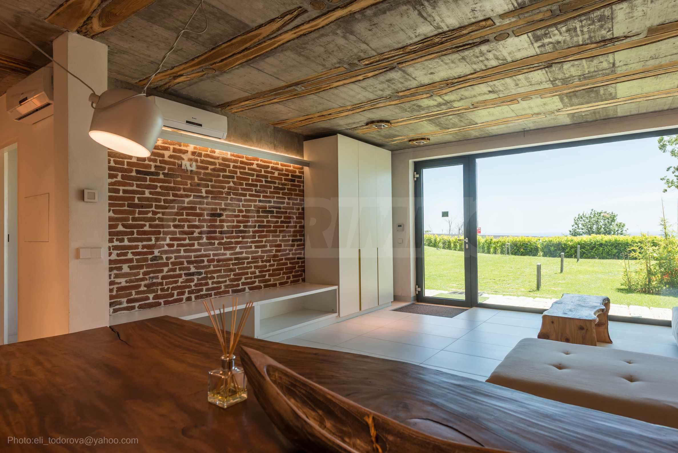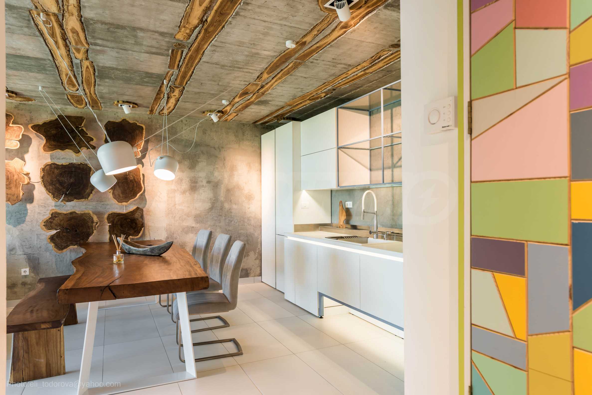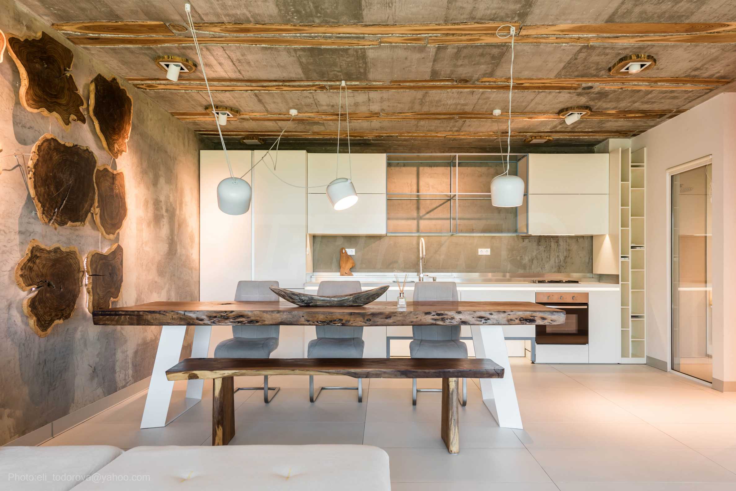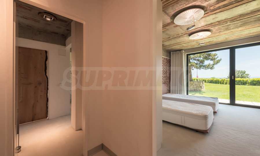 Дизайнът е уникален - естествен и модерен, предизвикателен и светъл, носещ посланието на автономност, релакс и морската атмосфера. В бетоновите плочи по тавана на апартамента са вградени естествени дървени орнаменти от акация. Тухлените стени и бетонът са използвани за естествена декорация, като са допълнително обработени, импрегнирани и грундирани. Мебели, кухня, матраци и дивани, атрактивни плочки, осветителни тела - всички са на известни италиански марки. Вниманието в трапезария е с акцент на екстравагантната маса, изработена по поръчка, от ценно и рядко дърво от Амазонка. Банята е отделена със стъклена врата, за изобилието на слънчева светлина, а всички санитарии са първокласно немско качество.