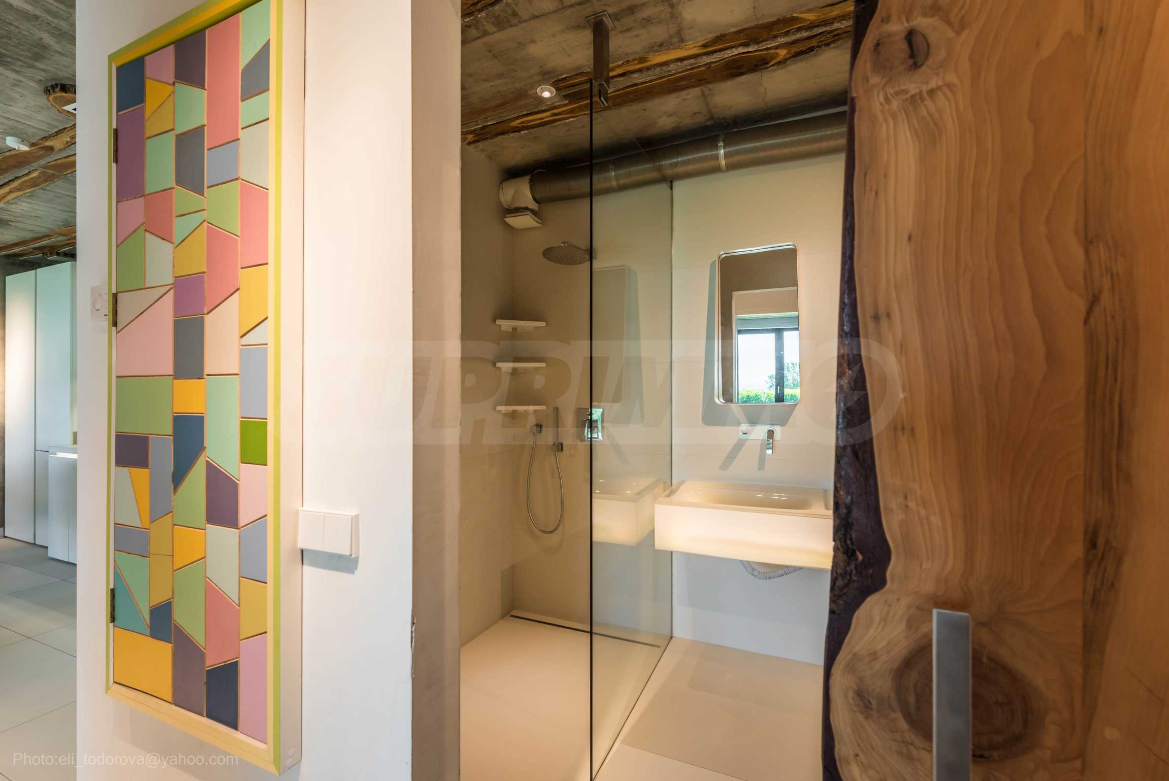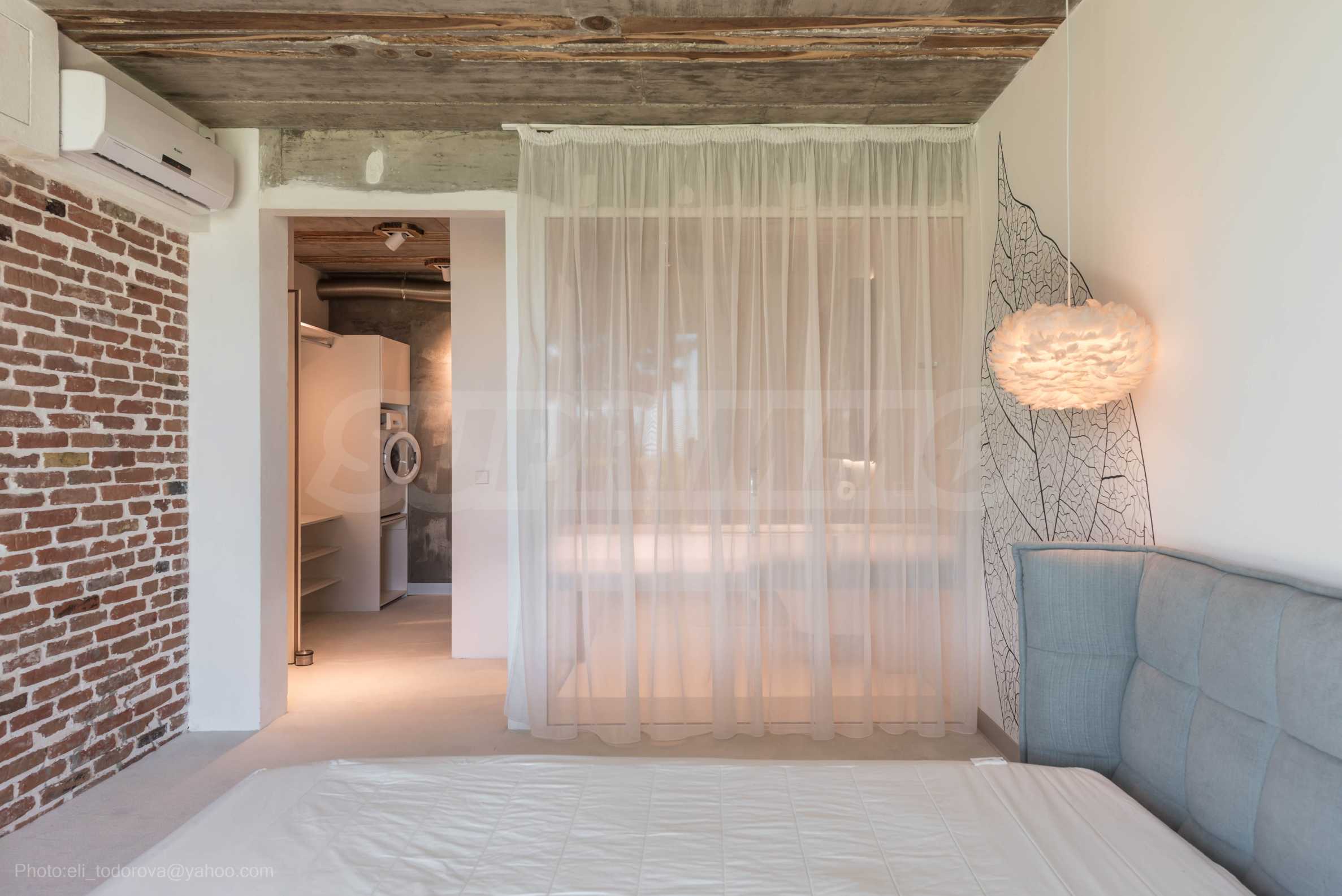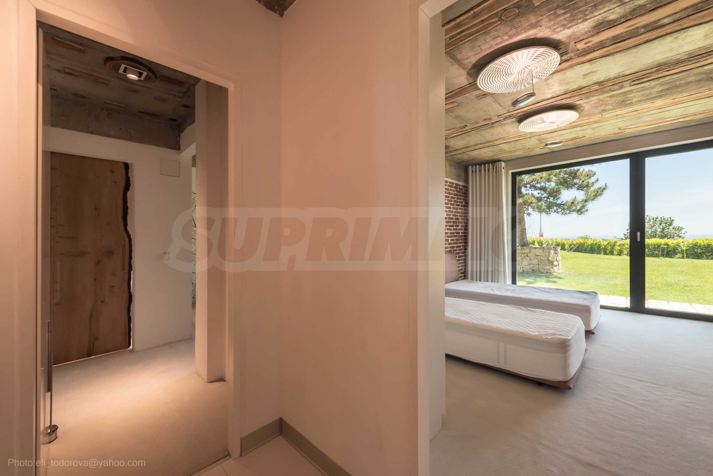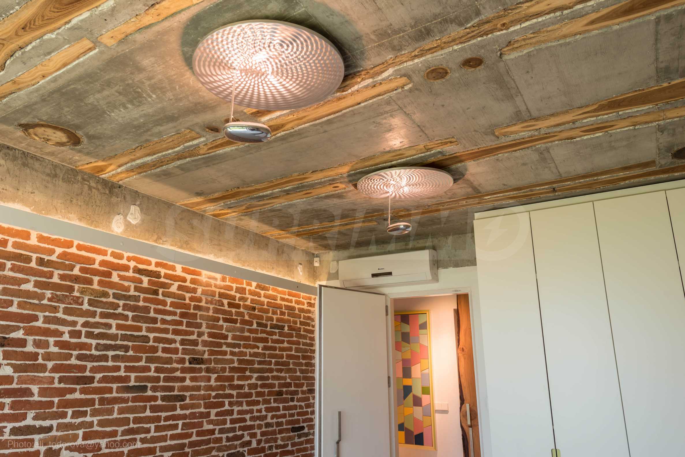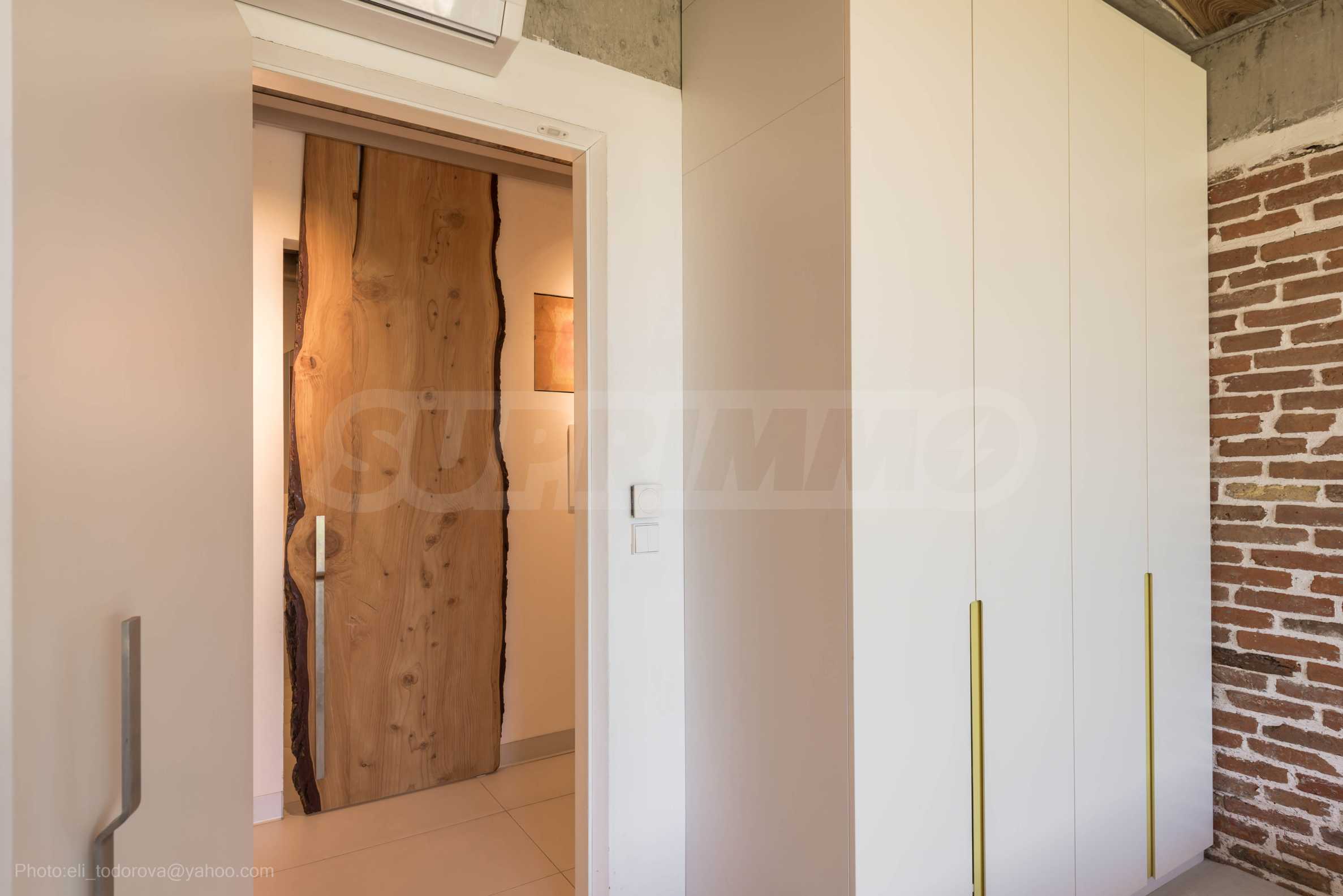 Дизайнът е уникален - естествен и модерен, предизвикателен и светъл, носещ посланието на автономност, релакс и морската атмосфера. В бетоновите плочи по тавана на апартамента са вградени естествени дървени орнаменти от акация. Тухлените стени и бетонът са използвани за естествена декорация, като са допълнително обработени, импрегнирани и грундирани. Мебели, кухня, матраци и дивани, атрактивни плочки, осветителни тела - всички са на известни италиански марки. Вниманието в трапезария е с акцент на екстравагантната маса, изработена по поръчка, от ценно и рядко дърво от Амазонка. Банята е отделена със стъклена врата, за изобилието на слънчева светлина, а всички санитарии са първокласно немско качество.