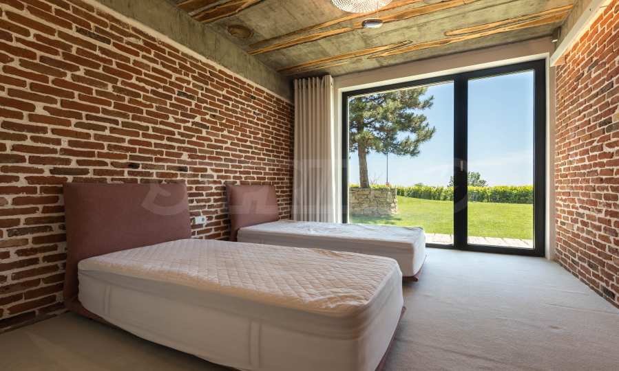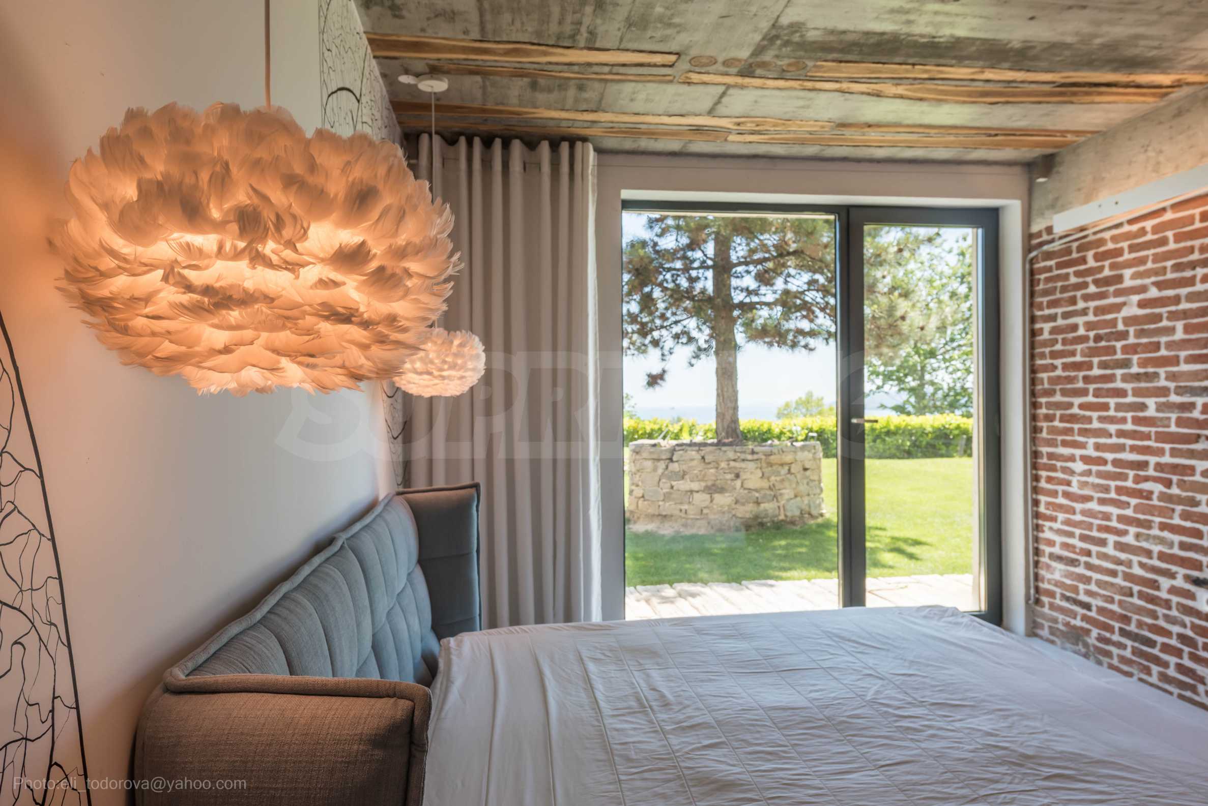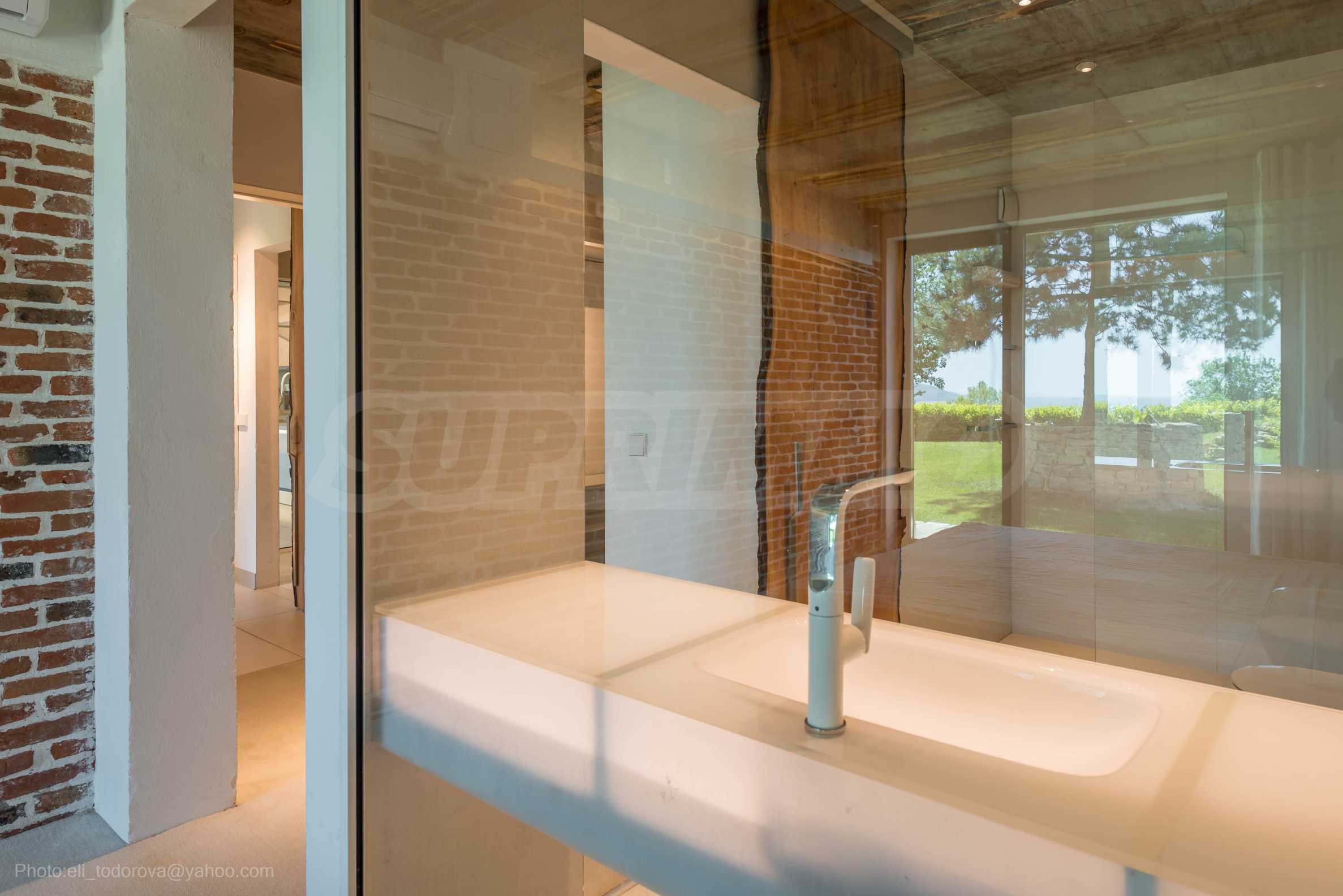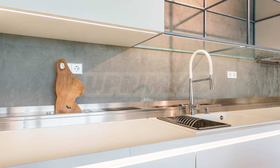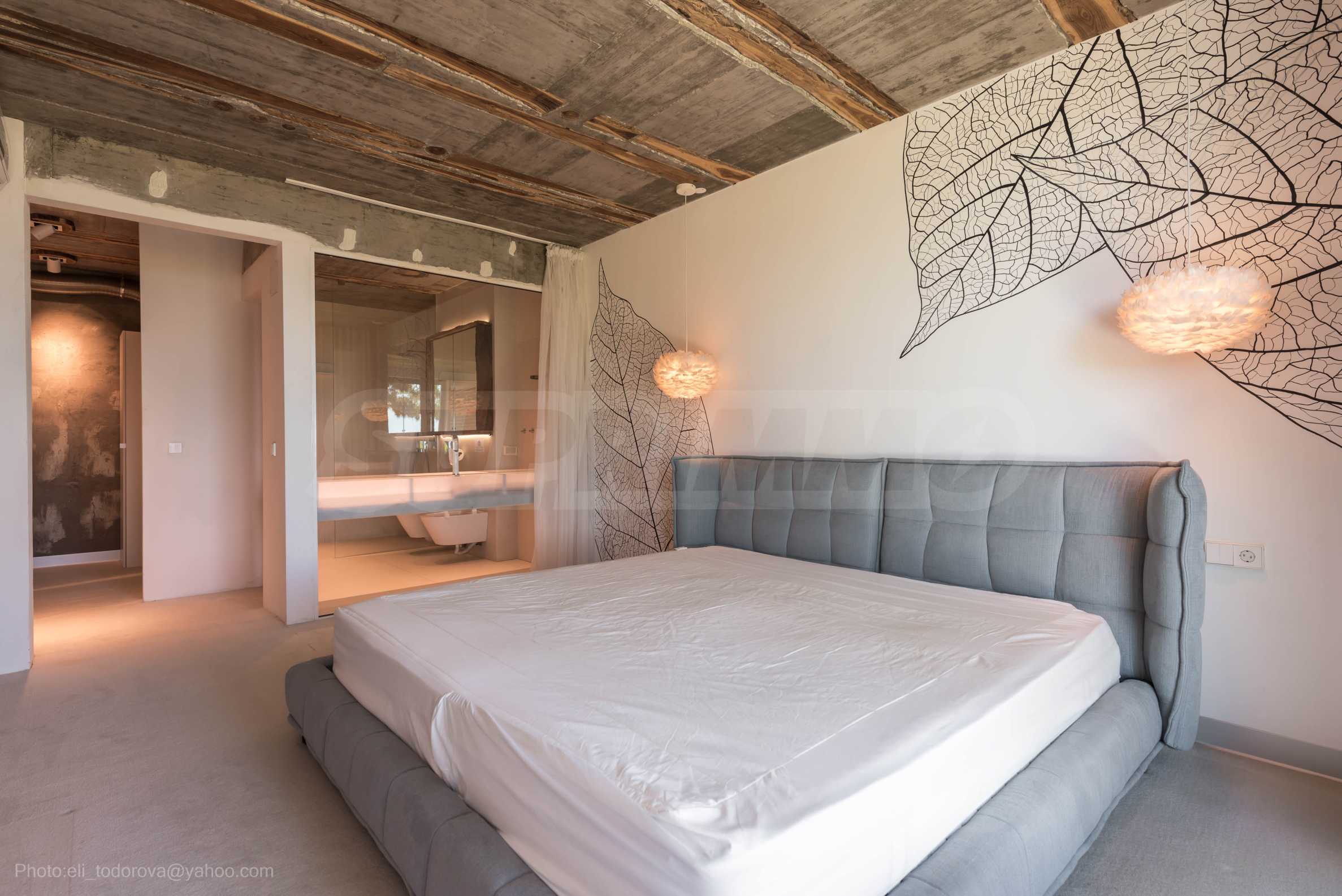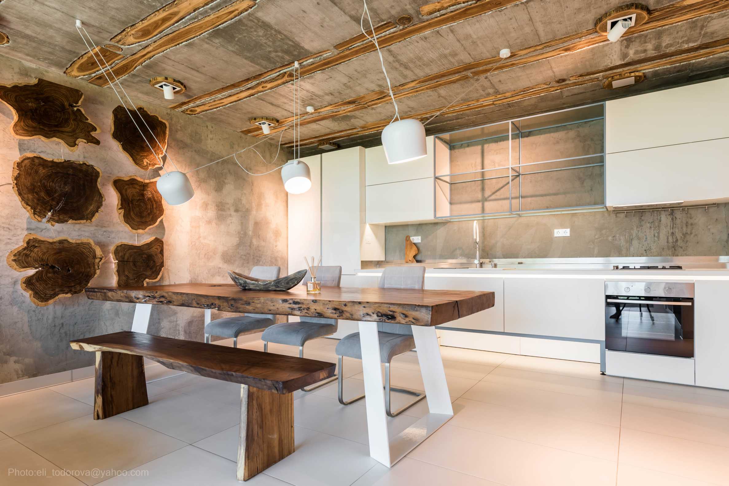 Дизайнът е уникален - естествен и модерен, предизвикателен и светъл, носещ посланието на автономност, релакс и морската атмосфера. В бетоновите плочи по тавана на апартамента са вградени естествени дървени орнаменти от акация. Тухлените стени и бетонът са използвани за естествена декорация, като са допълнително обработени, импрегнирани и грундирани. Мебели, кухня, матраци и дивани, атрактивни плочки, осветителни тела - всички са на известни италиански марки. Вниманието в трапезария е с акцент на екстравагантната маса, изработена по поръчка, от ценно и рядко дърво от Амазонка. Банята е отделена със стъклена врата, за изобилието на слънчева светлина, а всички санитарии са първокласно немско качество.