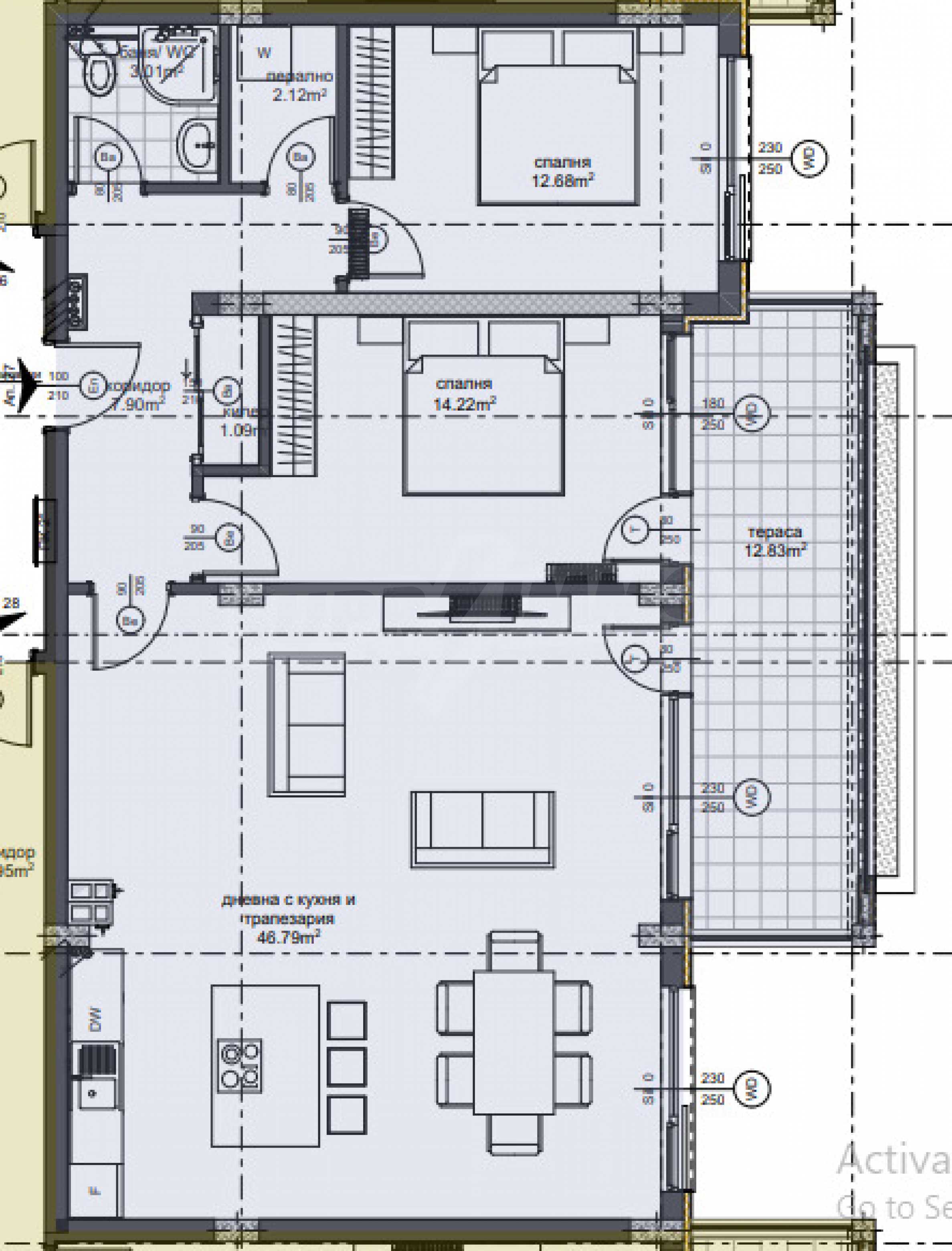 Апартаментът е разположен на 5-ти предпоследен етаж и е с площ от 135,91 кв.м. Състои се от дневен тракт - 46 кв.м, спалня - 14 кв.м, спалня - 12 кв.м, баня с тоалетна, перално помещение, килер, коридор и голяма панорамна тераса - 18 кв.м, гледаща към басейна и двора на комплекса. Има възможност бъде закупено и паркомясто с допълнително заплащане.
