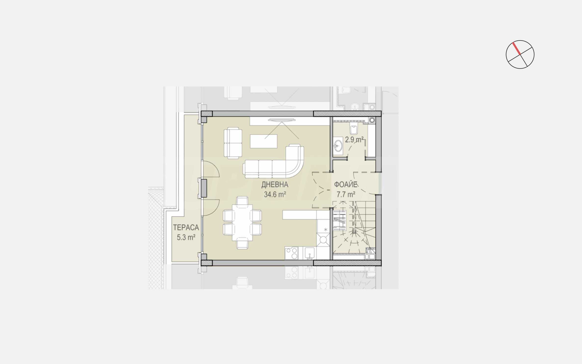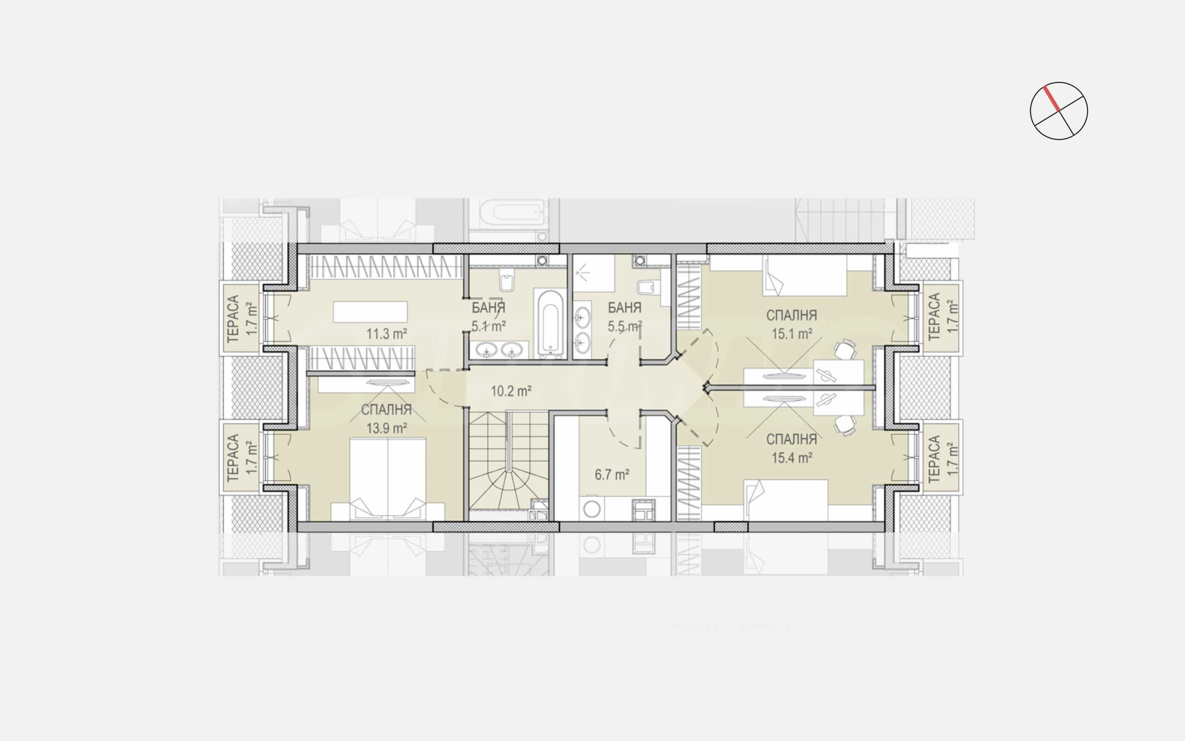 На първия етаж ще откриете всекидневна с кухненски бокс и трапезария (34.6 кв.м) с излаз на слънчева тераса с гледка към града и Витоша планина. Стълбището ни отвежда към втория етаж на жилището. Той представлява зона “нощ” и разполага с три спални, всяка от които е със собствен френски балкон. Родителската спалня предлага изключителното предимство на светъл и просторен дрешник (11.3 кв.м) и собствена баня с тоалетна. Всички стаи в това жилище са ориентирани на запад.