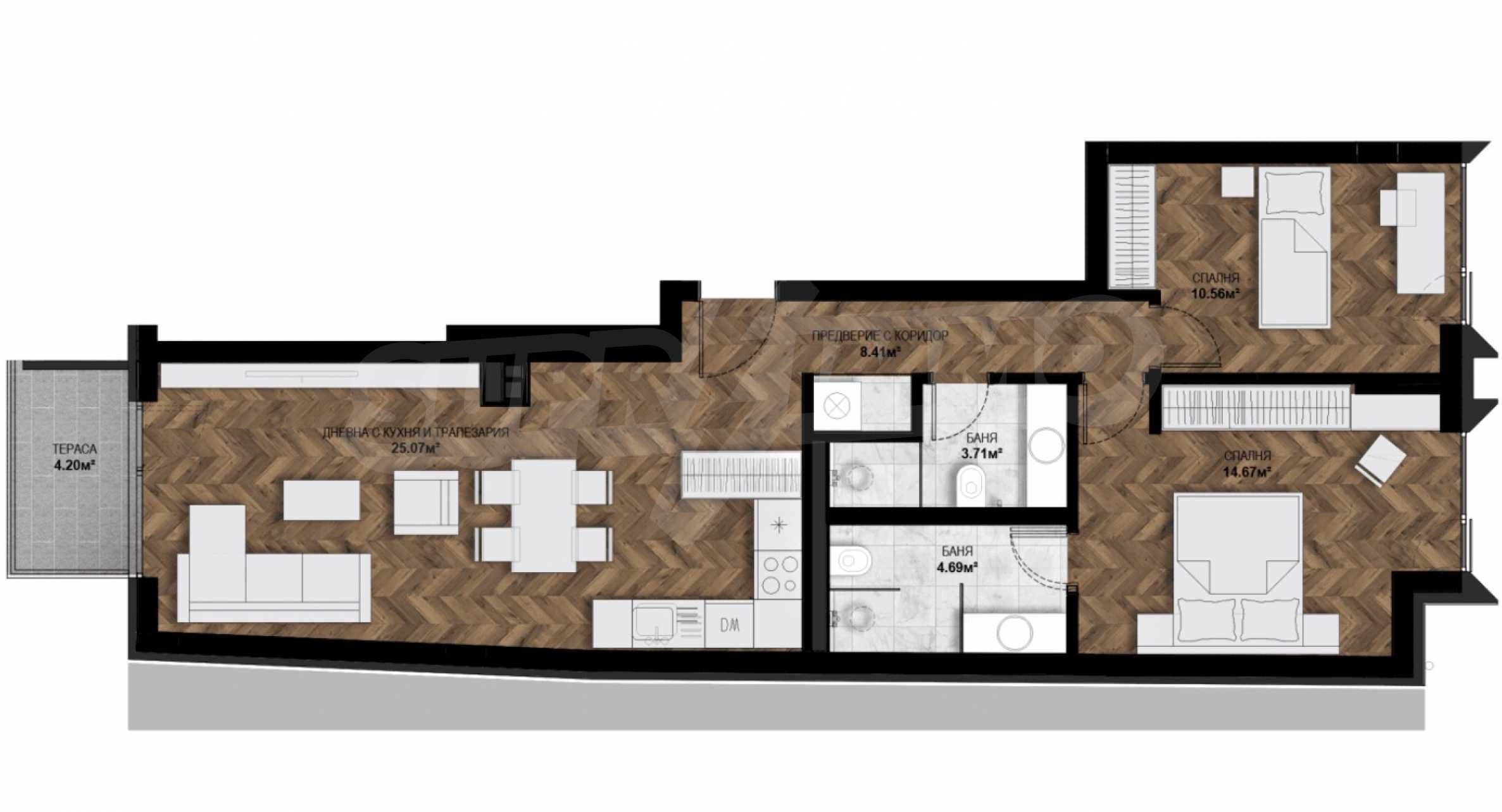 Апартаментът се намира на 3-ти етаж и е с обща площ 99.78 кв.м. (нетна площ 82.24 кв.м. + общи части 17.54 кв.м.). Разпределение: 2 спални, хол с кухненски бокс и кът за хранене, две бани с тоалетна, балкон.