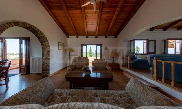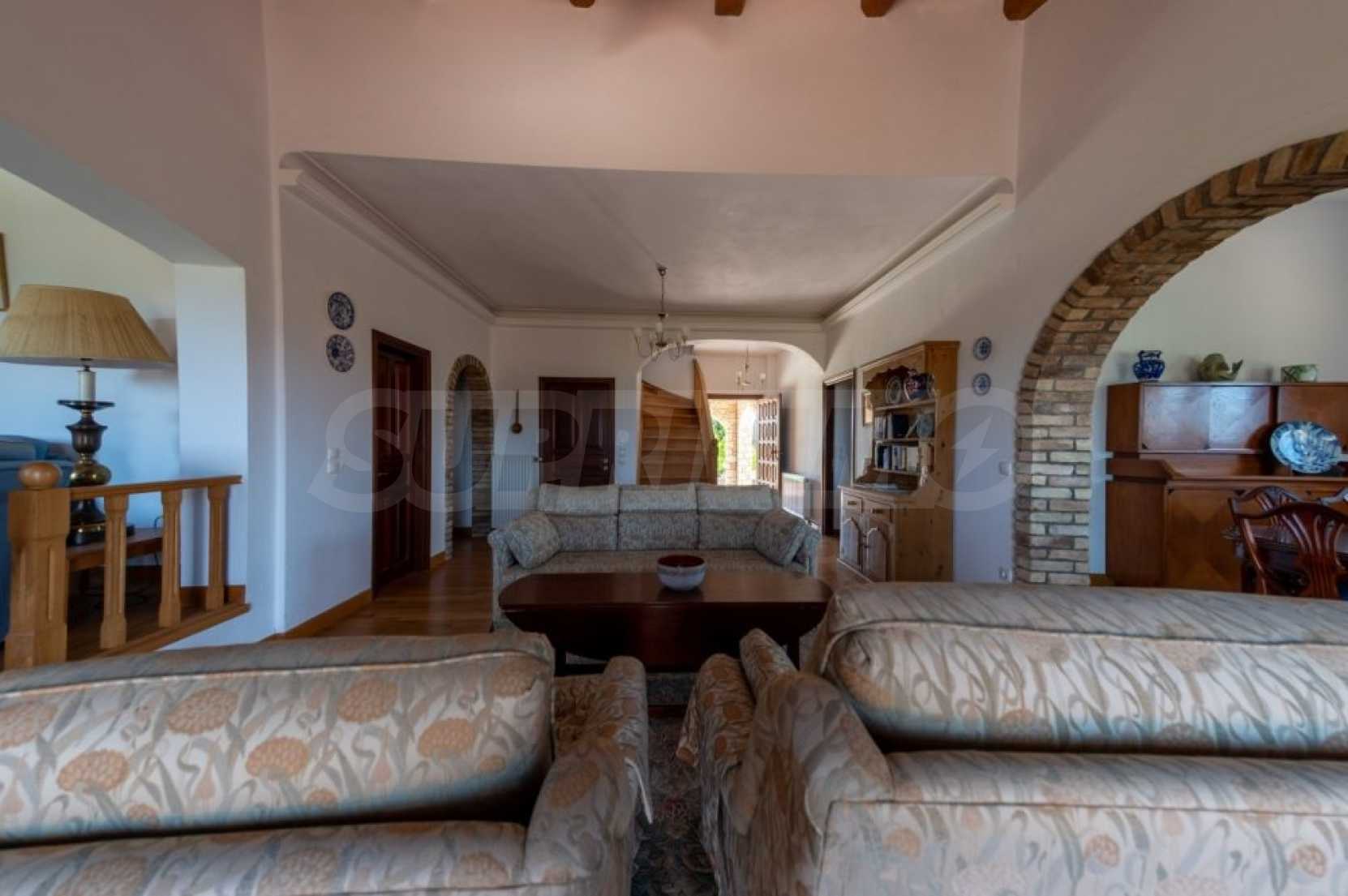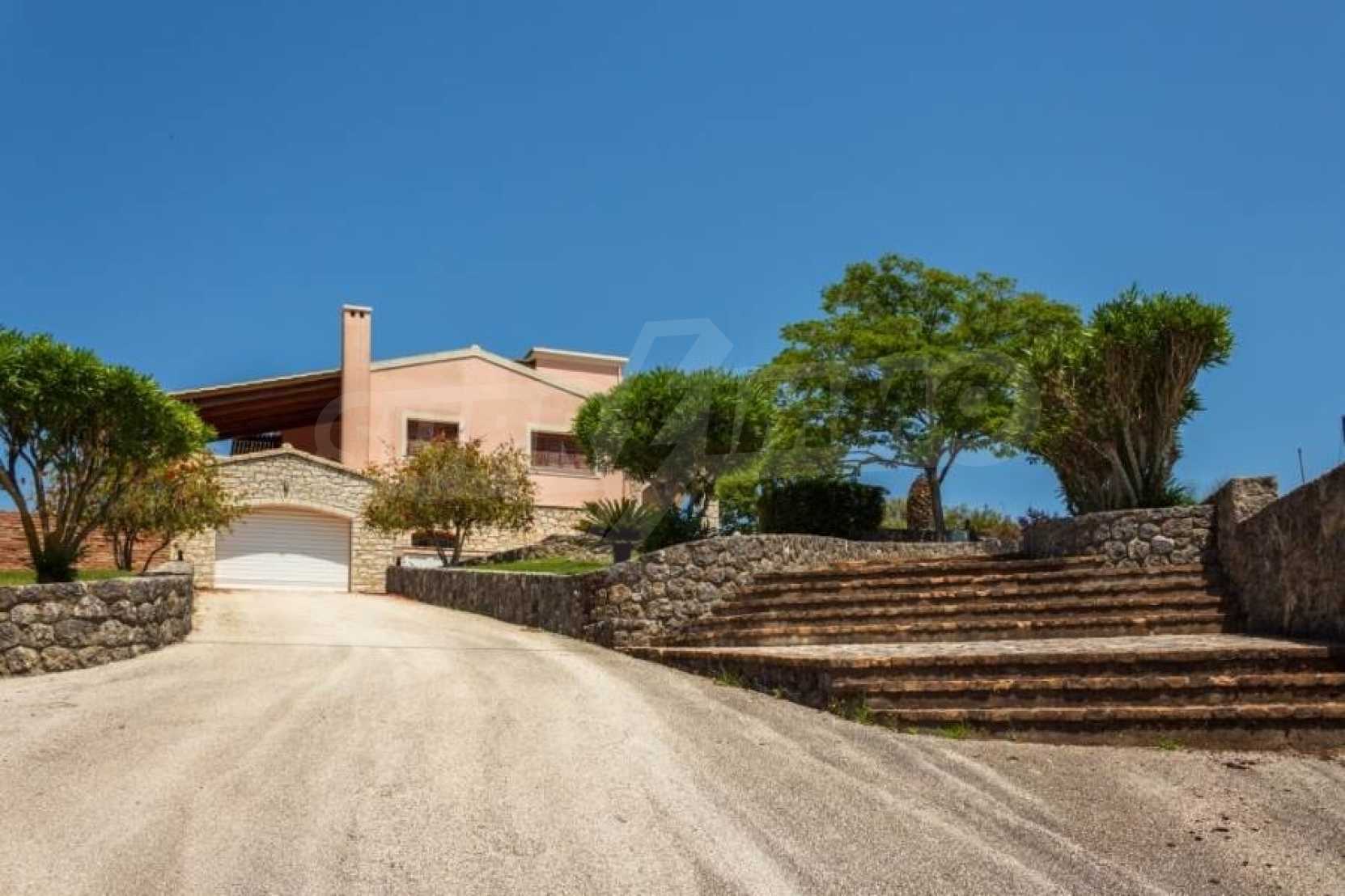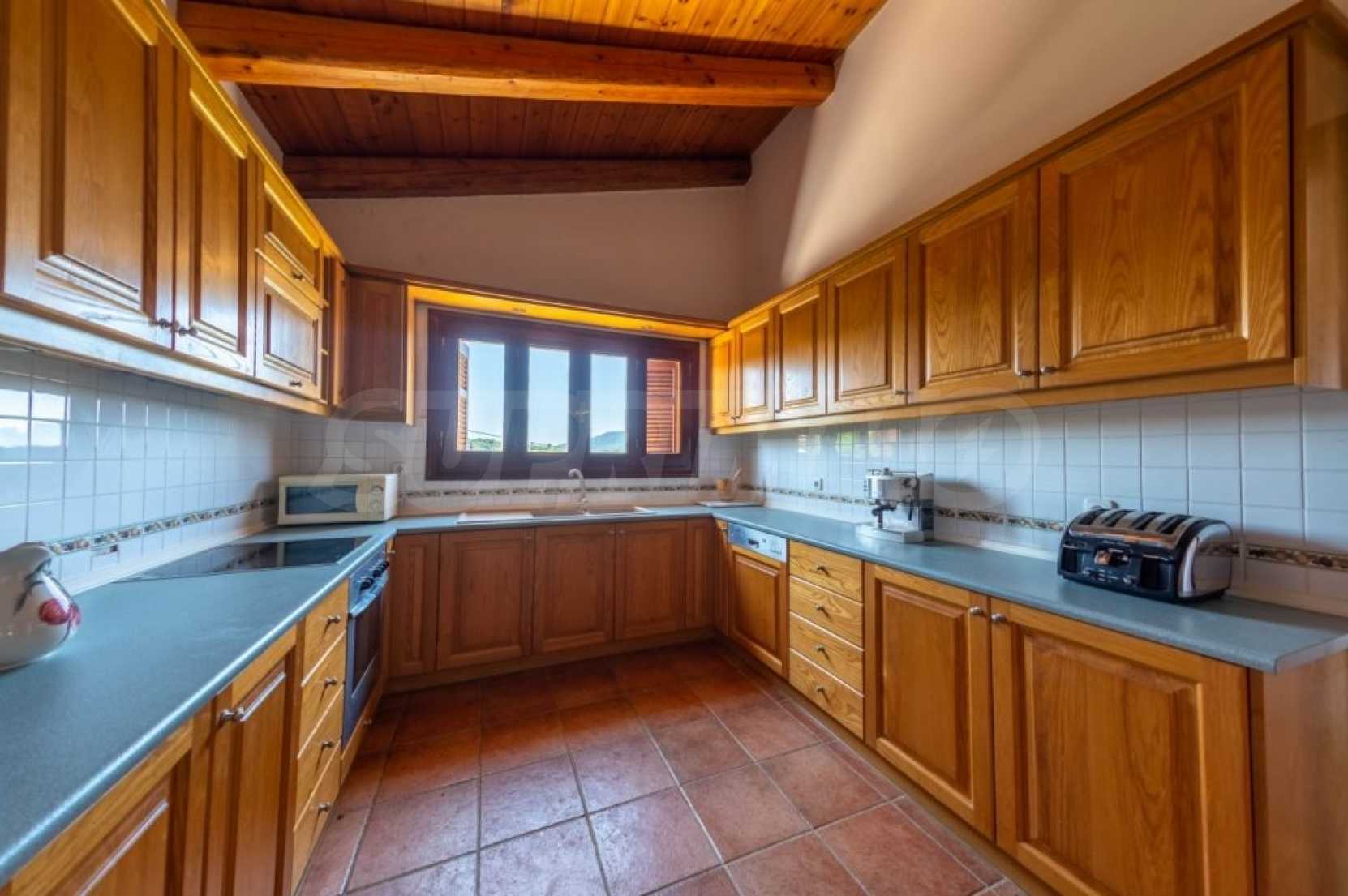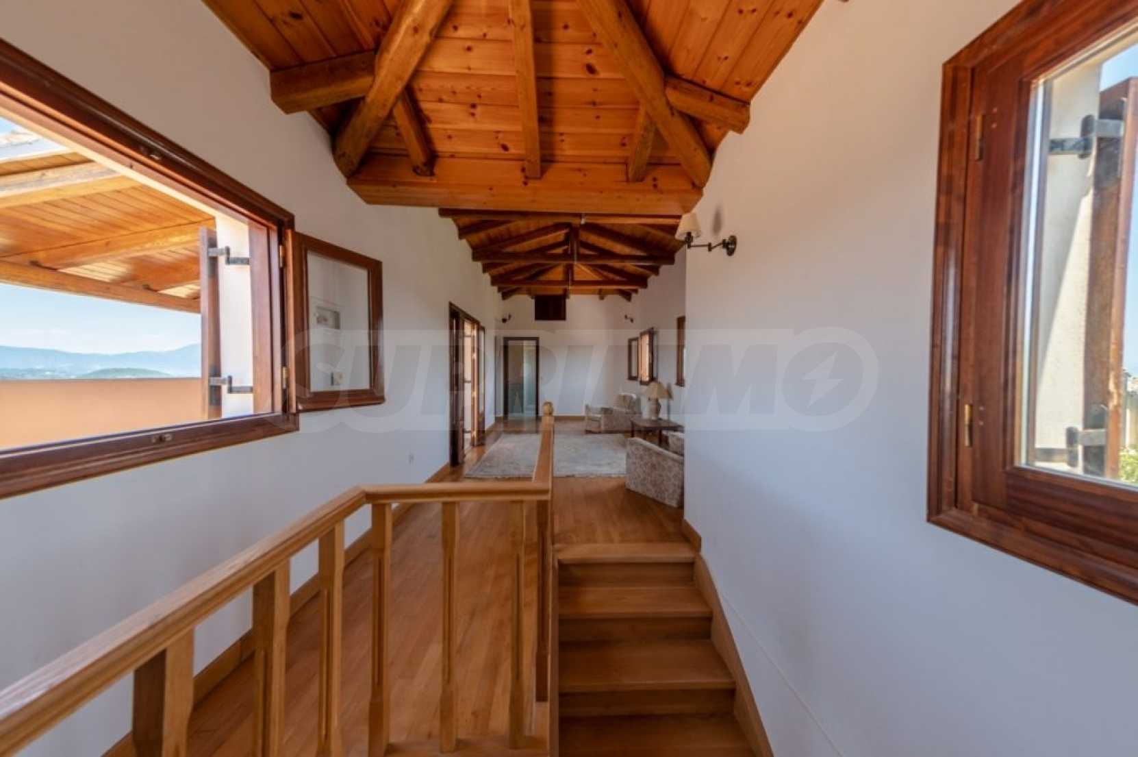 На прекрасно място, издигната и с панорамна гледка към провинцията и подвижните планини, се намира тази красива вила от 342кв.м, построена на три нива.
