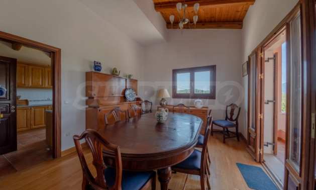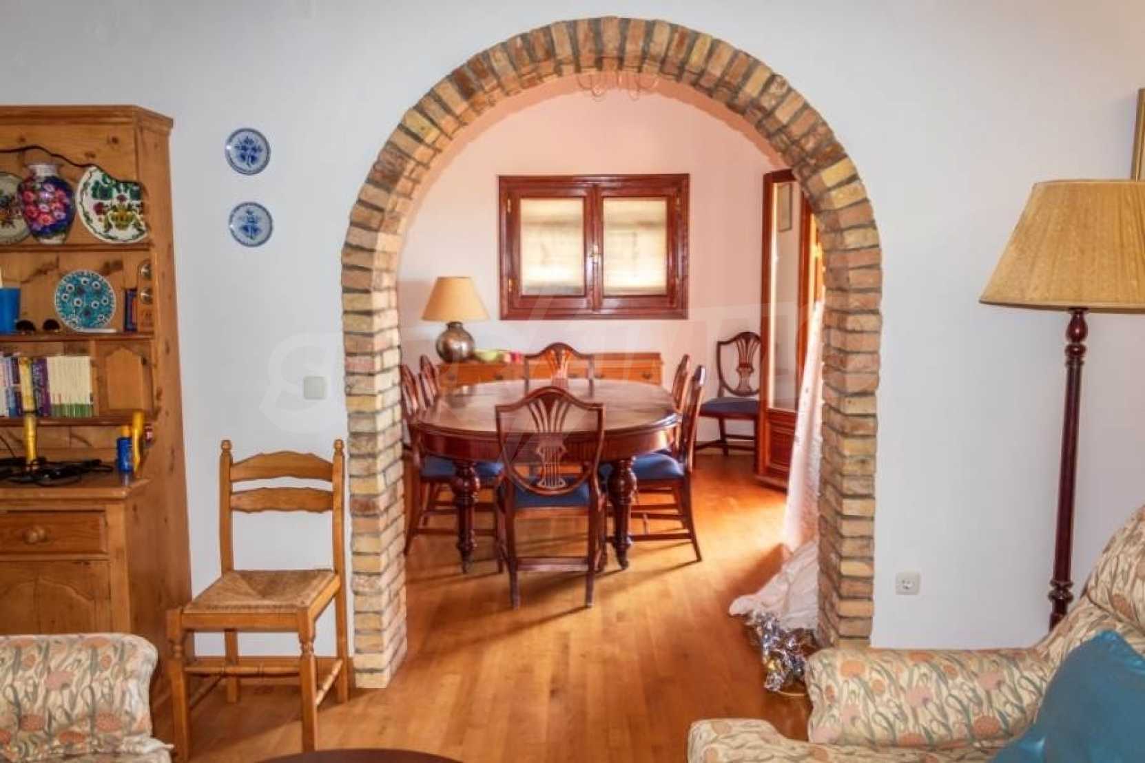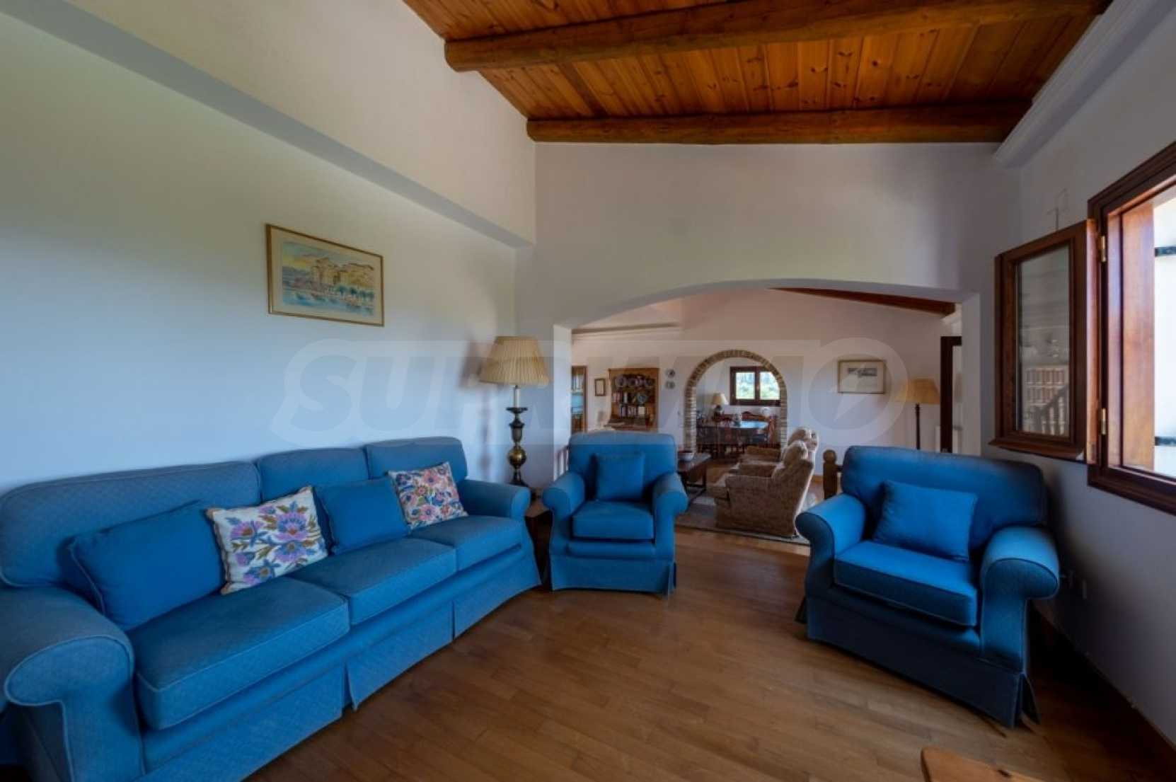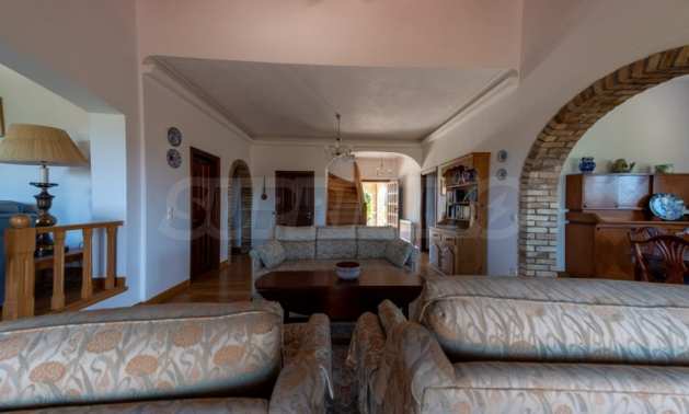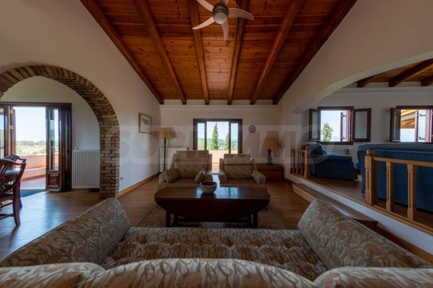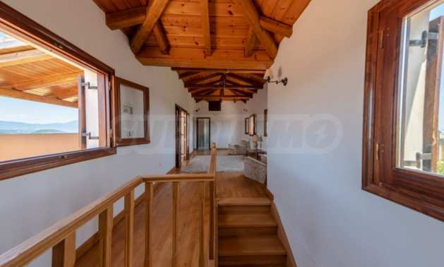 На прекрасно място, издигната и с панорамна гледка към провинцията и подвижните планини, се намира тази красива вила от 342кв.м, построена на три нива.