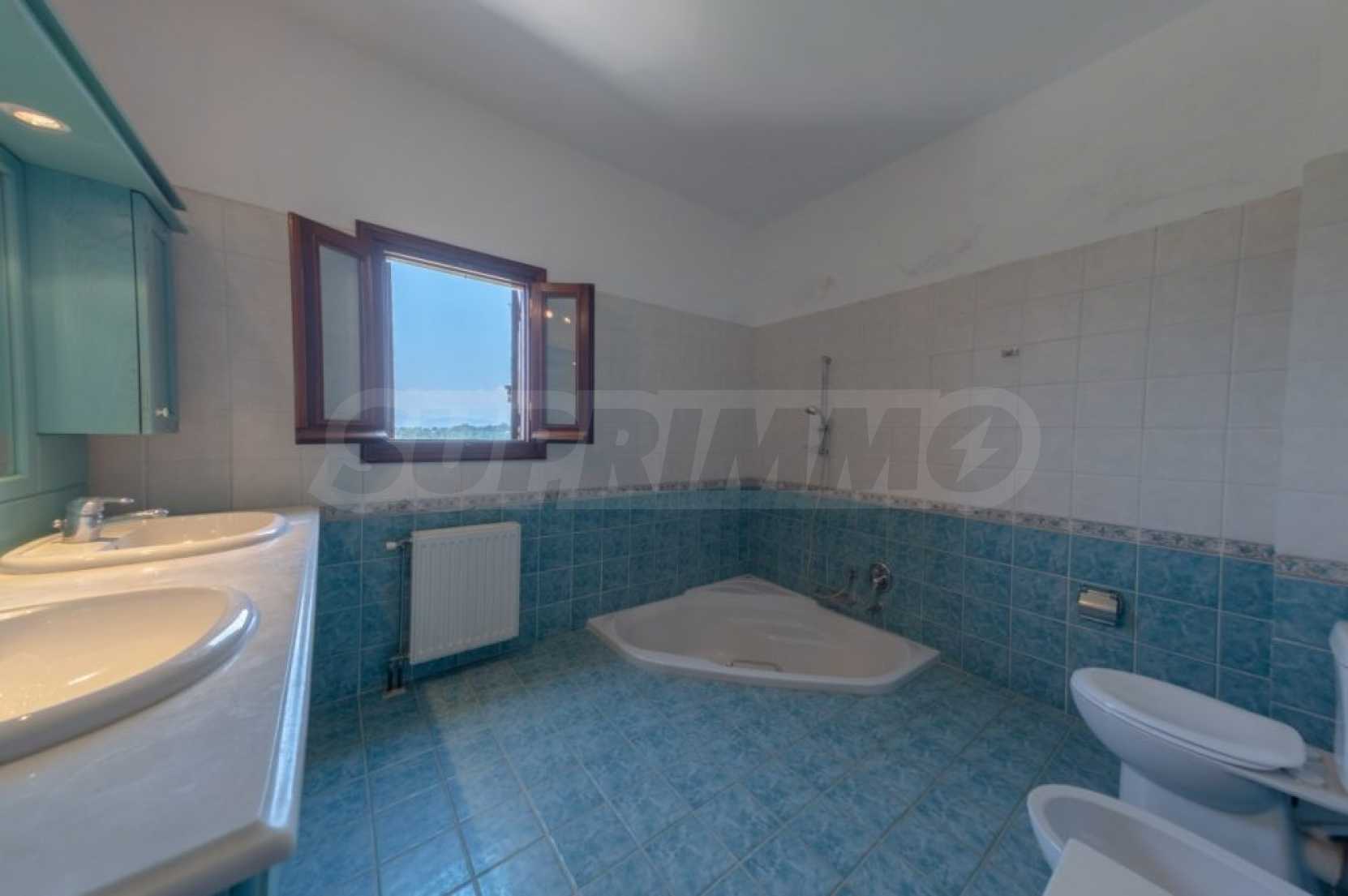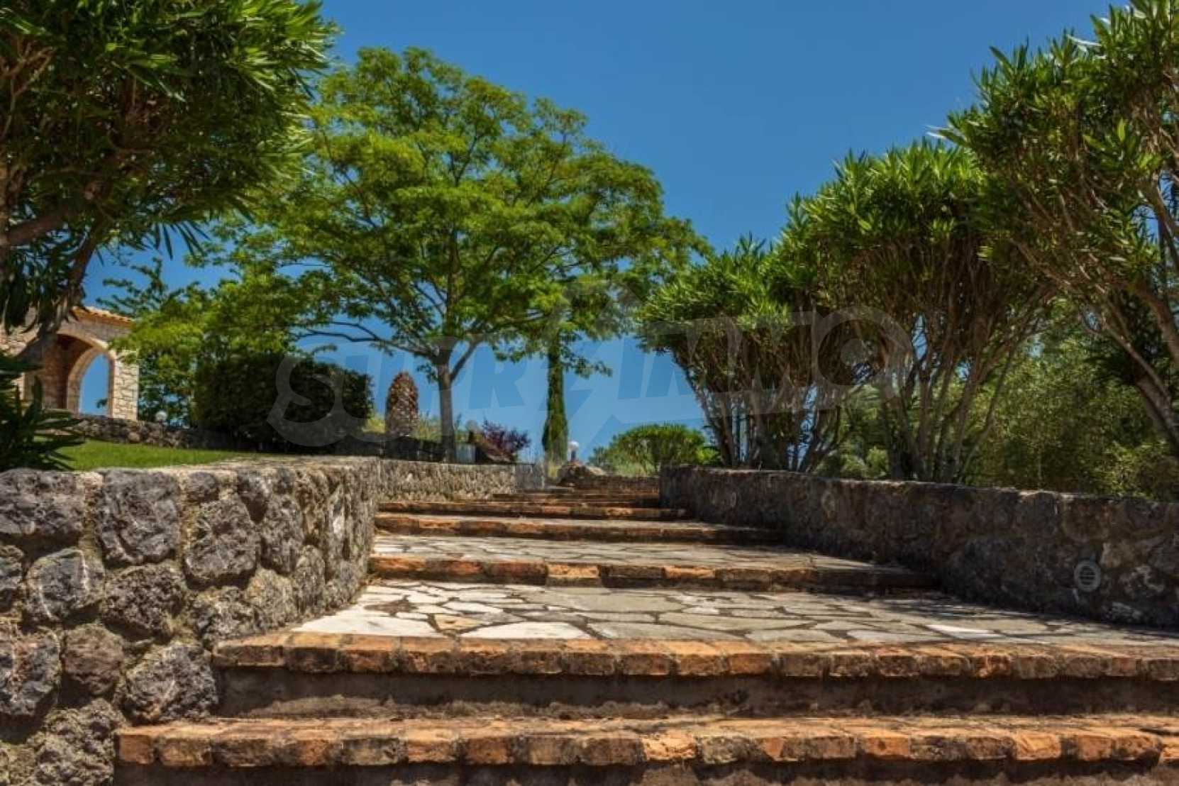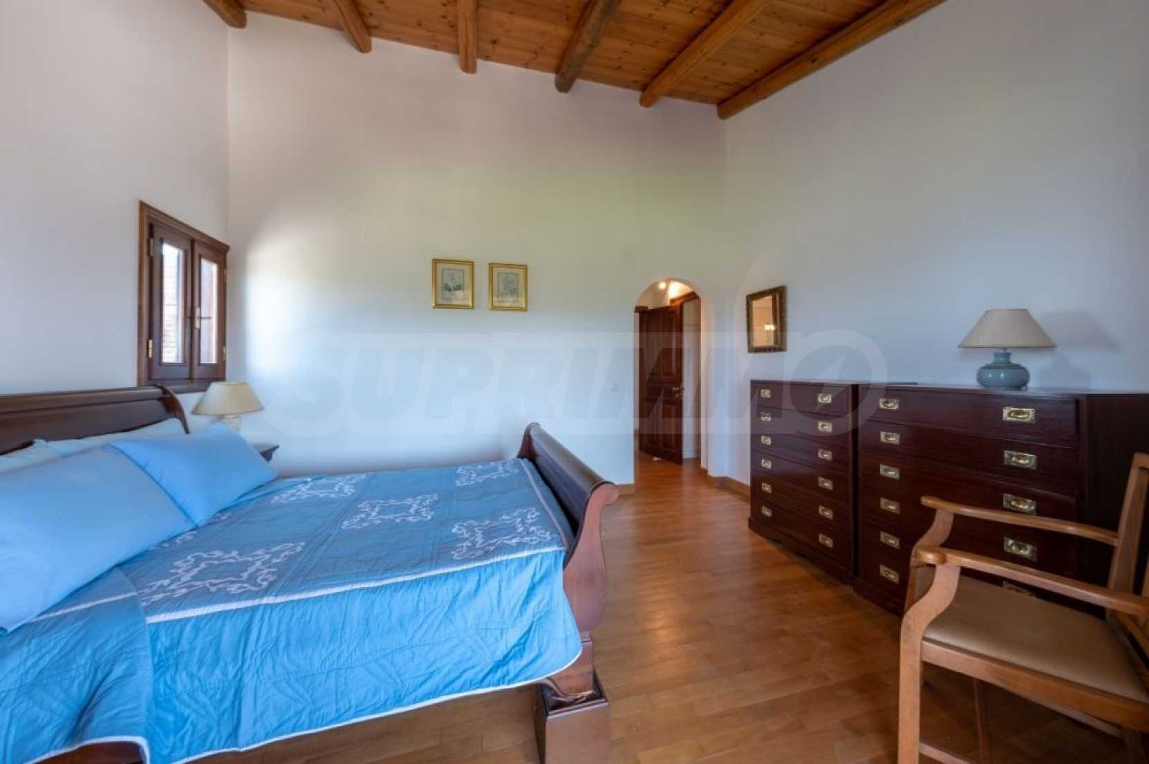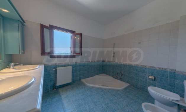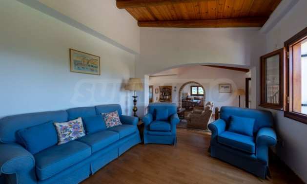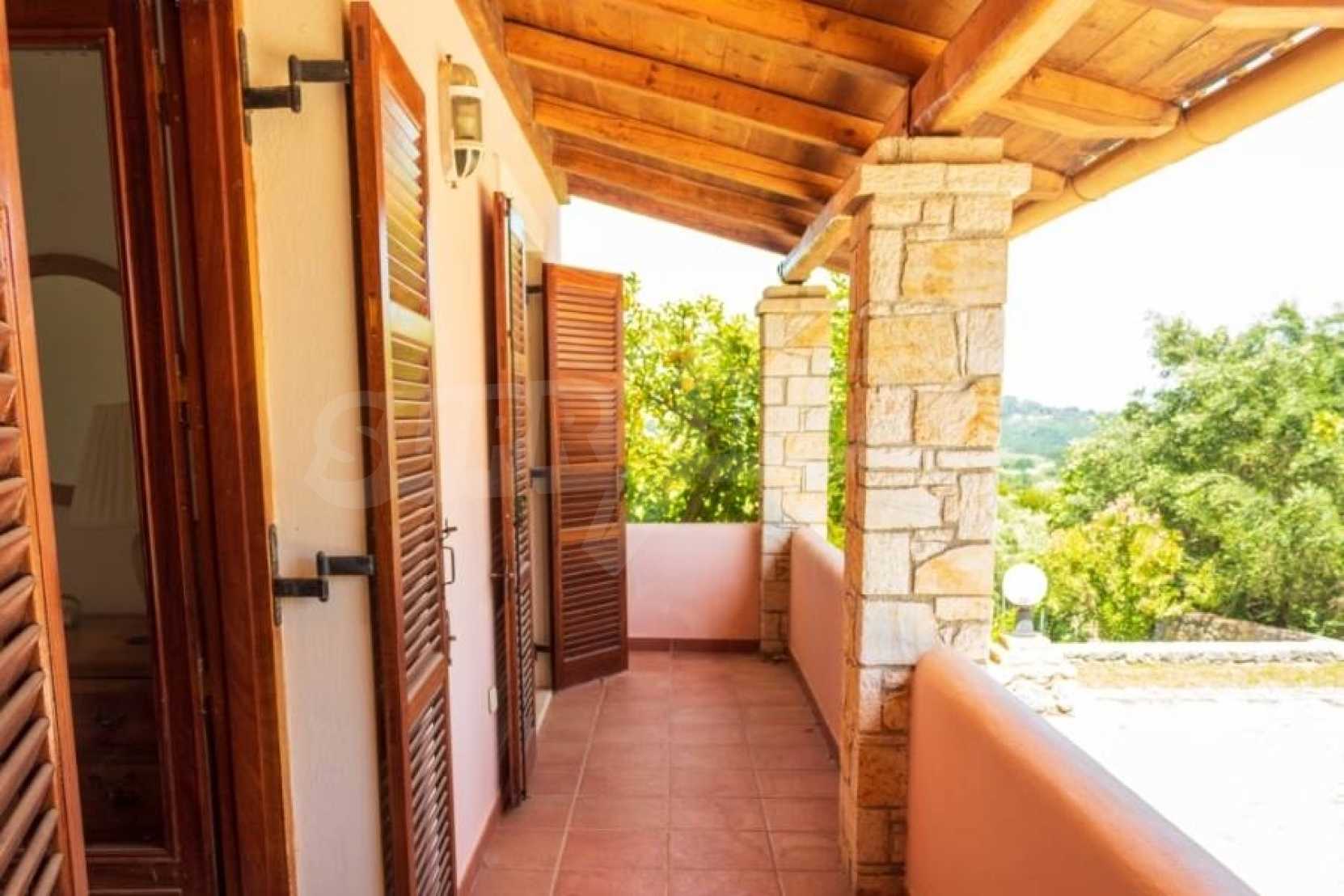 На прекрасно място, издигната и с панорамна гледка към провинцията и подвижните планини, се намира тази красива вила от 342кв.м, построена на три нива.