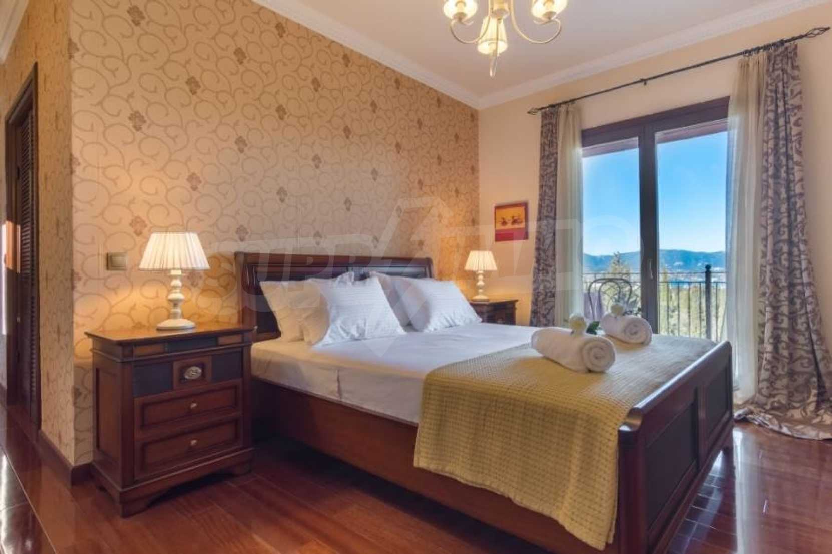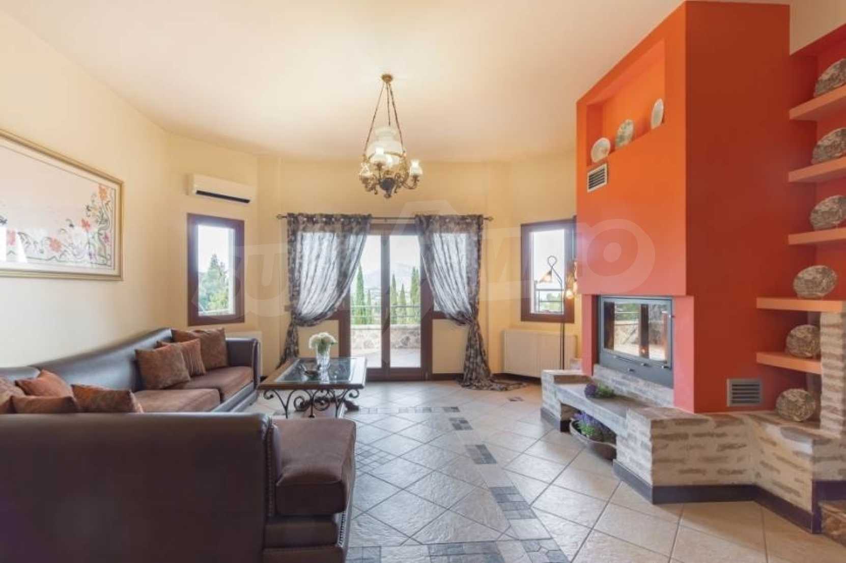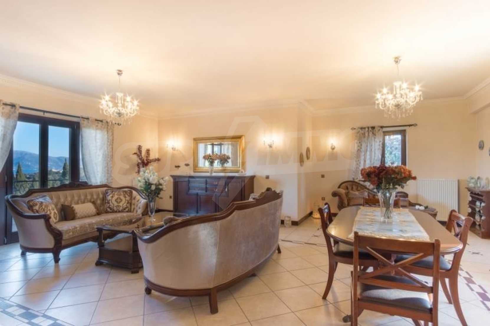Продава се уникална вила с изящна конструкция и естетика, с прекрасна панорамна гледка в района на Потамос, на около 6 км от град Корфу и летището. Построена е на три нива в парцел от 2.129,72кв.м и е в отлично състояние. На долното ниво има стая за гости, която се състои от хол, кухня, баня и фитнес зала. Приземното ниво, където се намира главният вход, има две всекидневни с камини, като по една от тях е енергийна ефективно, кухня и тоалетна.
