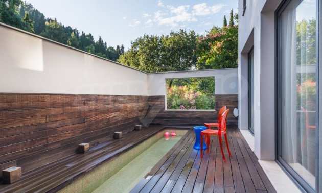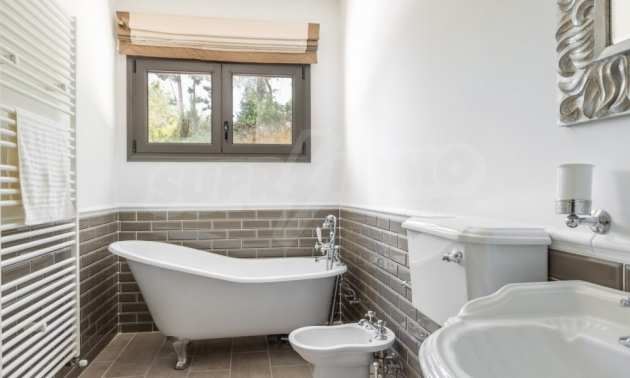 Разположено върху парцел от 7.383 кв. М., Външното пространство е красиво озеленено с дървета, цветя и павирани площи. Басейнът от 72 кв.м и тенис кортът допълват този мечтан имот.
