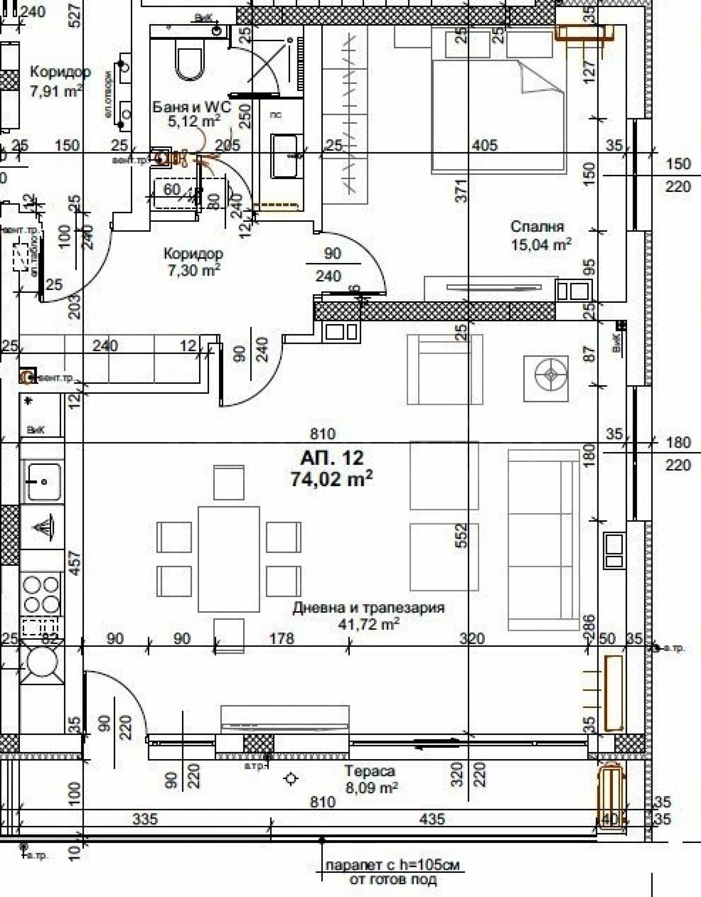 Имотът с обща площ 91.34 кв.м (нетна площ 74.02 кв.м + общи части 12.25 кв.м + мазе - 5,07 кв.м) се намира на 4-ти етаж, с изложение юг-изток.