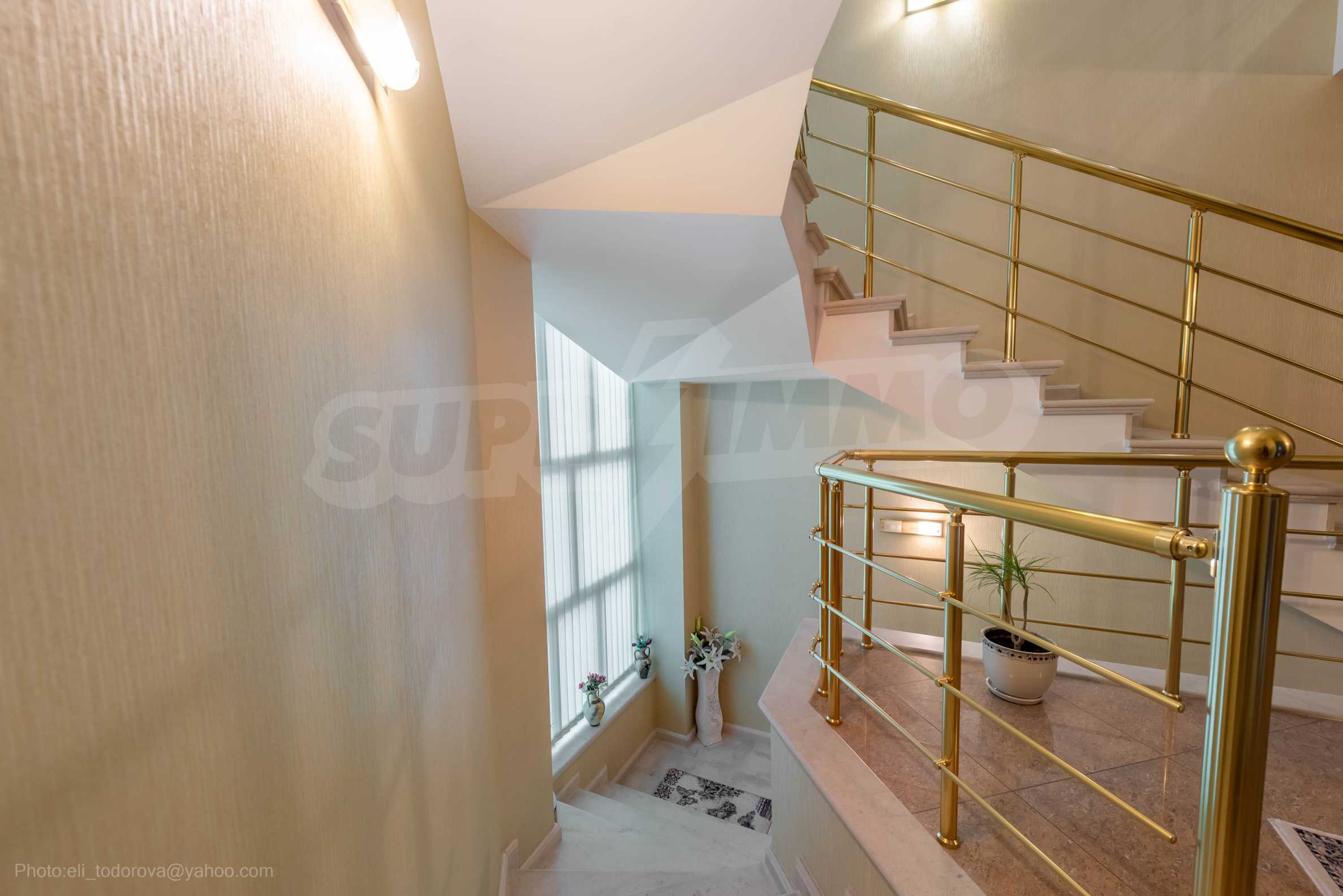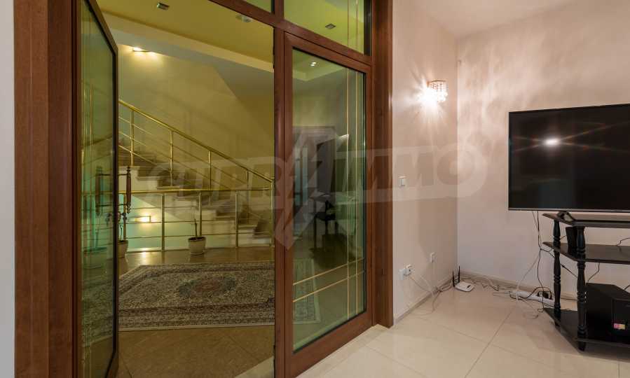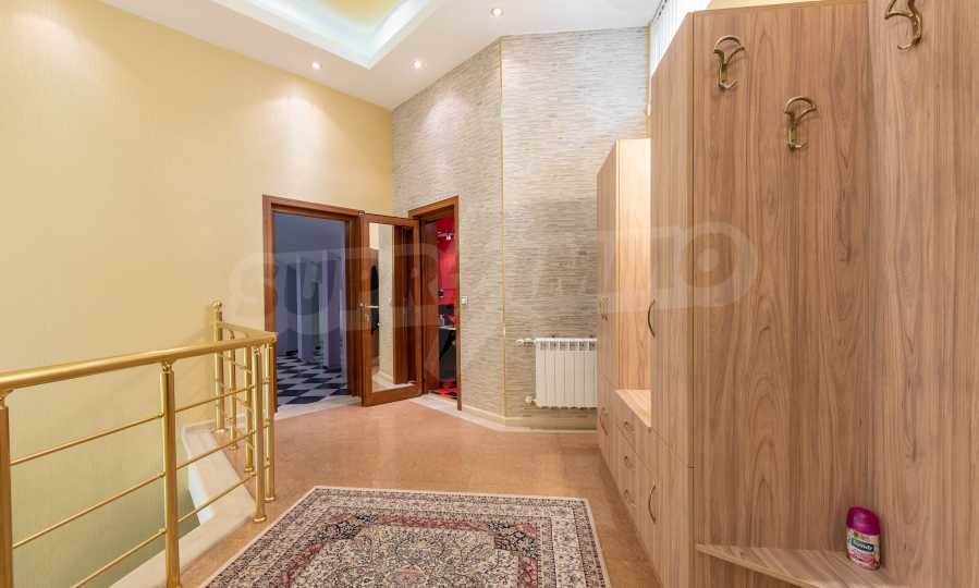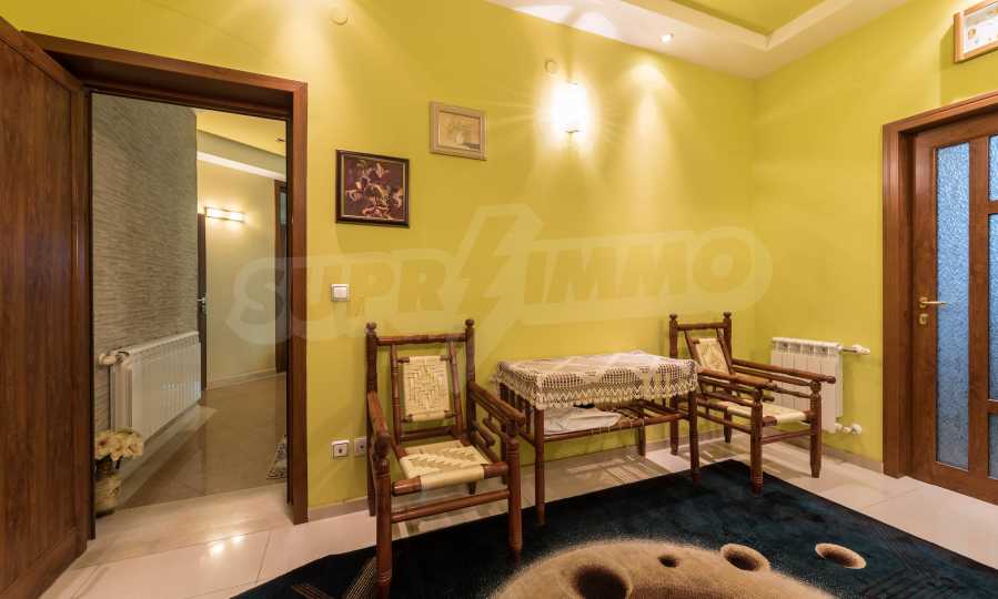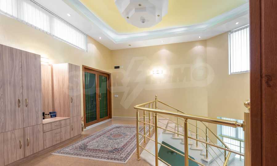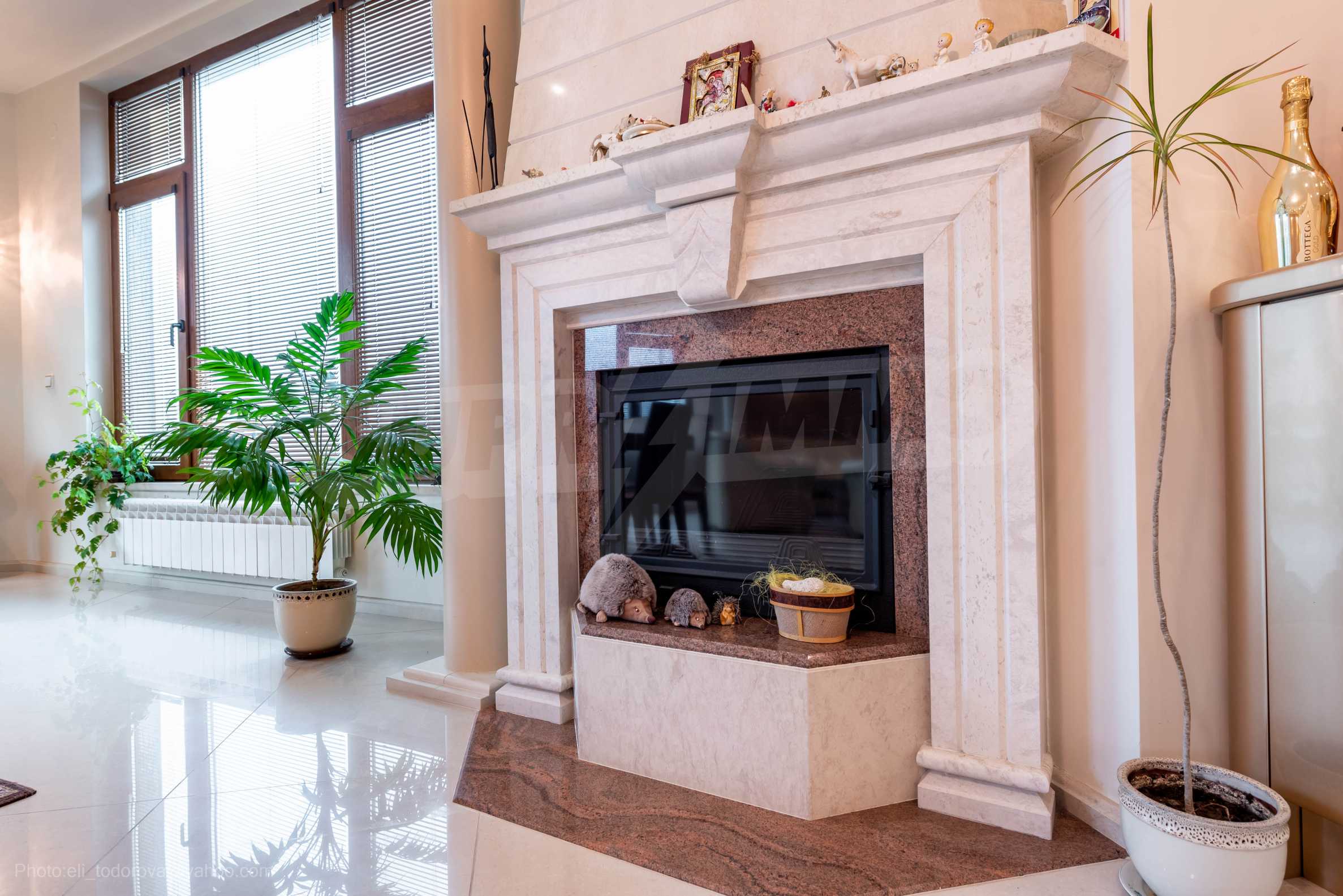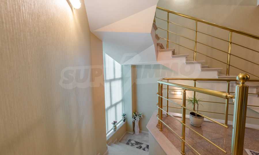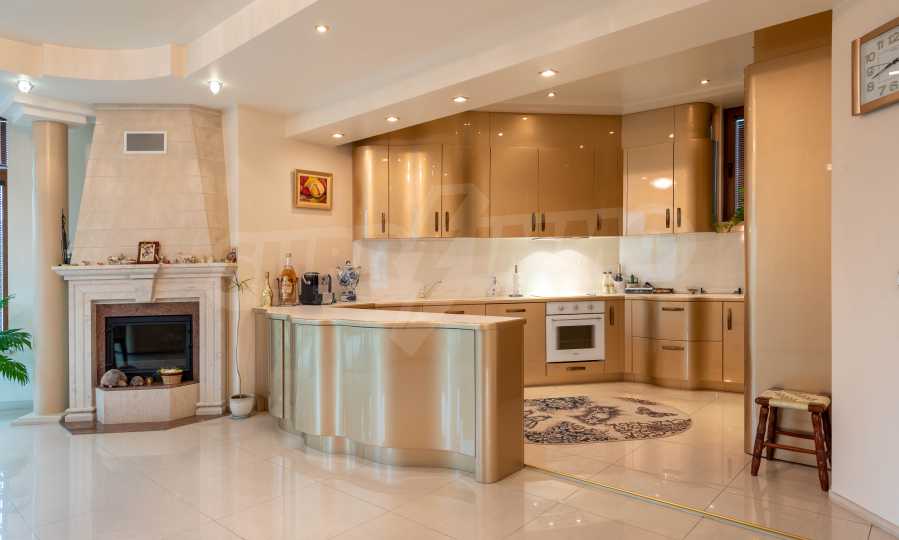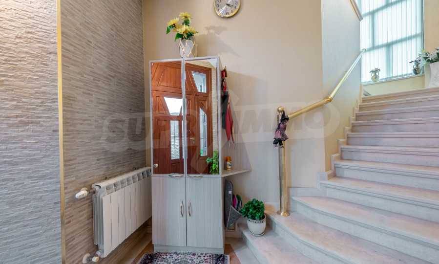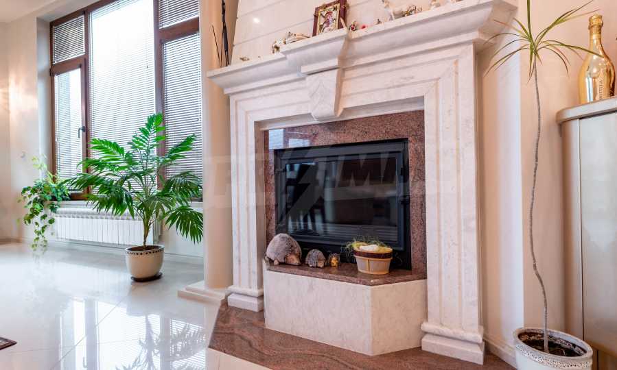 - Втори етаж - всекидневна от впечатляващи 100 кв.м, две спални, тоалетна за гости, коридор, перално помещение, баня/тоалет и вана. Във всекидневната има красива камина с френска камера, поръчкова, голяма кухня с уреди, в отлично състояние.