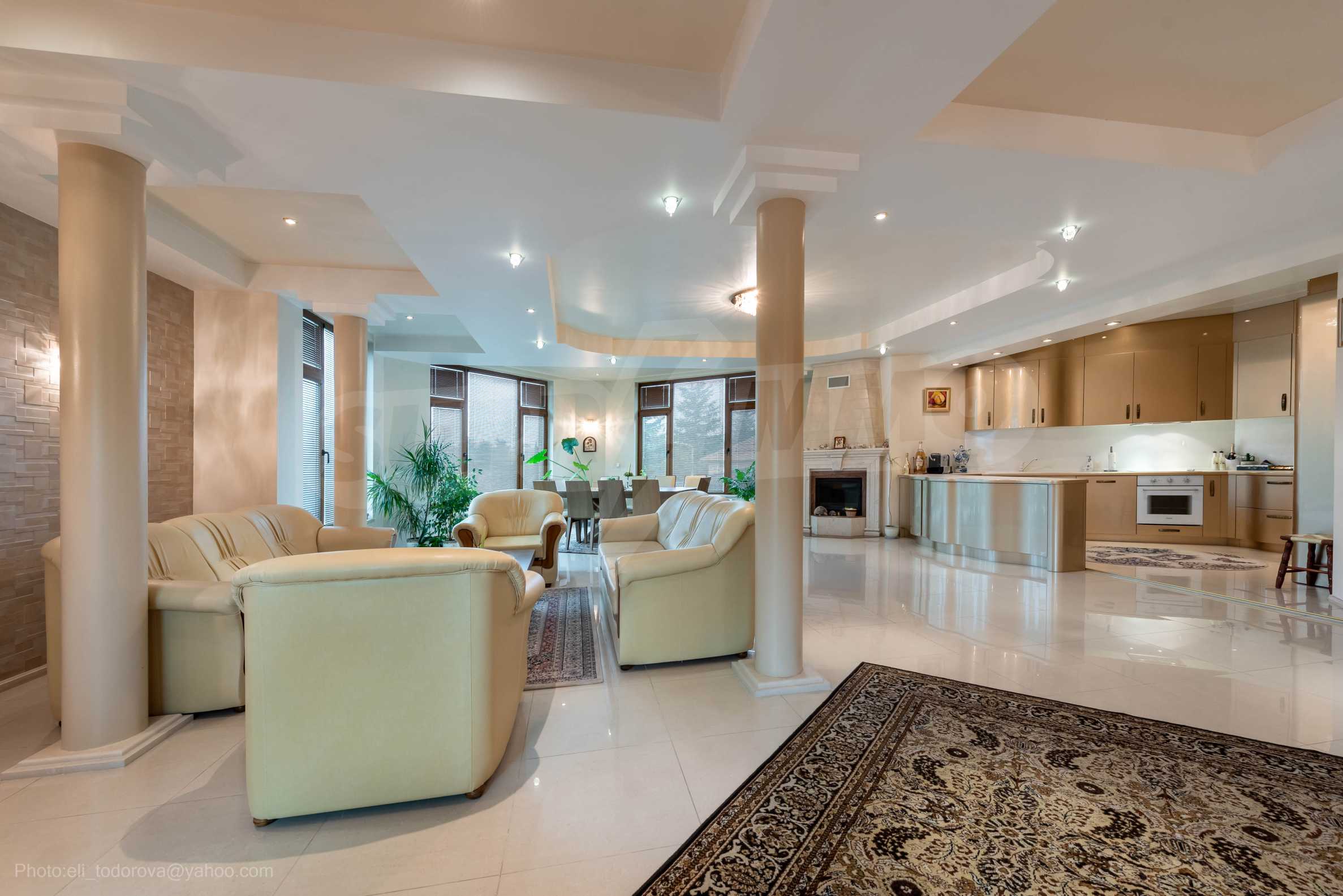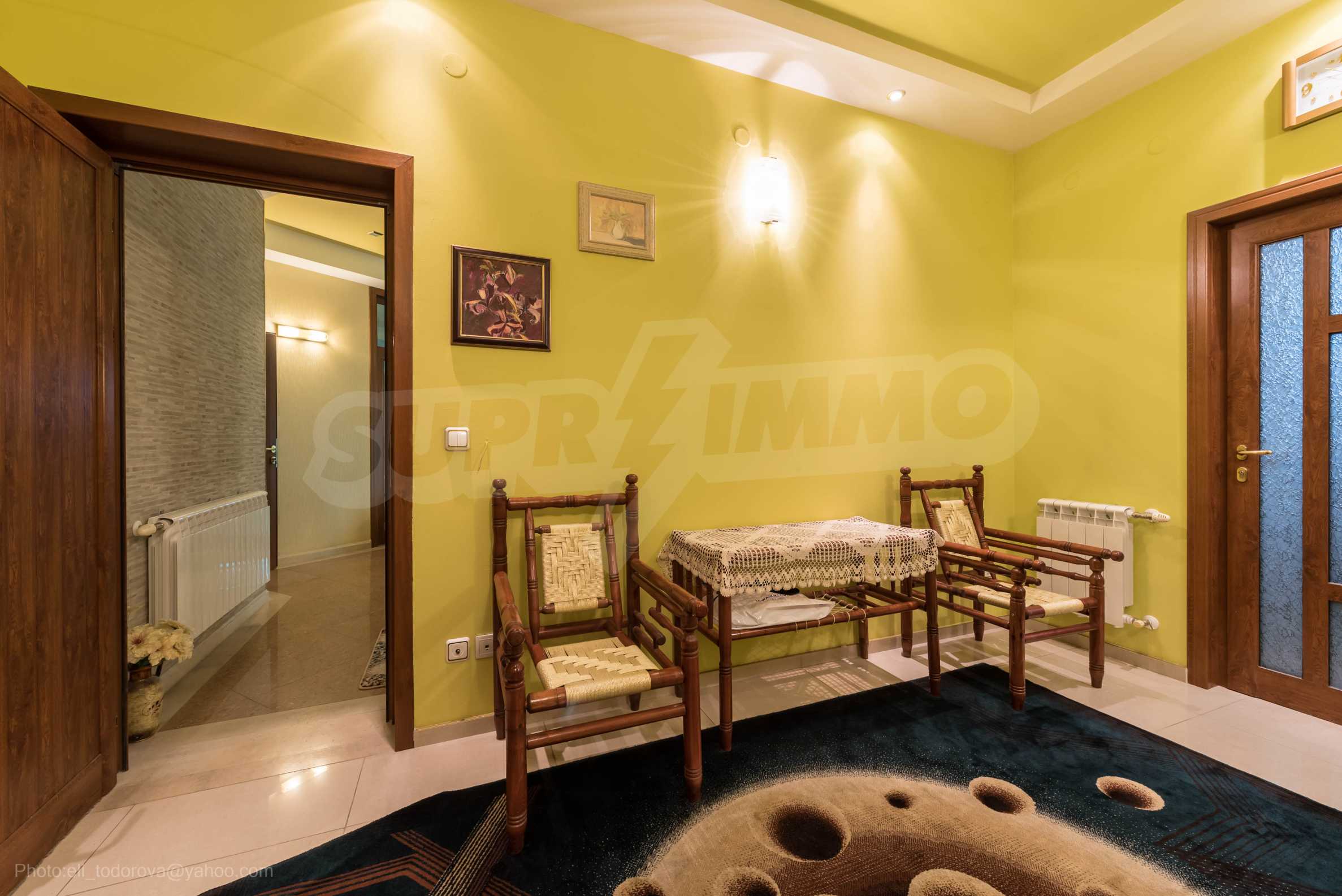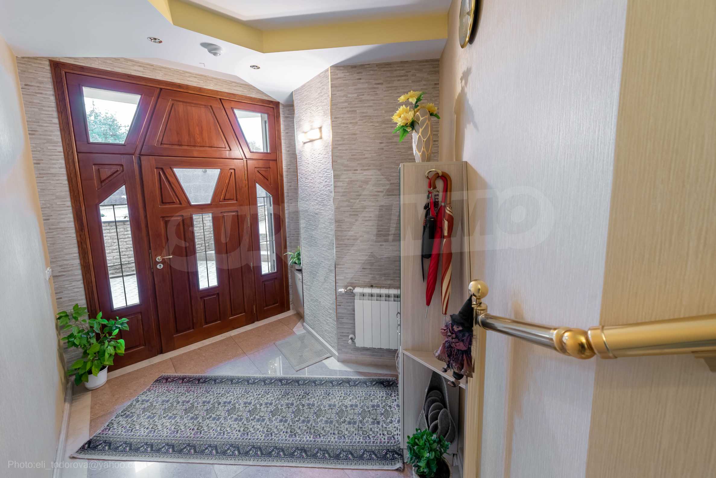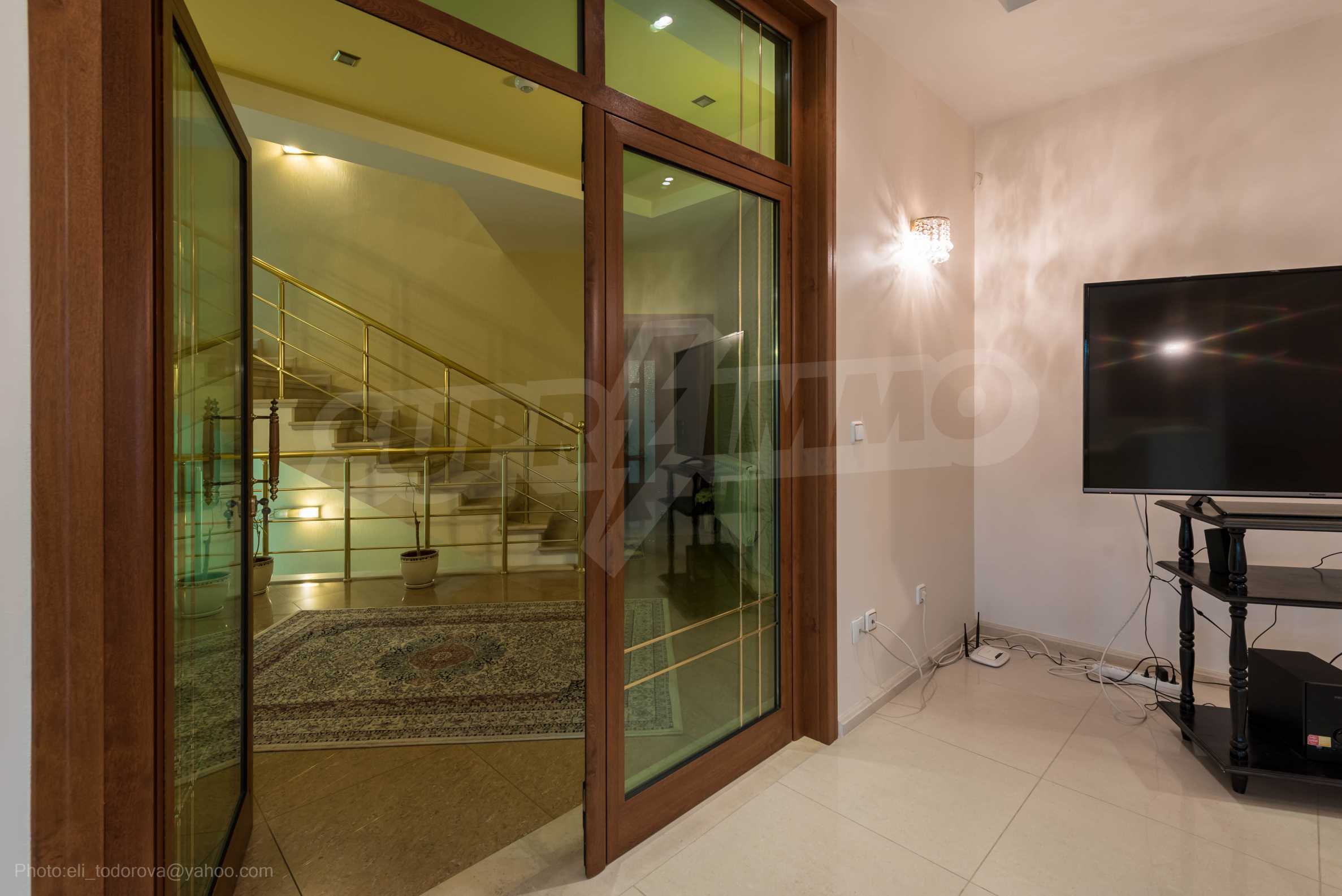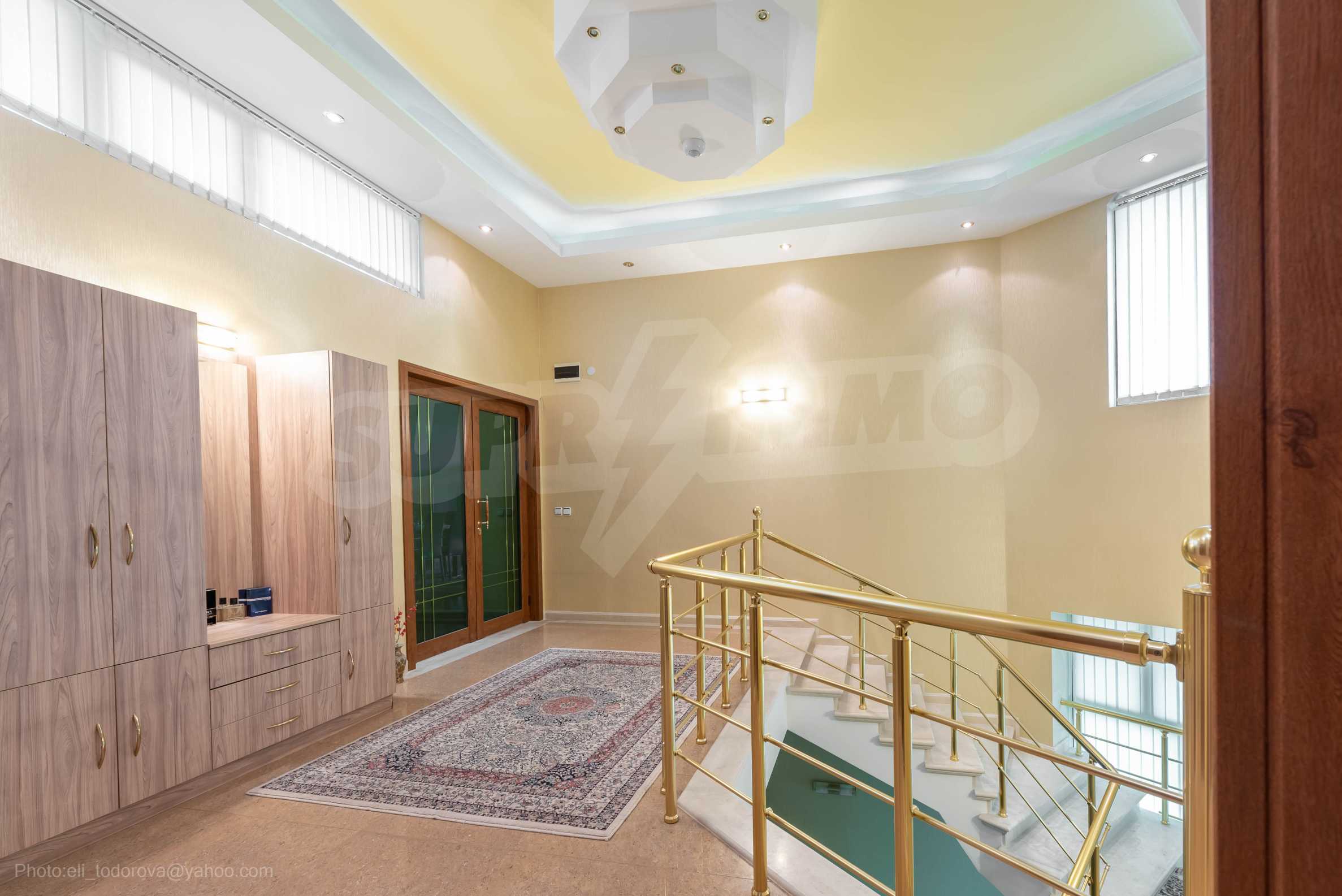 - Втори етаж - всекидневна от впечатляващи 100 кв.м, две спални, тоалетна за гости, коридор, перално помещение, баня/тоалет и вана. Във всекидневната има красива камина с френска камера, поръчкова, голяма кухня с уреди, в отлично състояние.