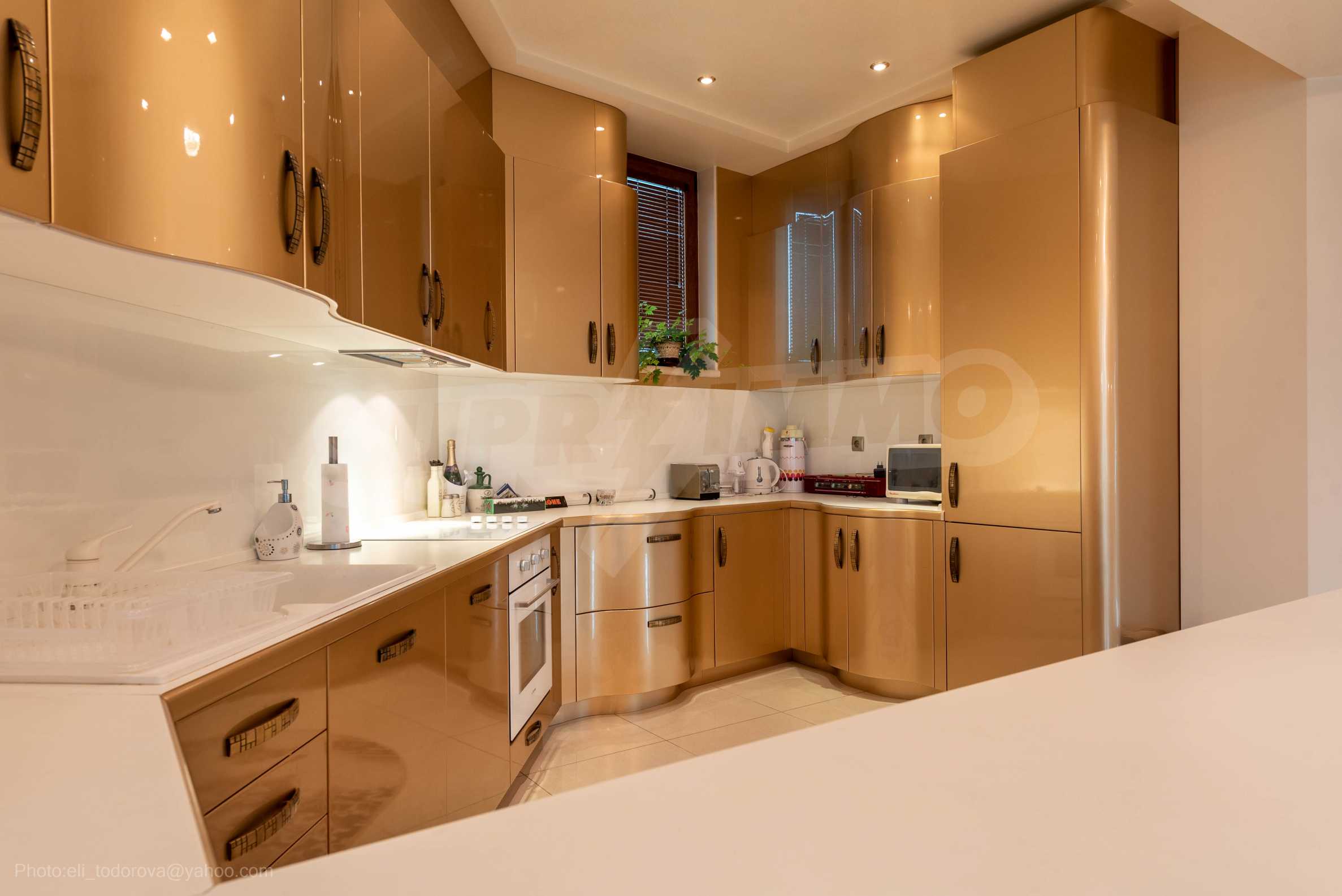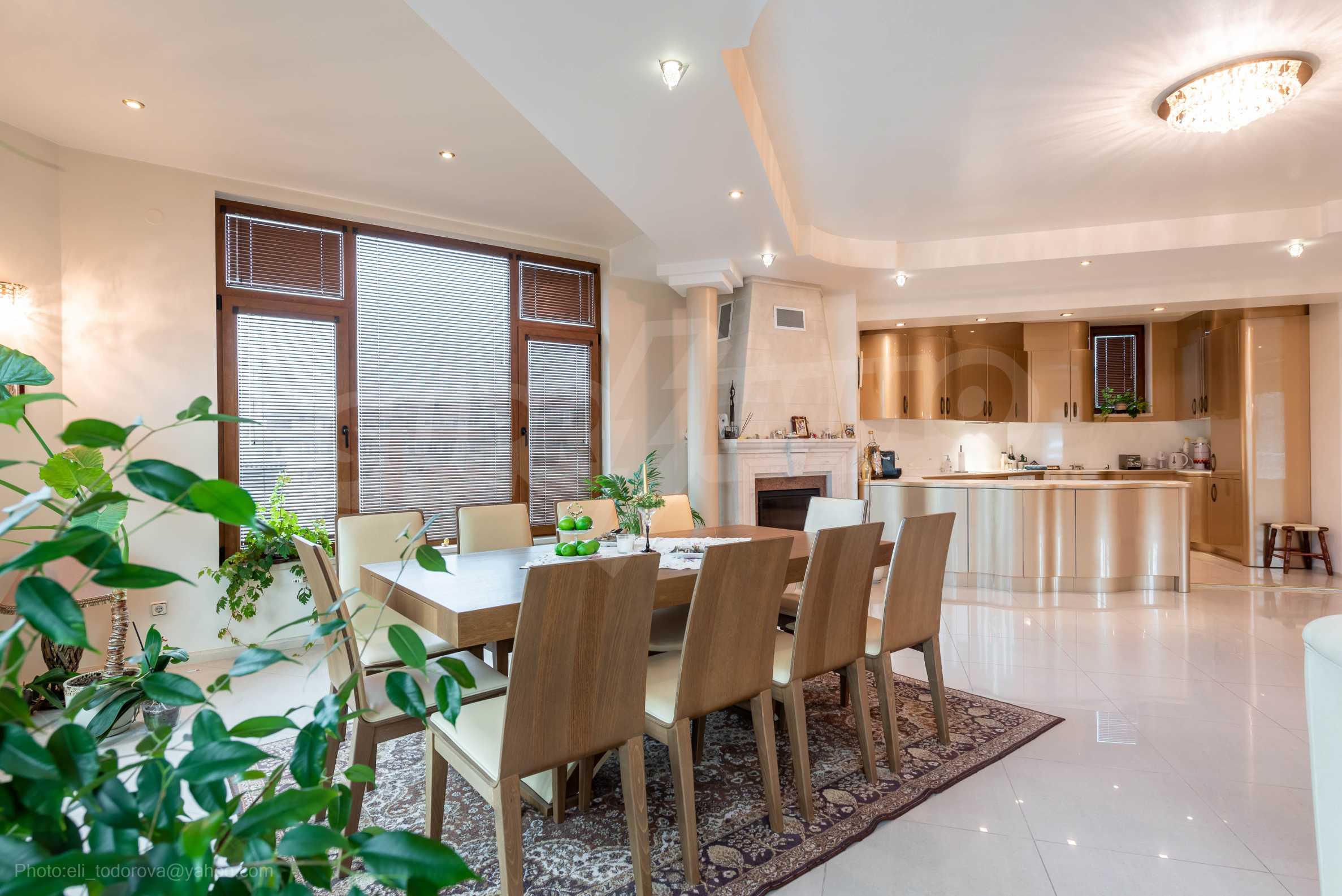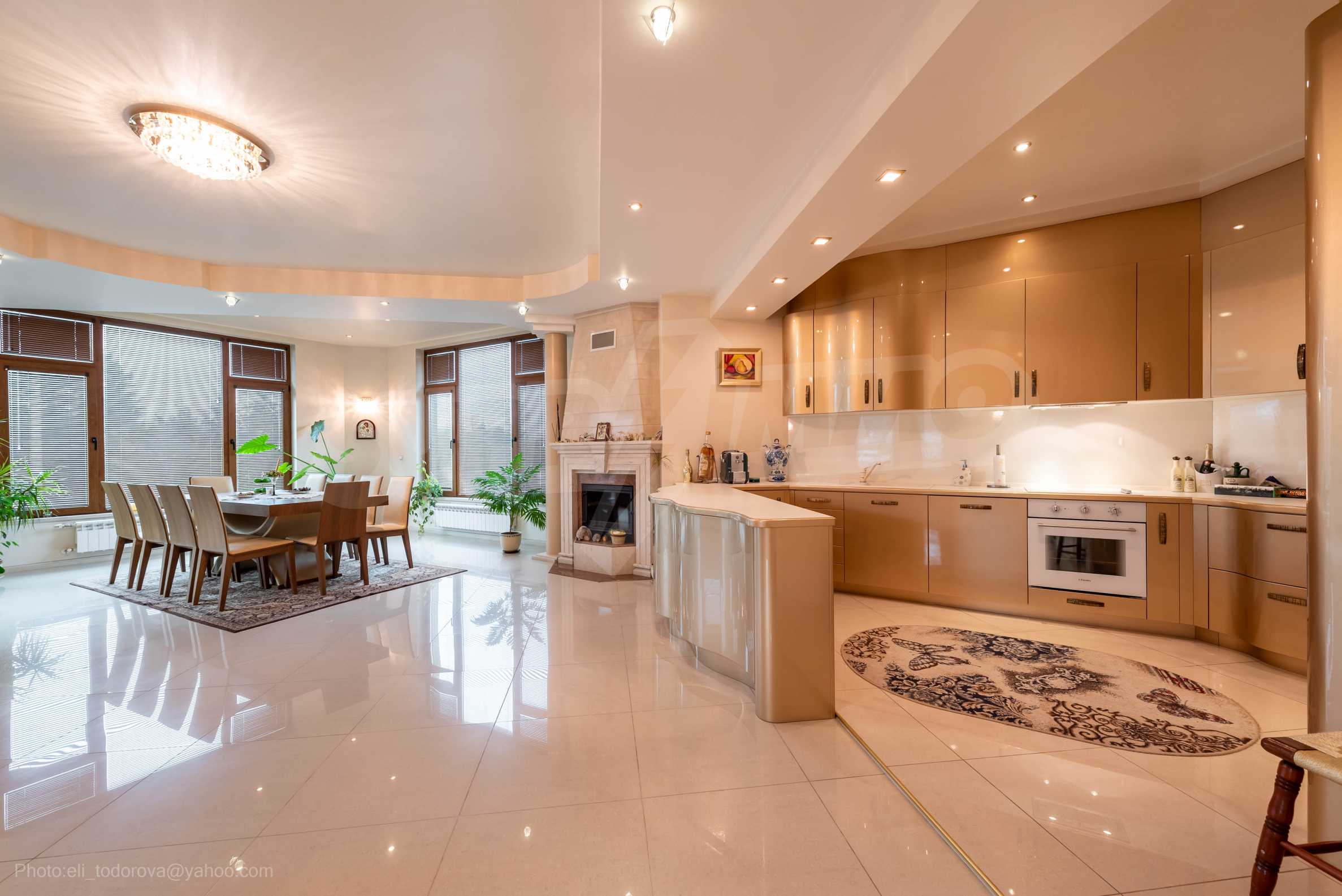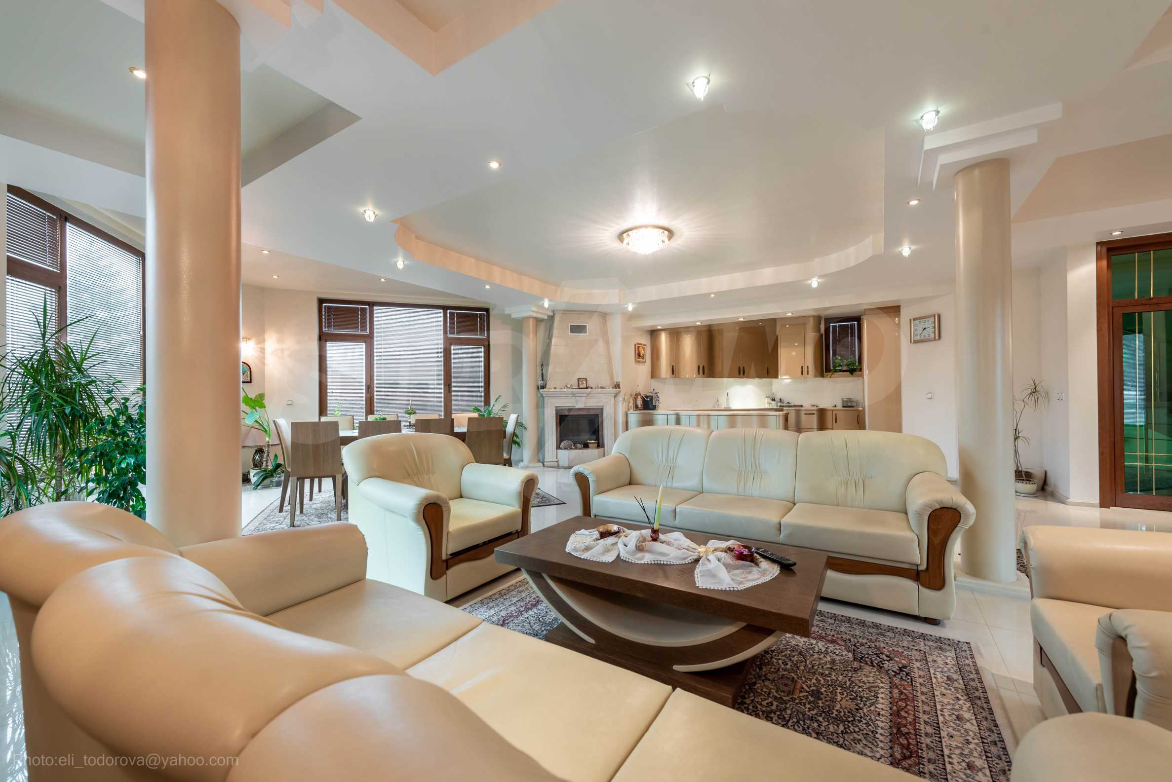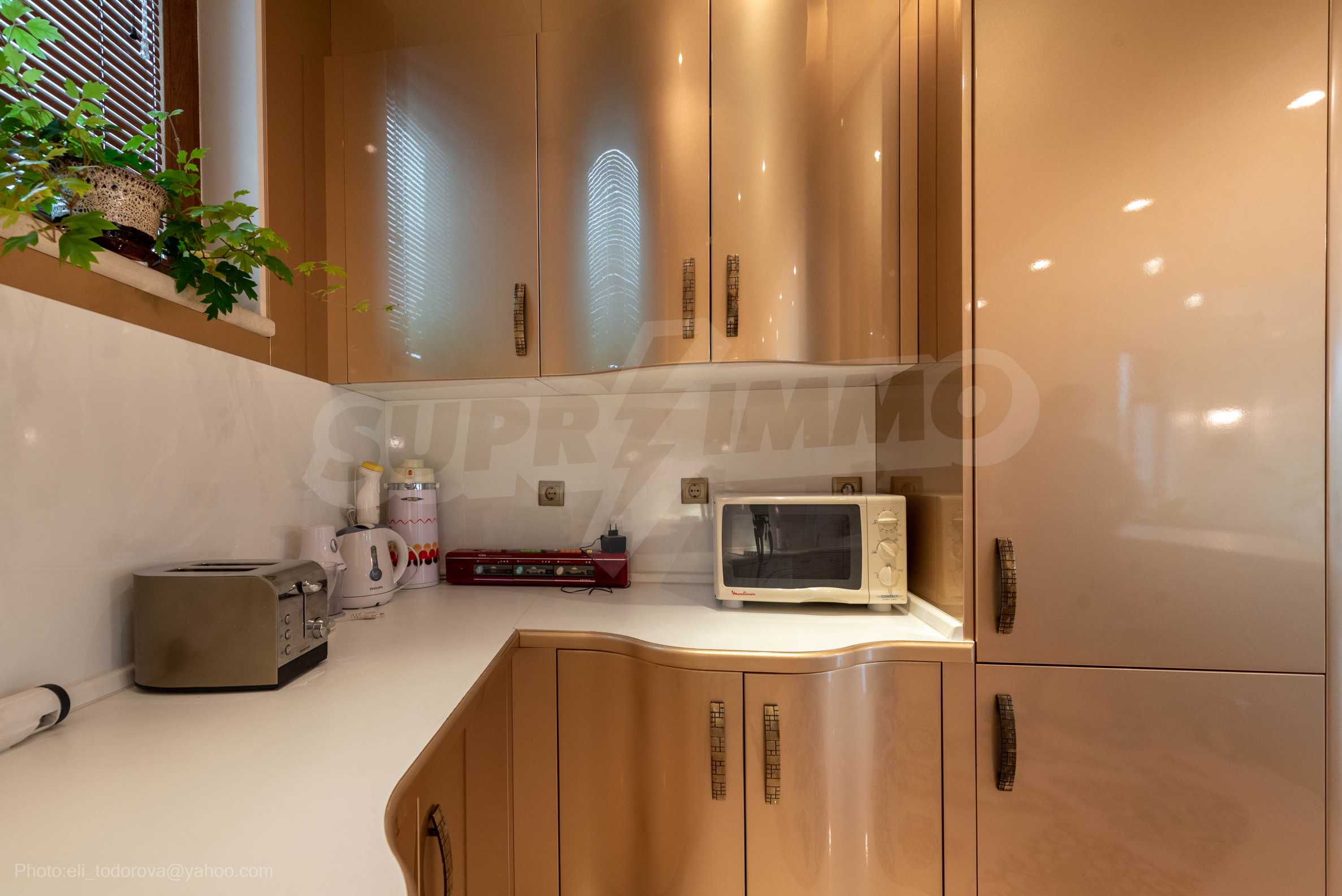 - Втори етаж - всекидневна от впечатляващи 100 кв.м, две спални, тоалетна за гости, коридор, перално помещение, баня/тоалет и вана. Във всекидневната има красива камина с френска камера, поръчкова, голяма кухня с уреди, в отлично състояние.