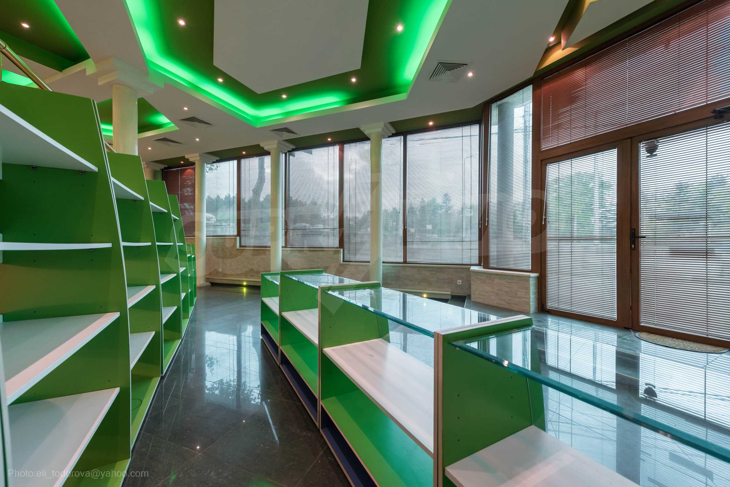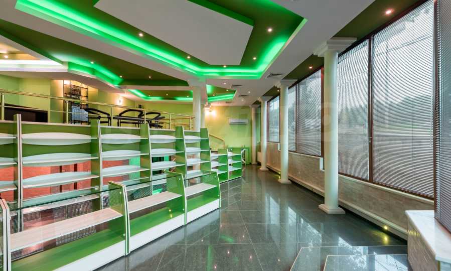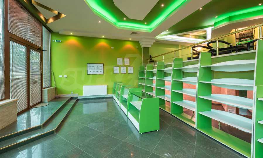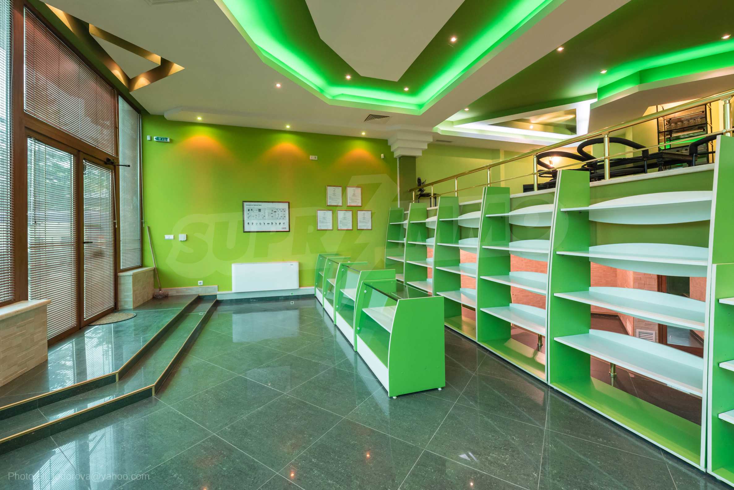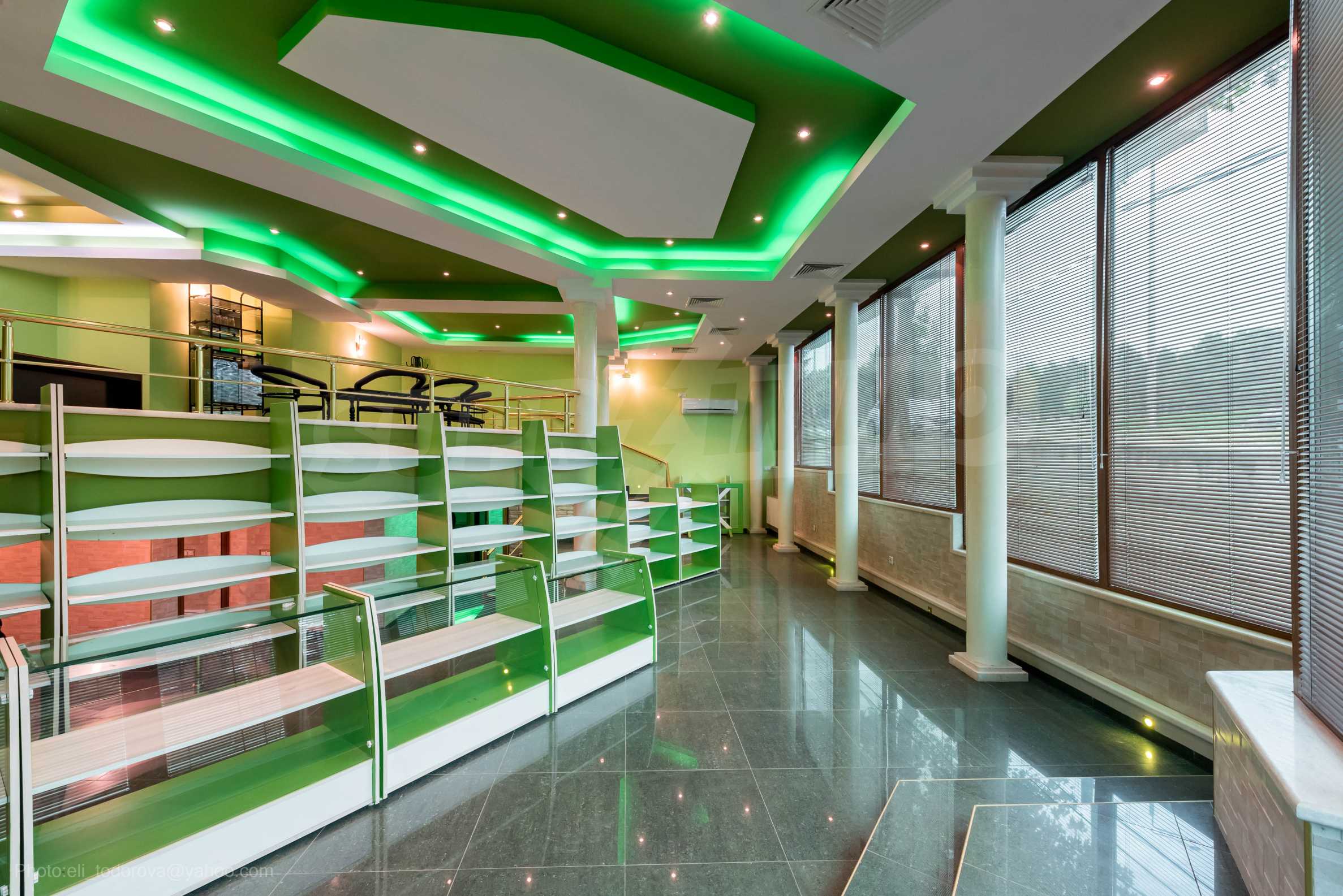 Магазинът е с отделен електромер и трифазен ток, и в момента има наематели. На снимковия материал към офертата, имате възможност да разгледате ефектен модерен интериор, избран за търговското помещение: качествени настилки с плочки, терасирани пространства, вградено осветление в зелен цвят, зелени акценти и в мебелите и стените, просторни делови зони с изобилие от светлина и модерно оборудване, климатизация и вентилация.