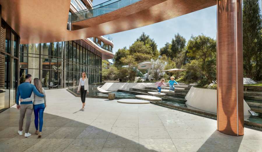 - Футуристичен дизайн, с окачена стъклена фасада, изцяло изпълнена с алуминиеви елементи в цвят розово злато;